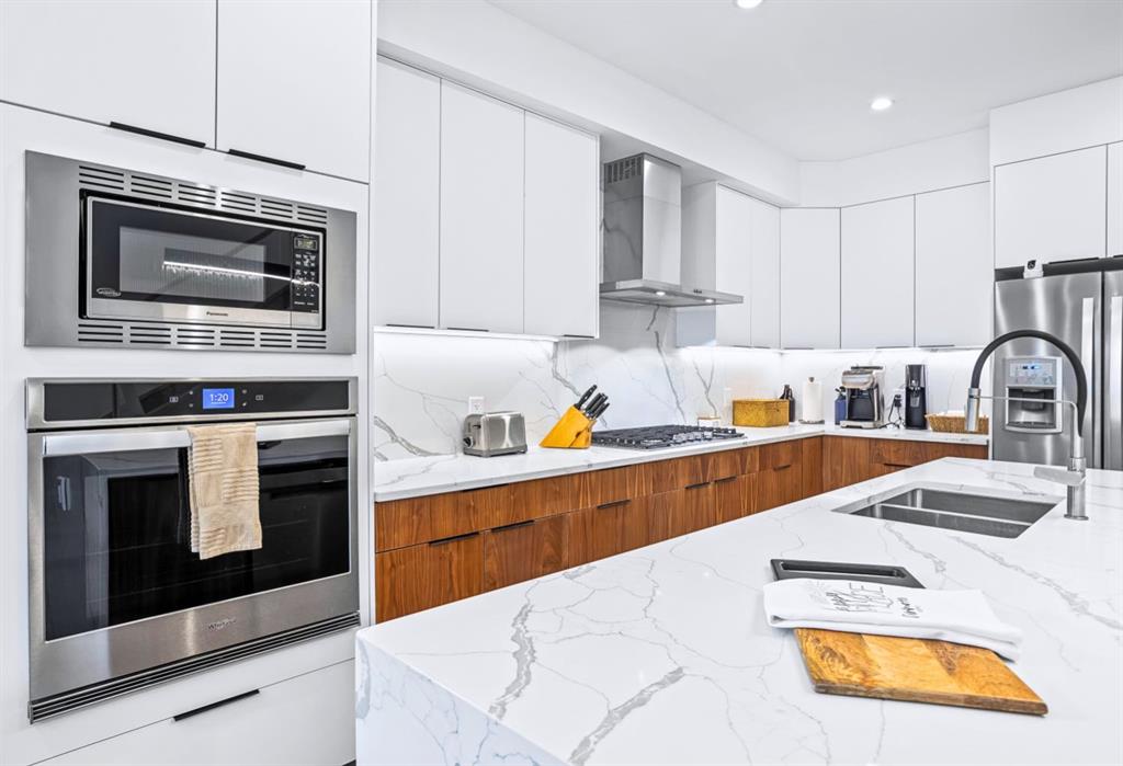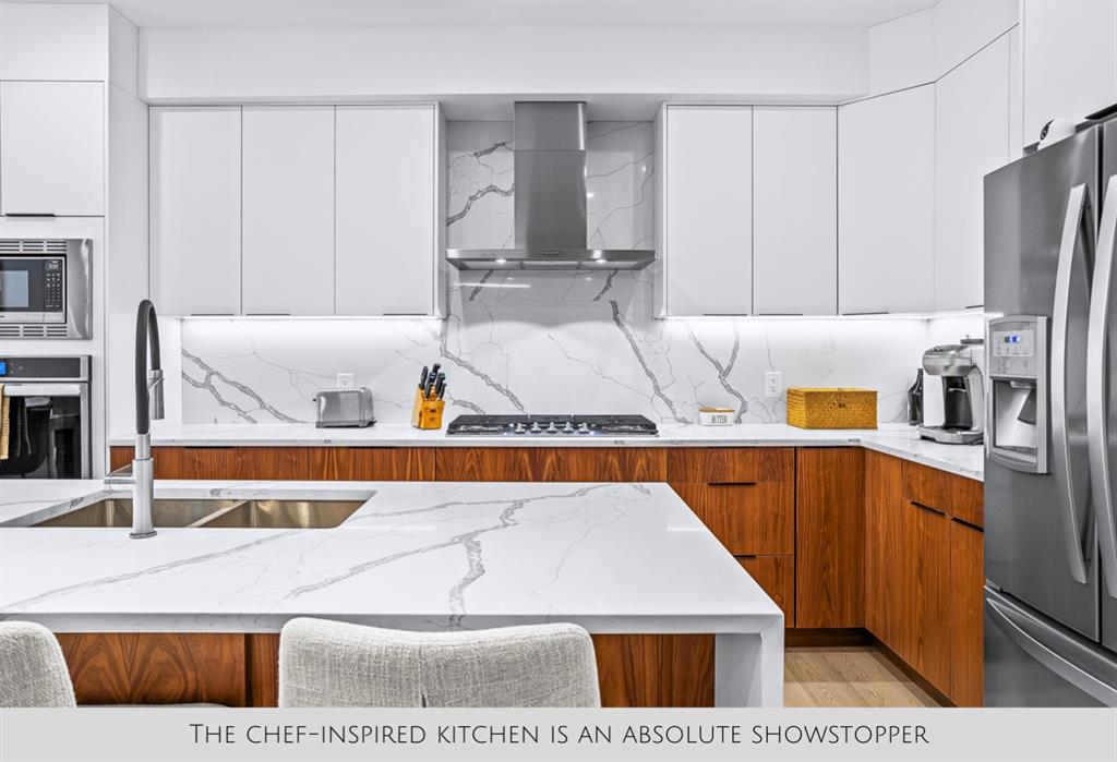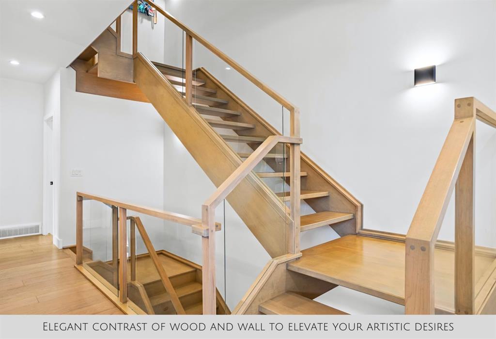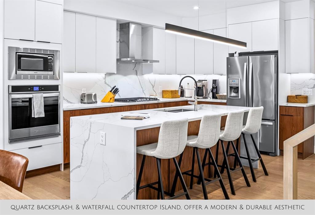 The chef-inspired kitchen is an absolute showstopper, featuring quartz waterfall countertops and a matching quartz backsplash, offering a modern aesthetic and durability. The sleek hardwood floors flow throughout the home, exuding timeless elegance, while the open wood staircase adds a touch of rustic charm.