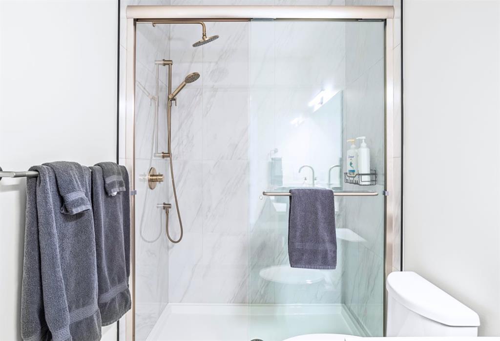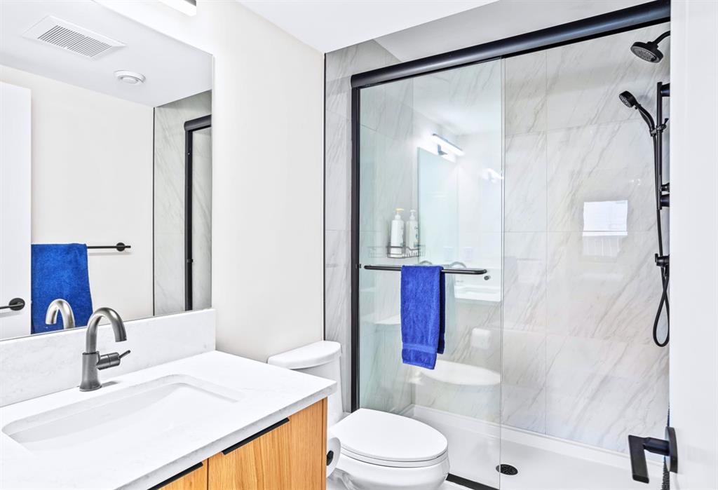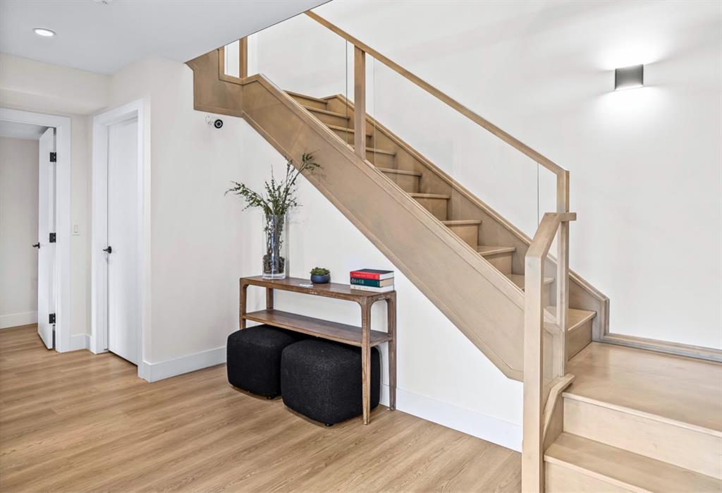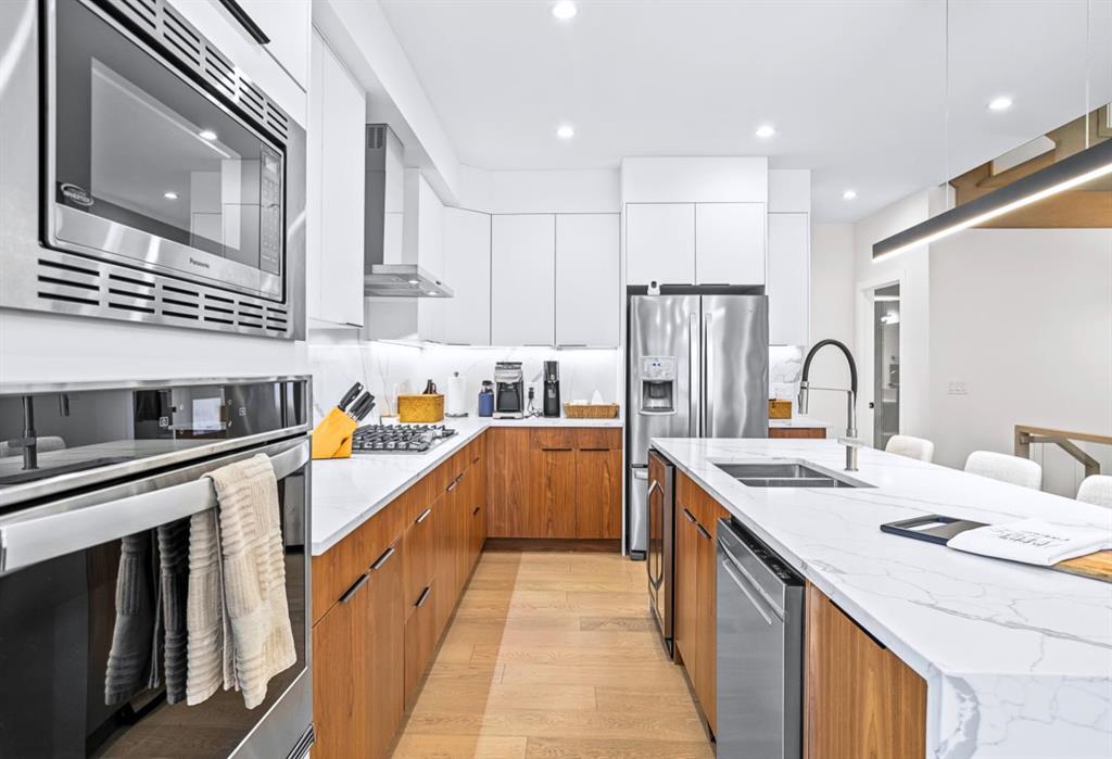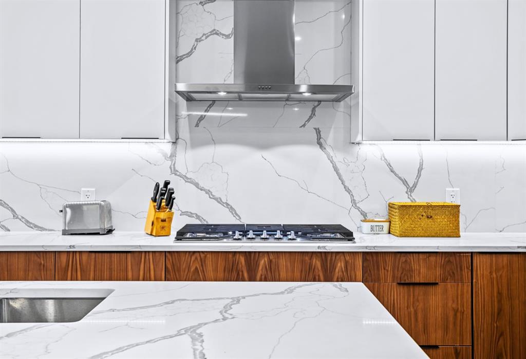The chef-inspired kitchen is an absolute showstopper, featuring quartz waterfall countertops and a matching quartz backsplash, offering a modern aesthetic and durability. The sleek hardwood floors flow throughout the home, exuding timeless elegance, while the open wood staircase adds a touch of rustic charm.