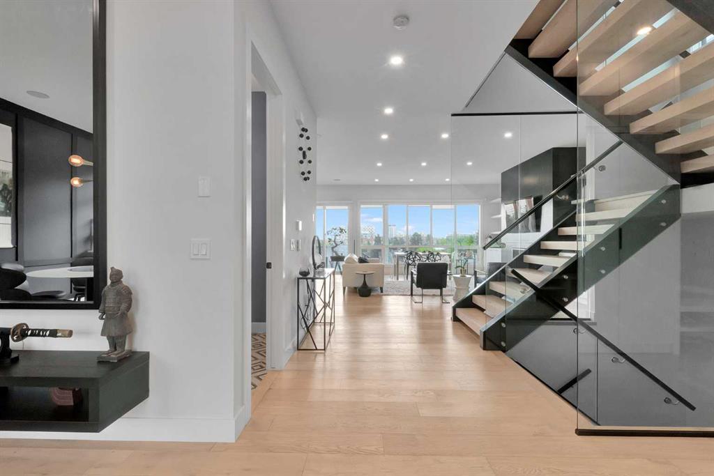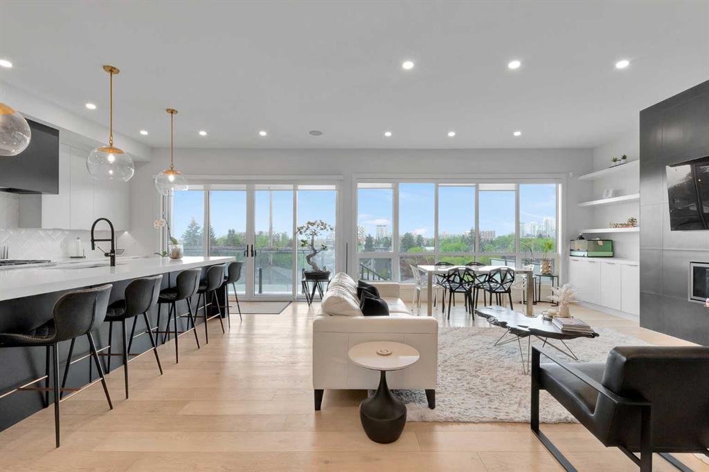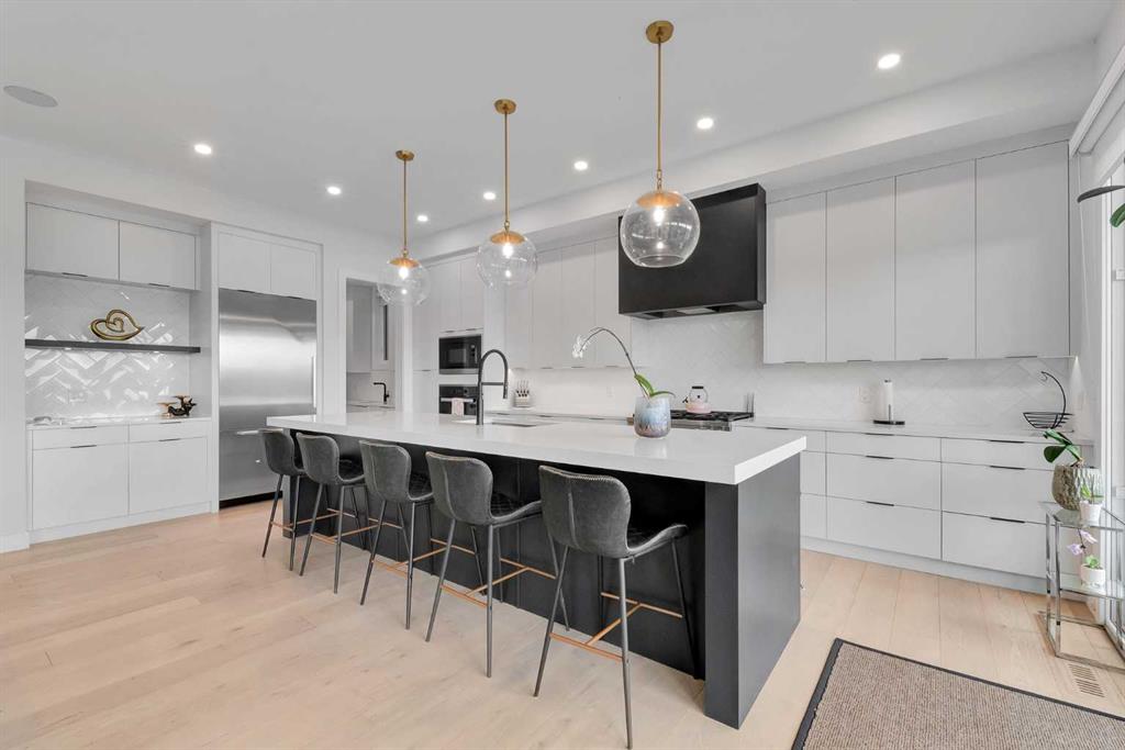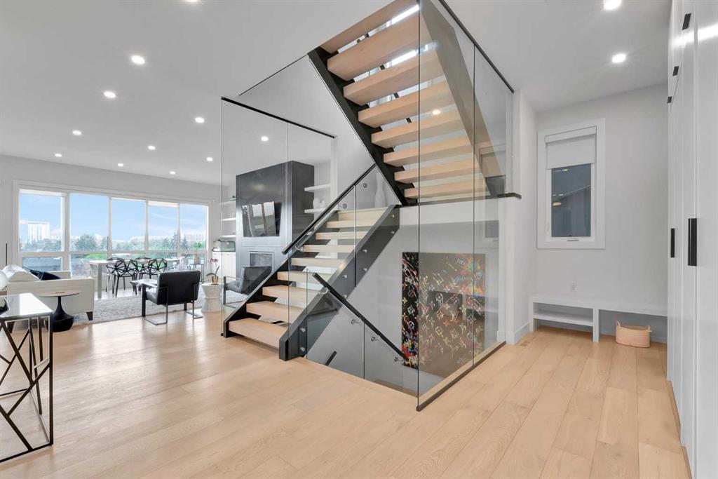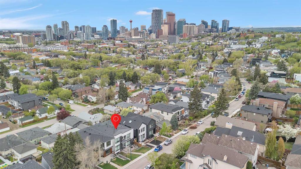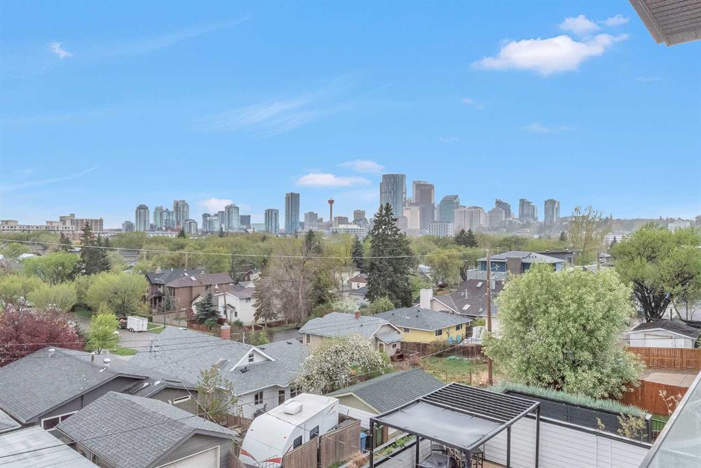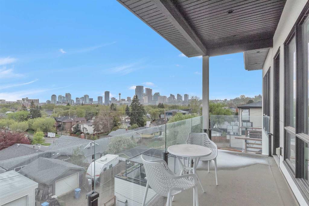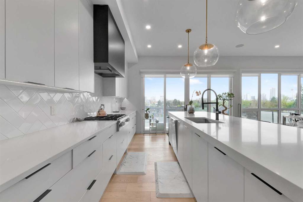 Unbelievable Views and an incredibly rare find in Bridgeland: a HUGE ATTACHED TRIPLE GARAGE! This stunning home showcases an outstanding floor plan with impeccable attention to detail and the finest finishes throughout its spacious layout. Enjoy unobstructed city and mountain panoramas from THREE sunny south-facing decks on a sought-after street. Step into a grand foyer where dramatic high ceilings, rich wide-plank hardwood floors, and expansive glass walls create an immediate sense of light and airiness. The chef's kitchen features top-tier Miele appliances, full-height white cabinets, and a massive 12-foot island. A generous walk-through butler's pantry adds convenience. Designer lighting elevates the space, from the kitchen to the dining room and the striking open-riser staircase with sleek 15mm glass walls. Enjoy a private main-level office space filled with natural light from a generous window. Upstairs, each bedroom offers a full ensuite, and the master suite is a true retreat with breathtaking views, a luxurious five-piece marble ensuite, and a massive custom walk-in closet. The finished basement provides an ideal space for entertaining with a stylish bar, dedicated wine storage, a fourth bedroom, a well-equipped gym, and a spacious recreation room. Enjoy the vibrant Bridgeland lifestyle with easy walking distance to the Zoo, Telus Science Centre, and downtown.