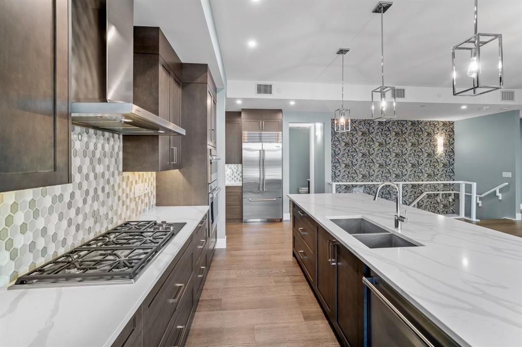 Designed with purpose, the multi-level layout creates natural zones for living, entertaining, and retreat. The main level is devoted to elevated everyday living—anchored by a stunning chef’s kitchen featuring bold cabinetry, a gas cooktop, built-in wall ovens, premium appliances, and curated designer finishes. Expansive walls of glass flood the open-concept living and dining areas with natural light, while the lake becomes a living backdrop for hosting, relaxing, and gathering.