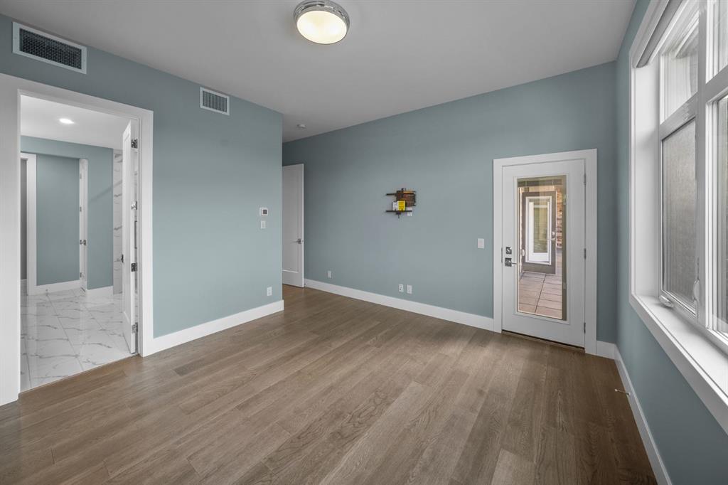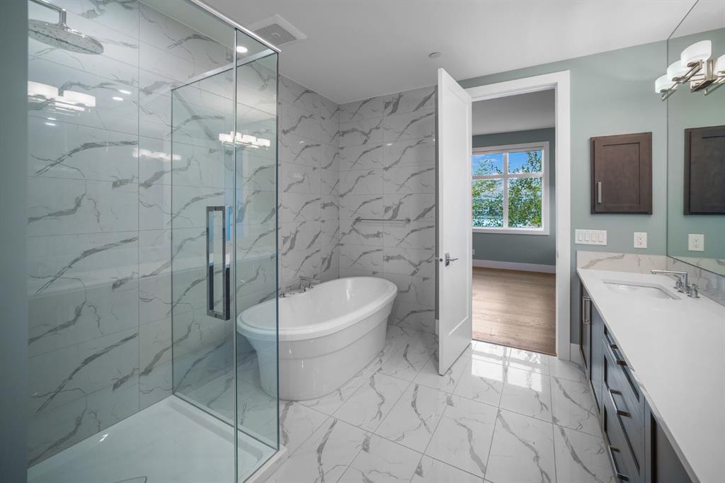The primary suite is intentionally positioned for privacy, offering a true retreat away from the main living spaces. Here, direct balcony access and a spa-inspired five-piece ensuite—complete with a deep soaker tub, dual vanities, walk-in shower, and refined detailing—create a sanctuary designed for rest and rejuvenation.