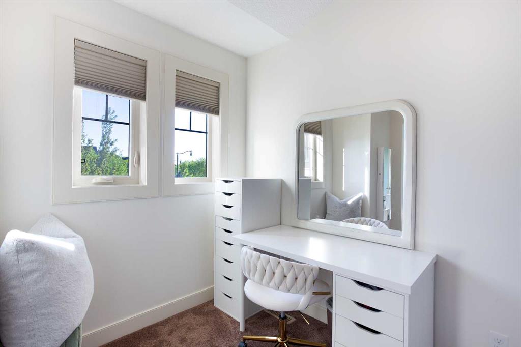 Upstairs, the spacious primary suite offers a true retreat experience with a spa-inspired 5-piece ensuite, a walk-through closet with custom built-ins, and direct access to the upper laundry room. You’ll also find three additional generously sized bedrooms and a 4-piece bathroom with heated tile floors.