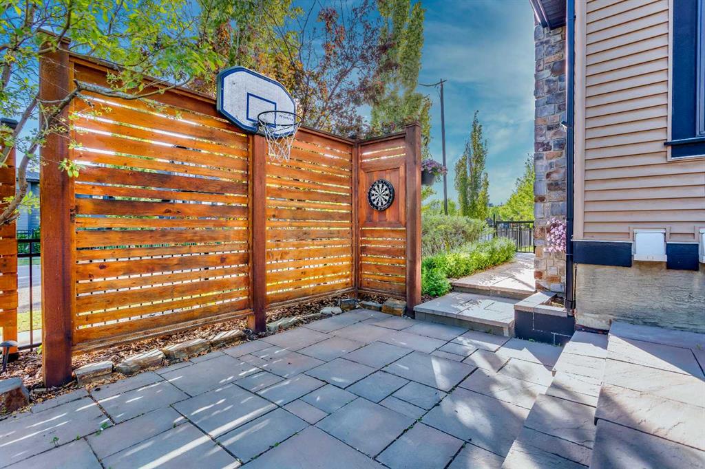 Enjoy your low-maintenance backyard oasis with composite decking, custom stone patio, underground sprinklers, and a convenient walk-through shed for storage and rear access.