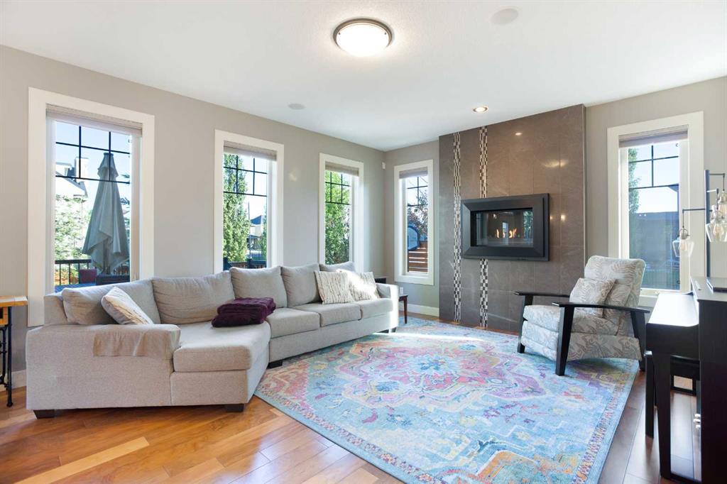 Step inside to discover Brazilian mahogany hardwood floors, 9’ ceilings, and built-in ceiling speakers with zone control throughout the main level. The bright and open floor plan features a cozy living room with a gas fireplace, a private front office, and a powder room.