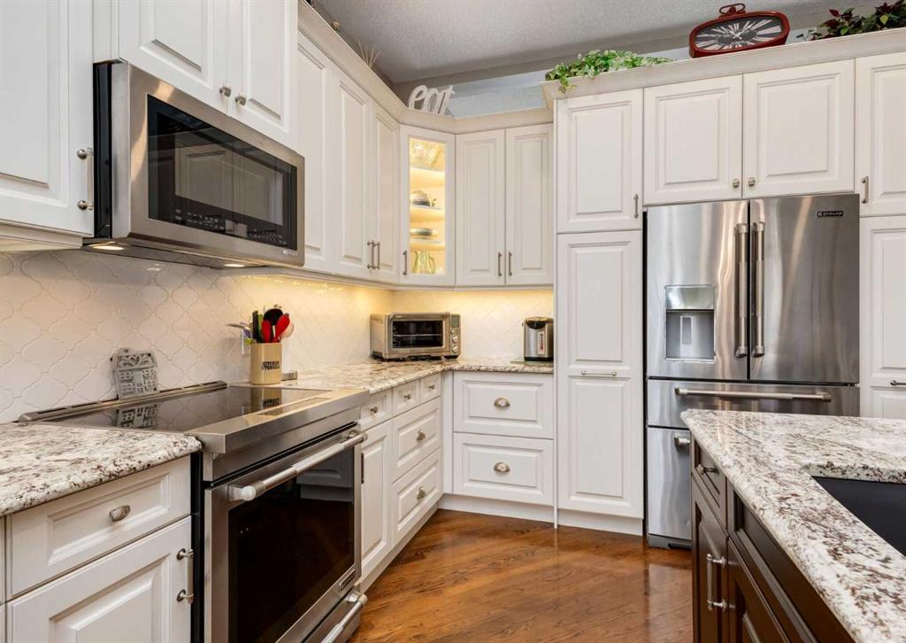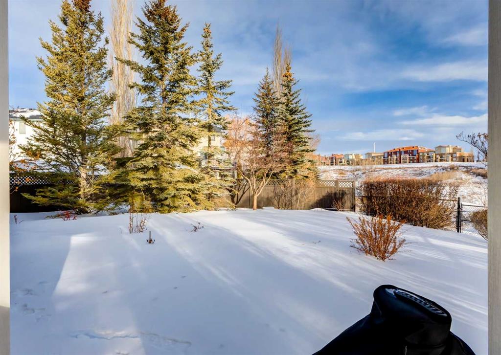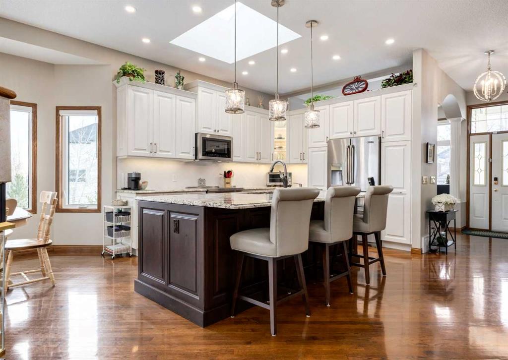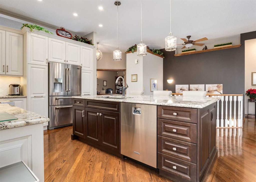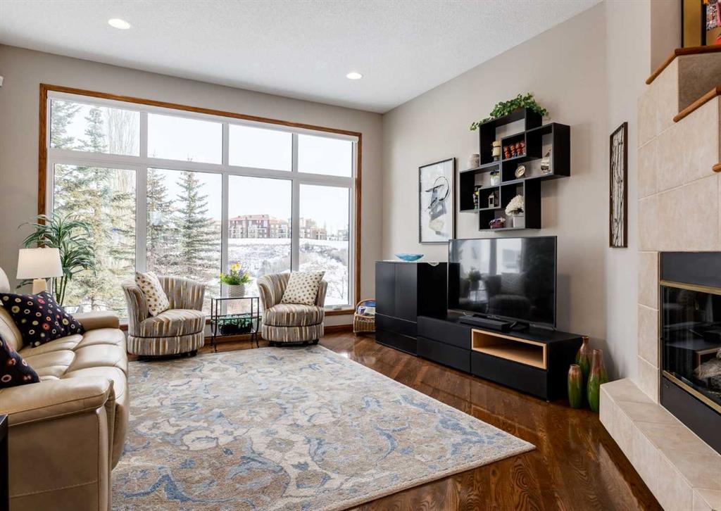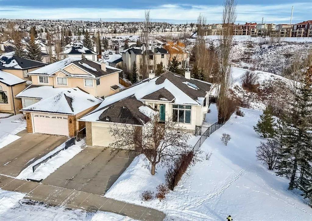 Nestled in the highly sought-after community of Tuscany in Northwest Calgary, this exceptional walkout bungalow presents a rare and unique opportunity to own a home siding/backing directly onto a serene green space and ravine. Meticulously maintained by the original owners, this home exudes pride of ownership from the moment you arrive. Step inside to be greeted by soaring 10' ceilings on the main floor, timeless solid red oak hardwood flooring, and an abundance of natural light flooding through large windows and a skylight. A front den with elegant French doors provides the perfect home office or flex space and the formal dining room features a huge southwest-facing window. The heart of the home is the beautifully updated kitchen by Legacy Kitchens, boasting granite countertops, soft-close dovetail maple drawers, and premium Jenn-Air stainless steel appliances—including an induction stove and convection microwave hood fan. The adjacent breakfast nook overlooks the ravine and pathway system, where wildlife sightings are common. Flow seamlessly into the spacious living room, centered around a stunning three-sided fireplace. Step out to the maintenance-free composite deck with glass railings, complete with a BBQ gas line for effortless outdoor entertaining. The primary bedroom retreat offers updated tile flooring, a luxurious jetted tub, separate shower, and a generous walk-in closet with built in organizers. The 1/2 bath and convenient laundry/mudroom featuring a sink has direct access to the double attached garage and completes the main floor. The fully finished walkout lower level is where you'll find a bright family/media room, a built-in bar with microwave, two additional bedrooms, and a full bathroom—perfect for guests or extended family. There is plenty of storage in the utility/mechanical room. Outside the established yard enhances the peaceful setting, while the side-onto ravine location invites abundant wildlife—spot deer, moose, and more—right from your windows and outdoor spaces. Modern comforts/updates include central air conditioning, powered blinds, an on-demand tankless water heater, water softener, HRV system and majority of windows on the main floor have been updated with Lux Vinyl windows. In the heart of Tuscany—with its extensive pathway network connecting to the 170-acre ravine system, excellent schools, LRT access, and the exclusive Tuscany Club—this home combines luxury, nature, and convenience in one extraordinary package. Properties like this are exceedingly hard to find, offering unparalleled privacy, tranquility, and a front-row seat to nature's beauty. Don't miss this truly rare gem. Click on media for the video and book your private showing today!
