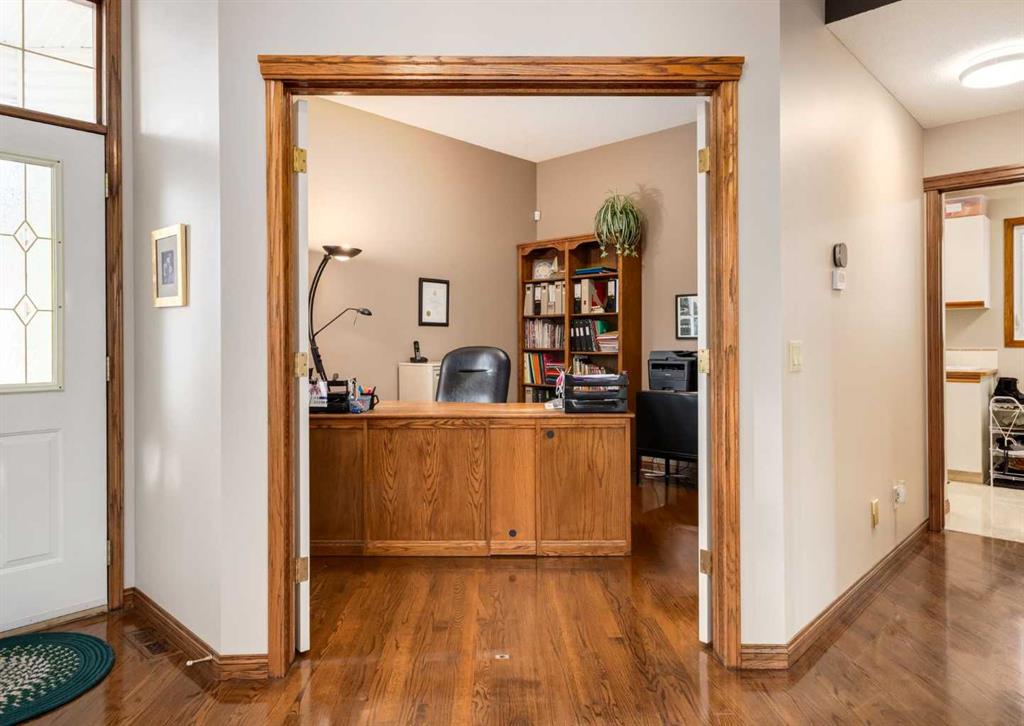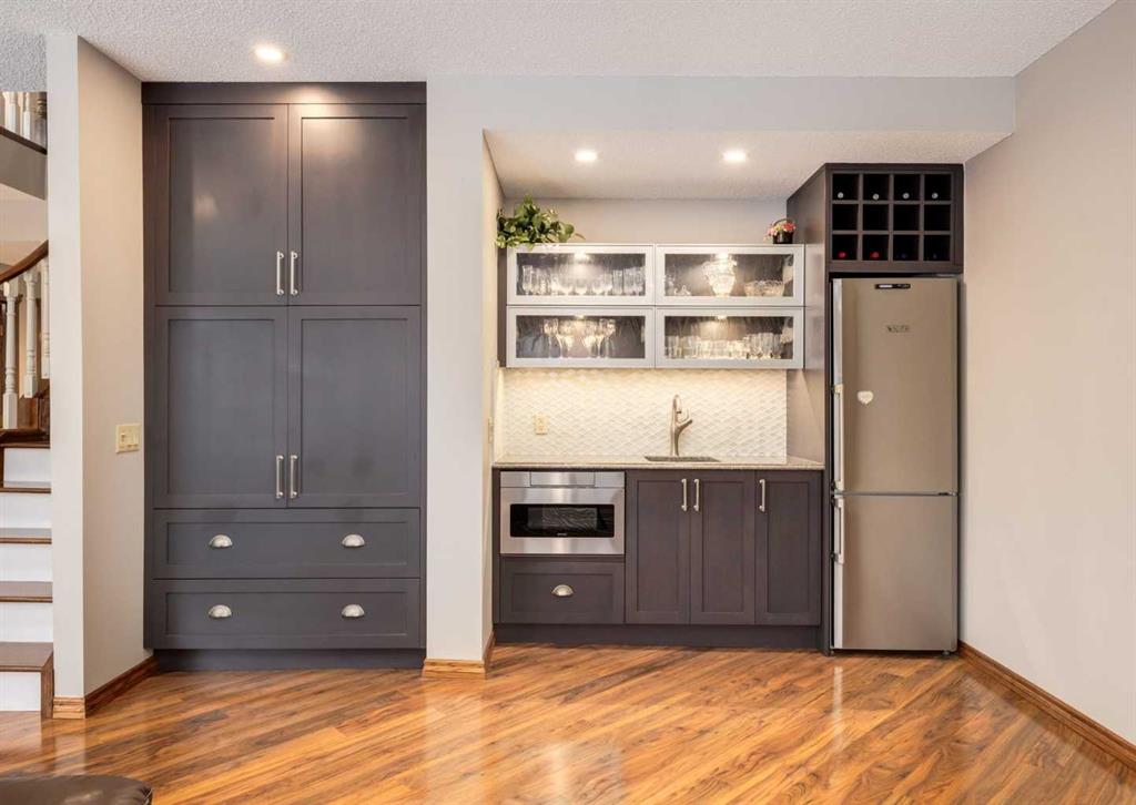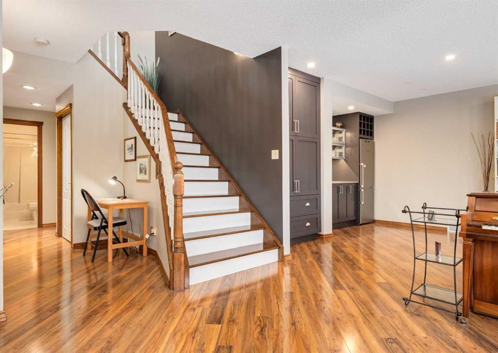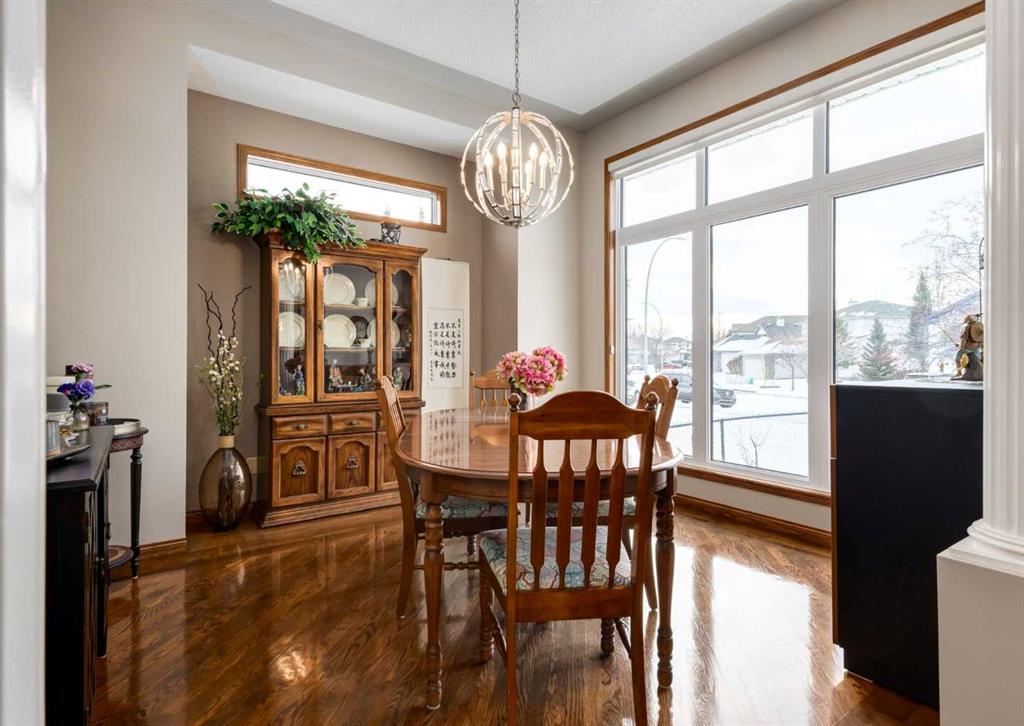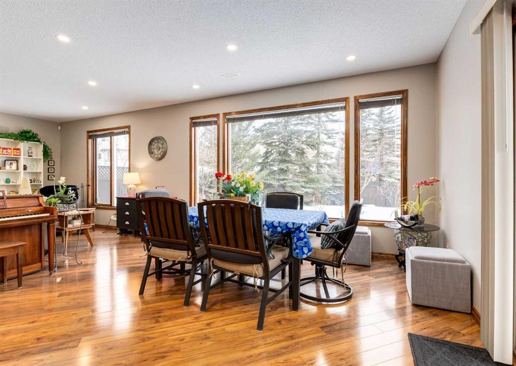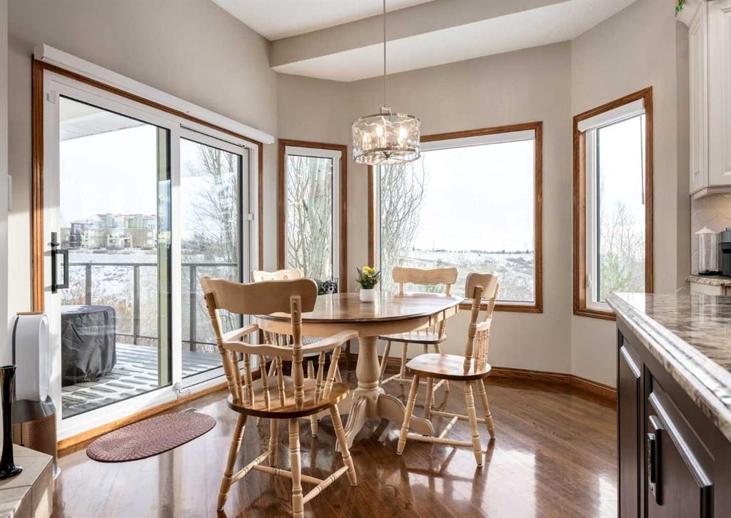 Nestled in the highly sought-after community of Tuscany in Northwest Calgary, this exceptional walkout bungalow presents a rare and unique opportunity to own a home siding/backing directly onto a serene green space and ravine. Meticulously maintained by the original owners, this home exudes pride of ownership from the moment you arrive. Step inside to be greeted by soaring 10' ceilings on the main floor, timeless solid red oak hardwood flooring, and an abundance of natural light flooding through large windows and a skylight. A front den with elegant French doors provides the perfect home office or flex space and the formal dining room features a huge southwest-facing window. The heart of the home is the beautifully updated kitchen by Legacy Kitchens, boasting granite countertops, soft-close dovetail maple drawers, and premium Jenn-Air stainless steel appliances—including an induction stove and convection microwave hood fan. The adjacent breakfast nook overlooks the ravine and pathway system, where wildlife sightings are common. Flow seamlessly into the spacious living room, centered around a stunning three-sided fireplace. Step out to the maintenance-free composite deck with glass railings, complete with a BBQ gas line for effortless outdoor entertaining. The primary bedroom retreat offers updated tile flooring, a luxurious jetted tub, separate shower, and a generous walk-in closet with built in organizers. The 1/2 bath and convenient laundry/mudroom featuring a sink has direct access to the double attached garage and completes the main floor. The fully finished walkout lower level is where you'll find a bright family/media room, a built-in bar with microwave, two additional bedrooms, and a full bathroom—perfect for guests or extended family. There is plenty of storage in the utility/mechanical room. Outside the established yard enhances the peaceful setting, while the side-onto ravine location invites abundant wildlife—spot deer, moose, and more—right from your windows and outdoor spaces. Modern comforts/updates include central air conditioning, powered blinds, an on-demand tankless water heater, water softener, HRV system and majority of windows on the main floor have been updated with Lux Vinyl windows. In the heart of Tuscany—with its extensive pathway network connecting to the 170-acre ravine system, excellent schools, LRT access, and the exclusive Tuscany Club—this home combines luxury, nature, and convenience in one extraordinary package. Properties like this are exceedingly hard to find, offering unparalleled privacy, tranquility, and a front-row seat to nature's beauty. Don't miss this truly rare gem. Click on media for the video and book your private showing today!