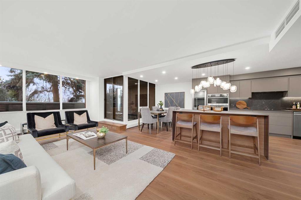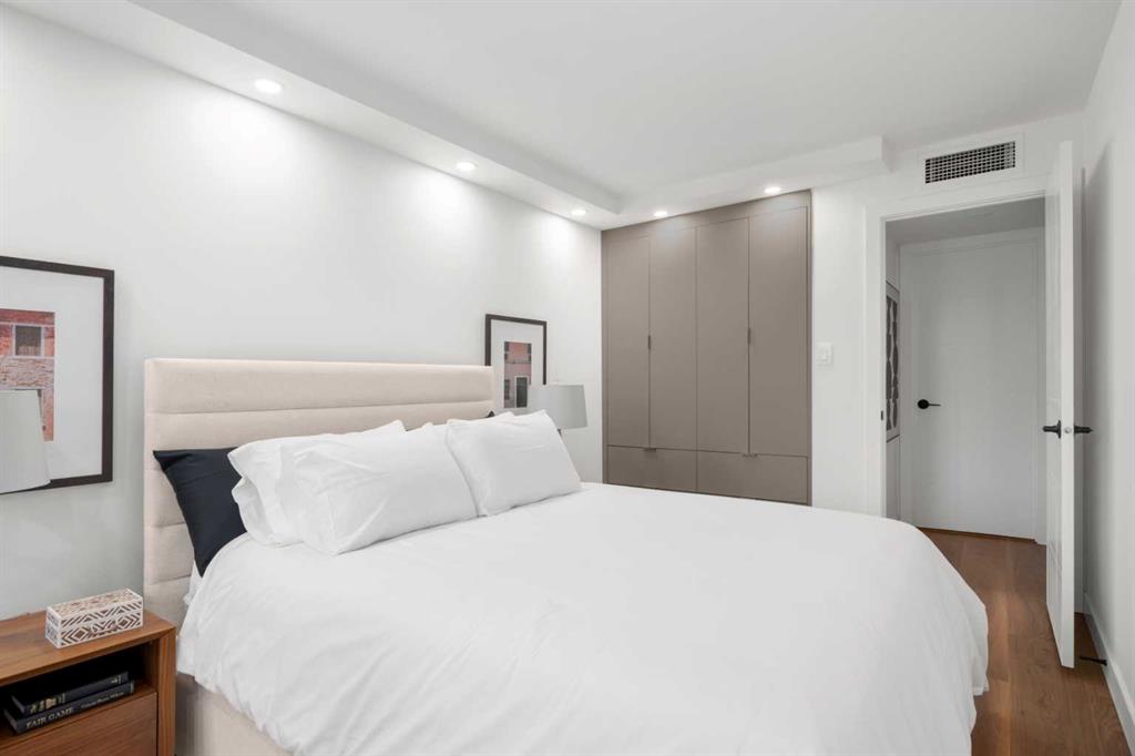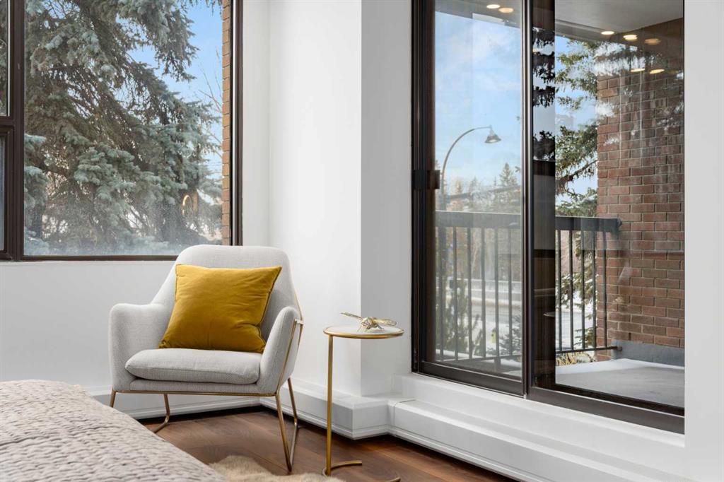 The upper level continues with a layout that balances privacy, comfort, and functionality. The principal bedroom is a refined sanctuary, featuring a custom-designed feature wall, built-in side tables, a generous walk-in closet, and a beautifully finished ensuite with porcelain surfaces. Step out onto your private balcony for morning coffee or an evening unwind, all while taking in serene views of the Elbow River and the treed streets of Rideau. The second bedroom, also positioned to capture river views, includes integrated custom cabinetry designed to optimize storage and space. A full bathroom is conveniently located across the hall, and the upper level is further enhanced by a well-placed laundry area, offering convenience and efficiency.