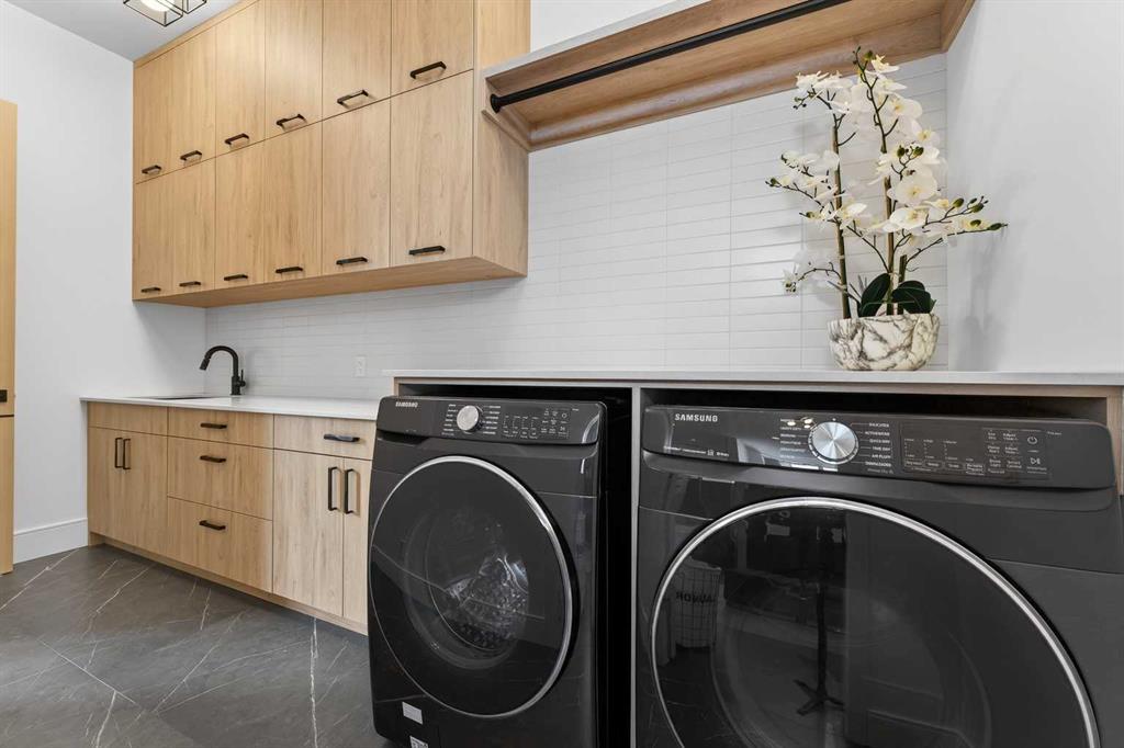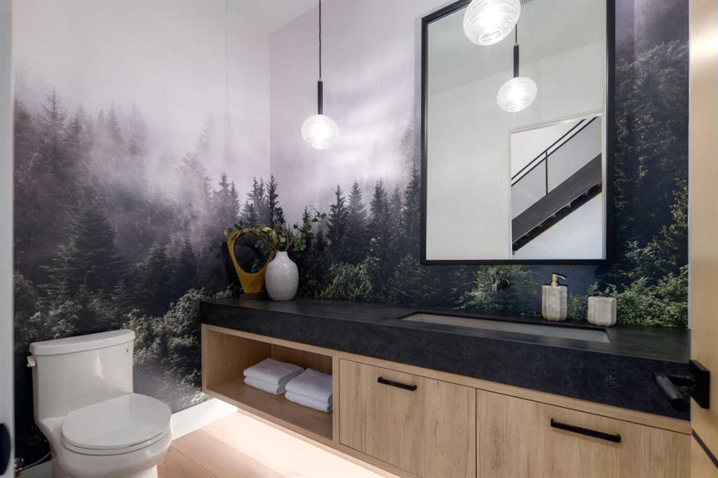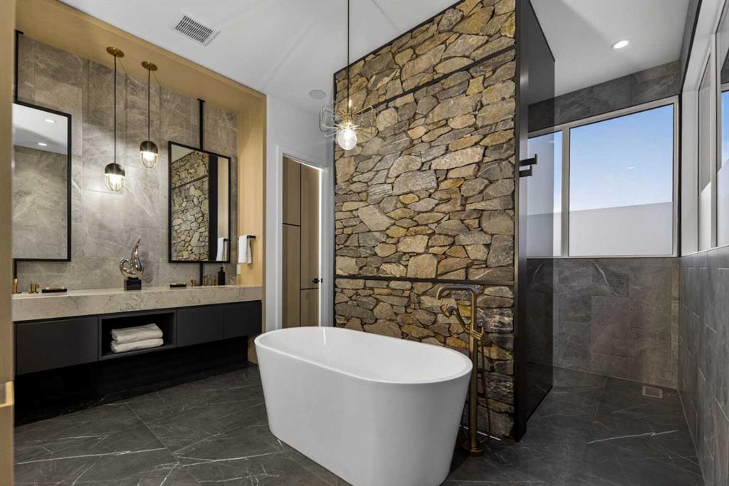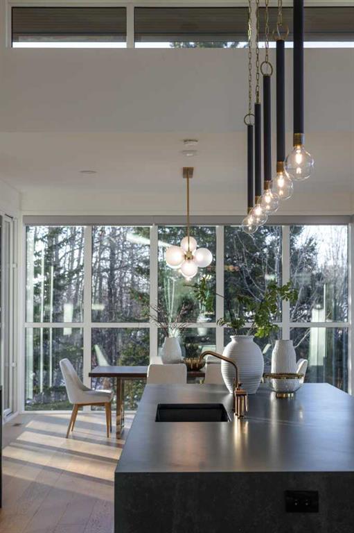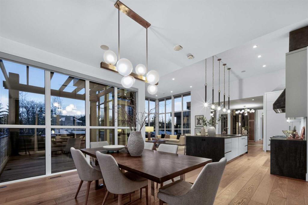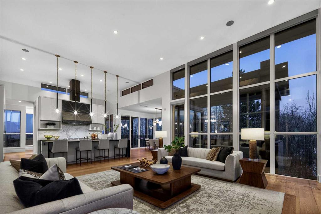 Tucked into 1.77 acres of rolling hills and mature trees in the estate community of Silverhorn, 105 Silverhorn Ridge quietly redefines the acreage category. Built by award-winning West Ridge Fine Homes, this two-storey walkout offers nearly 7,000 SF across three levels — architectural, warm, and connected to nature. The main floor opens to 14' ceilings in the great room, where three elevations of floor-to-ceiling windows in a post-and-beam grid frame the landscape and pour in S/SW light. A linear gas fireplace with metal-paneled facade and stacked ledgestone columns anchors the room. The kitchen is purpose-built for entertaining: a full Miele package with eight-burner dual-oven gas range, paneled built-in fridge and freezer, and dishwasher; black leathered stone counters with waterfall-edge island; full-height marbled stone backsplash; and integrated pantry. The butler's pantry adds a Miele coffee machine, combi-steam oven, and 100+ bottle wine fridge. The dining room sits in a glass enclosure that feels like eating among the trees; the breakfast nook is built for unhurried mornings. Three decks extend the main floor outdoors: a covered patio with BBQ hookup, a pergola sundeck with S/SW exposure, and a central sunrise deck off the nook, foyer, and primary suite. The main-floor primary retreat features a custom built-in bed frame and floor-to-ceiling headboard with tufted velvet, custom millwork, antiqued mirror panels, integrated pendants, and hidden motorized footboard TV. A glass wall delivers light from two elevations with direct deck access. The spa ensuite offers in-floor heat, freestanding soaker tub, floating dual vanity, dedicated makeup vanity, oversized curbless shower with black-framed tinted glass and five-function system, and separate water closet. The walk-in connects to the laundry. An open-riser staircase wrapped in windows leads upstairs to two bedrooms with walk-ins and private ensuites, plus a bright executive office with tinted glass feature wall. The walkout lower level is built for entertaining. Radiant in-floor heat runs throughout. A three-sided gas fireplace with shelving separates the conversation area from a striking wet bar in Japanese charred wood cladding with stainless kegerator, wine fridge, and dishwasher. The space steps down through a games area into a sunken theatre with quartz projection screen, ceiling-mounted projector, and surround sound. Two more bedrooms with private ensuites and walk-ins, a spa bath with steam shower, a gym, and a wine cellar that steals the show round out the level. The heated, epoxy-floored triple-door garage fits up to five cars (or three plus workshop), with ceiling height for a lift. Additional features: metal frame structure, natural stone accents, smart home automation, automated roller shades, irrigation, exterior lighting, stamped concrete driveway, frameless tempered glass railings, speaker zones, and STEP septic. Book a showing to experience 105 Silverhorn Ridge — and Silverhorn itself.