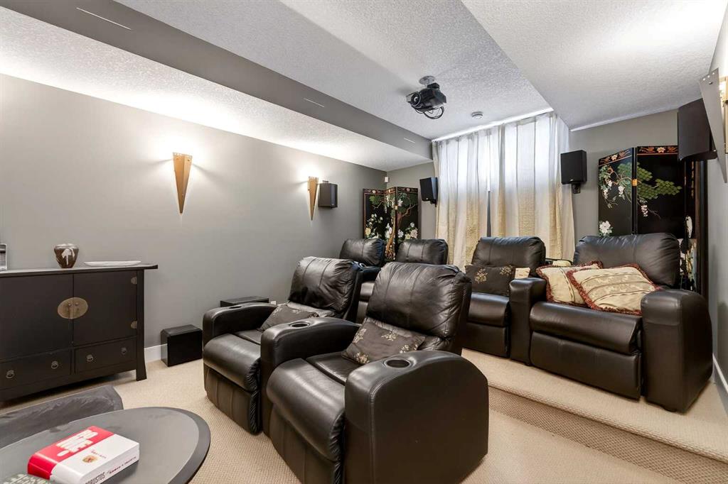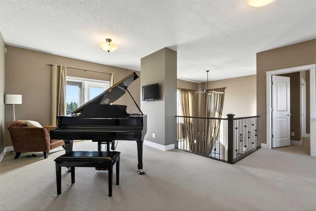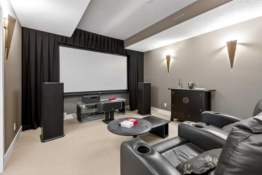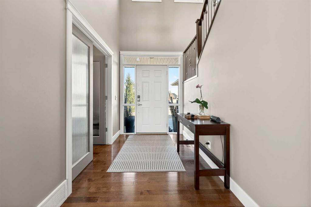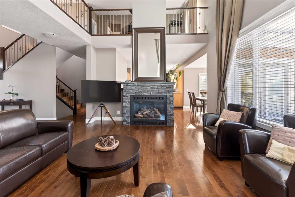 OPEN HOUSE: SAT FEB 14th 12-3PM. Located in the prestigious community of MonTerra on Cochrane Lakes , this SAM Award-winning custom 2-story home offers 3600 sq.ft of developed living space on 3 levels with Rocky Mountain views. Designed for exceptional family living, the home features four bedrooms, a main-floor office with built-in Murphy bed, and a dramatic great room with cathedral ceilings, west-facing floor-to-ceiling windows, and a gas fireplace fully wired with a Sonos sound system. The spacious kitchen and oversized dining area are ideal for entertaining, complete with professional-series appliances including a Sakura hood fan, ample Denca cabinetry with under counter LED spot lighting, and breakfast-bar island. A large walk thru pantry with family sized mudroom, and access to a west-facing sundeck with gas bbq hookup complete this level. Upstairs offers a bright loft-style sitting area and three bedrooms. The luxurious primary bedroom features a double-sided gas fireplace, six-piece ensuite, and walk-in closet. The fully developed lower level includes a home theatre, guest bedroom, home gym or flex space, and full bath. Not to be missed for the car or hobby enthusiasts is a rare five-car attached garage with high ceilings, plenty of storage and a pull through bay to rear-yard access. This mechanics dream is wired to 220V and already set up with car lift, workbench, bike hoists, and a high-end compressor and pressure wash system. Set on a low maintenance landscaped corner lot minutes from Cochrane near quality schools, shops, and services—this is an excellent opportunity to settle in one of Rocky View's most sought-after communities.