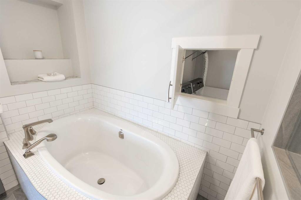 The primary suite is a true retreat, anchored by a large window capturing stunning views. The spa-inspired ensuite offers a soaker tub, a walk-in shower with an incorporated bench, a double vanity, and custom built-ins. A convenient pass-through panel provides direct access to the adjacent laundry room, complete with a sink and additional storage.