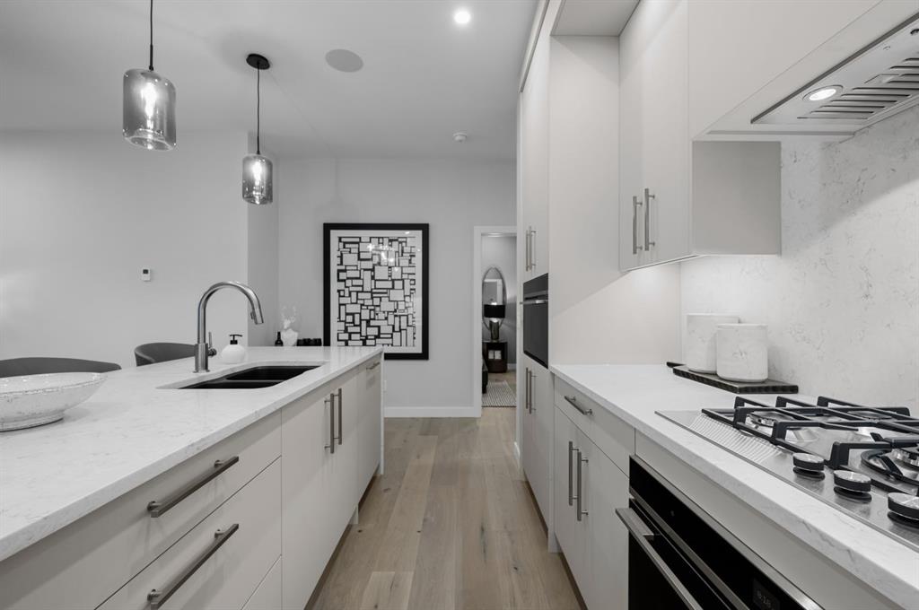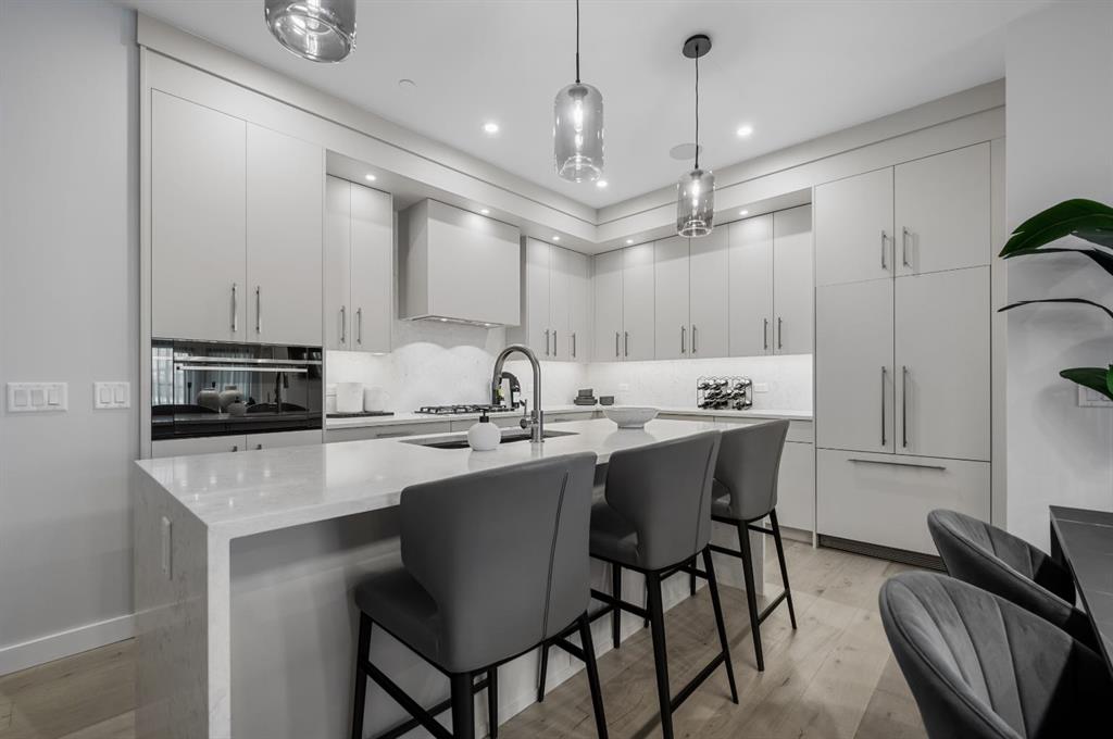 The living room, anchored by a sleek built-in fireplace, offers a warm and elegant backdrop for both intimate gatherings and quiet evenings at home. At the heart of the residence lies a chef-inspired kitchen, where beauty meets function. Full-height custom cabinetry, a professional-grade gas cooktop, and a striking quartz island with a sculptural range hood combine to create a space as practical as it is luxurious. Thoughtful touches—such as a panelled refrigerator, under-cabinet lighting, and double waterfall quartz countertops—transform everyday cooking into a gourmet experience.
