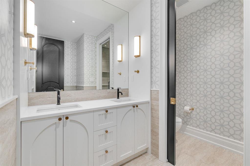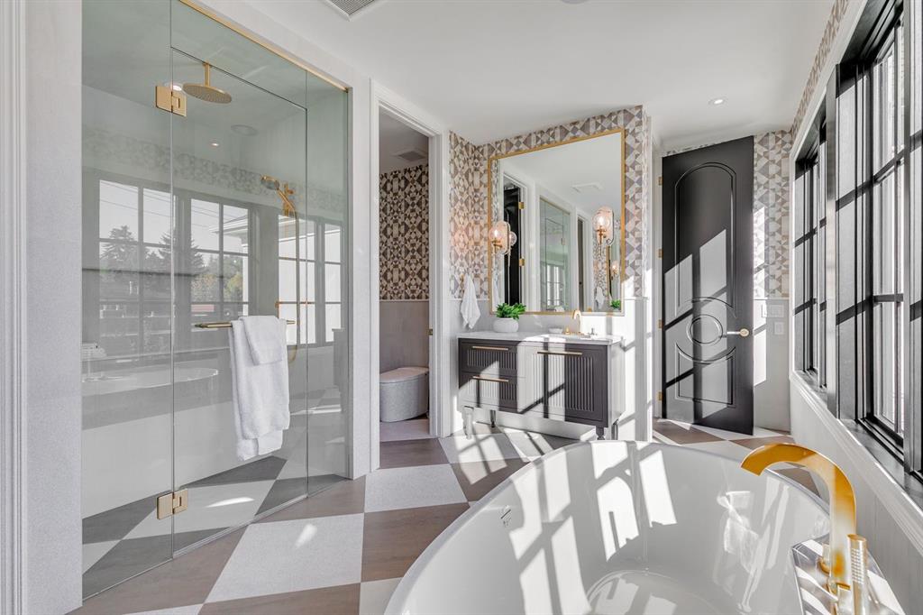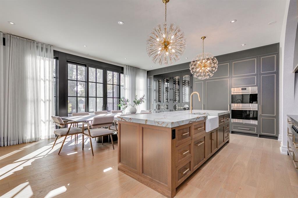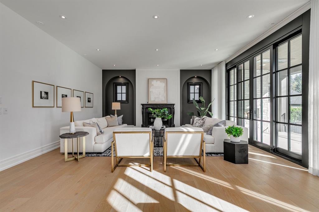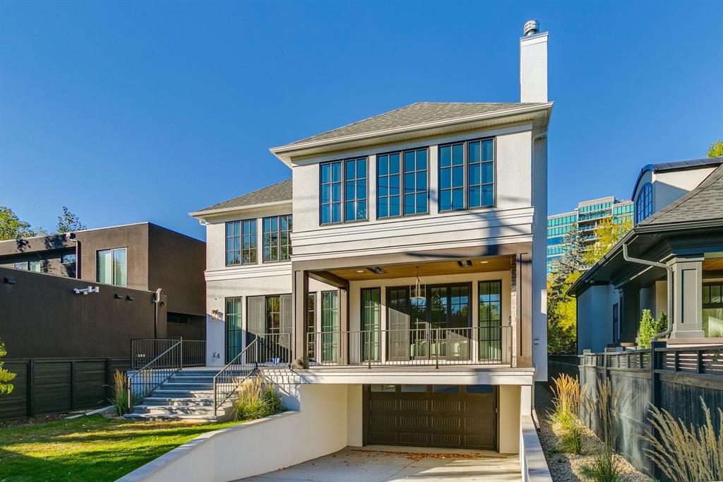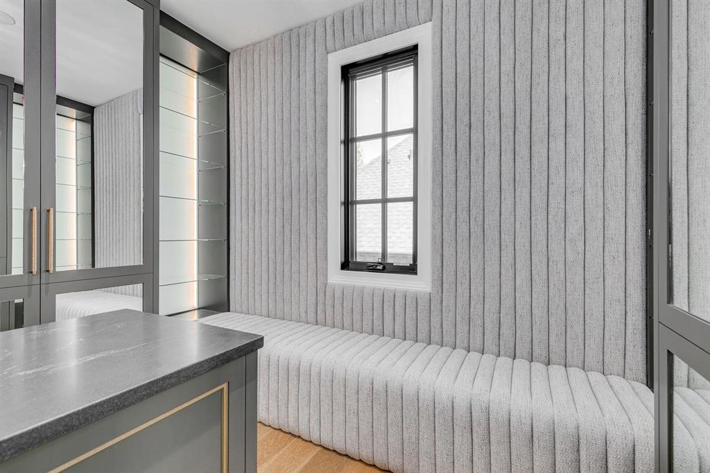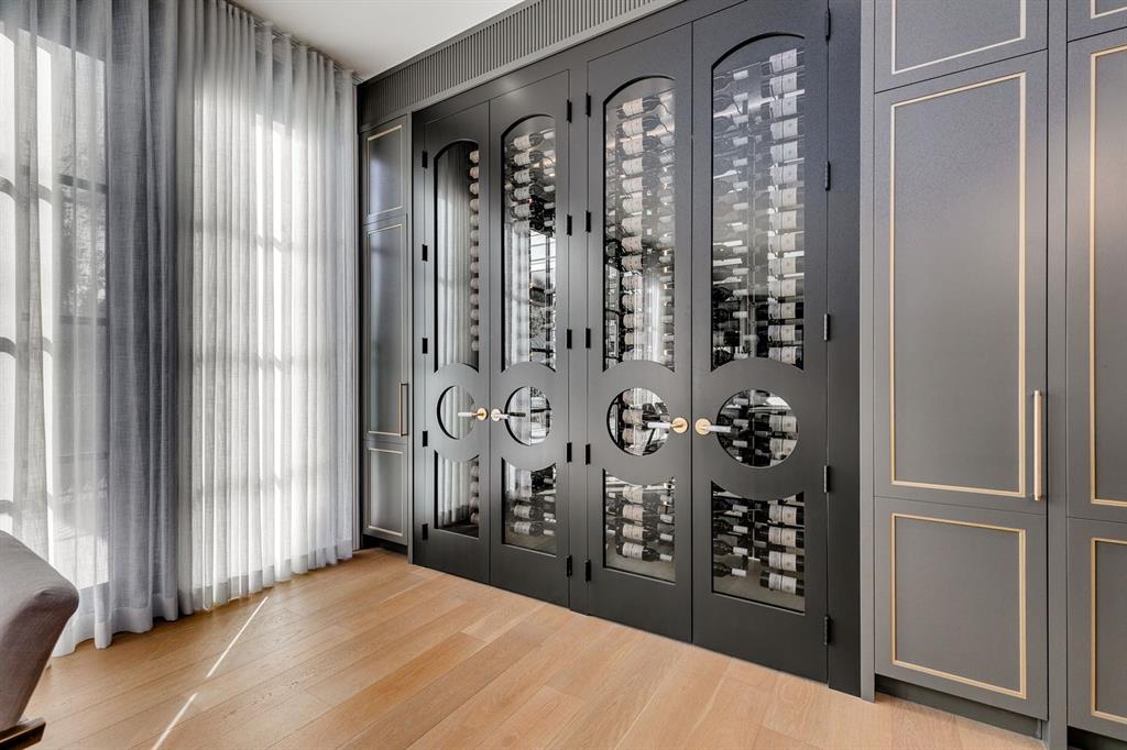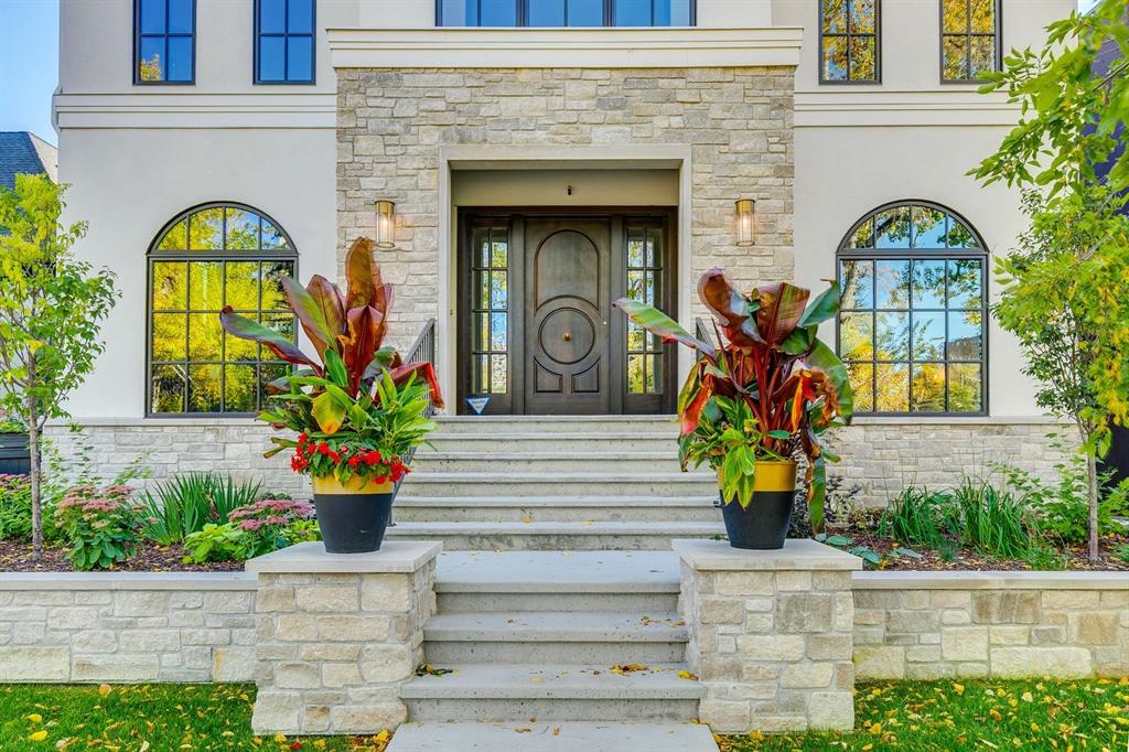 This masterfully crafted estate by Tyrrell Custom Homes is a true statement of elegance, nestled in the heart of Roxboro, one of Calgary’s most prestigious inner-city communities. Conceived by McDowell & Associates and elevated by the award winning Paul Lavoie Interior Design, this home is a seamless marriage of timeless architectural beauty and modern sophistication. From the moment you arrive, the home exudes refined grandeur with a stone and acrylic stucco exterior, a custom crafted front door, and expertly landscaped grounds featuring underground irrigation and a fully fenced yard. A snow melt driveway leads to the rare heated four car garage, while a private covered outdoor living room, complete with a wood burning fireplace, flush-mount heaters, and built-in speakers, sets the stage for year-round entertaining in style. Inside, the commitment to quality and detail is unmistakable. Soaring ceilings, custom white oak staircases, and herringbone patterned oak flooring create a backdrop of European flare with quiet luxury. Signature features such as a sculptural cast-stone fireplace mantle and bespoke finishes throughout showcase the home’s craftsmanship at every turn with. Designed for both everyday living and lavish entertaining, the open concept layout includes an elegant formal dining spaces with feature wine wall, and a dreamy kitchen equipped with Subzero and Wolf appliances, site built cabinetry, and a fully appointed butler’s pantry with secondary sink, dishwasher, and freezer. Upstairs, the opulent primary suite offers a private sanctuary with heated tile floors, a steam shower, freestanding soaker tub, and a designer dressing room featuring an island, bench seating, makeup vanity, mirrors, wallpaper accents, and a statement chandelier. Two additional bedrooms, a spacious upper level laundry room with dual washer/dryers, and thoughtful built-ins add both luxury and functionality. A charming library nook offers the perfect spot to unwind with a good book, while a spacious bonus room with vaulted ceilings provides flexibility and can easily be converted into a fourth bedroom. The lower level continues the theme of elevated living with a fifth bedroom, full bathroom, a mirrored fitness studio, and a custom wet bar that anchors the spacious rec room. A Viessmann boiler system with in-floor radiant heat, dual Carrier furnaces, smart thermostats, A/C, HRVs, central vac rough-in, and whole home automation wiring ensure the home is as high performing as it is beautiful. Every detail, right down to the epoxied heated garage floors and premium materials throughout has been thoughtfully curated to the highest standard. This is a rare opportunity to own a home that combines exceptional craftsmanship, technological innovation, and timeless European design, all within steps of the Elbow River and moments from downtown Calgary.