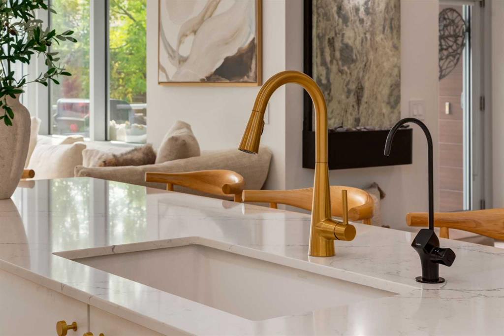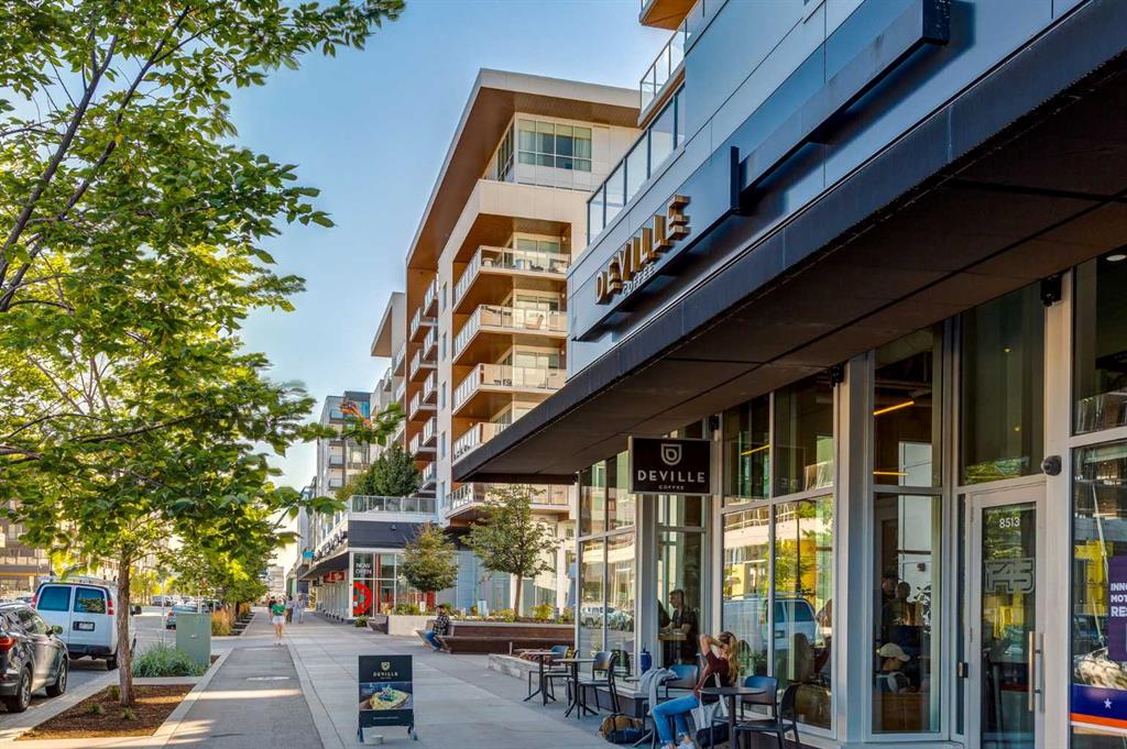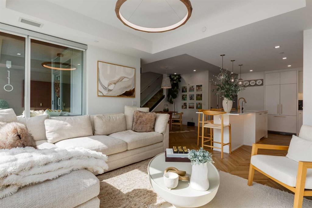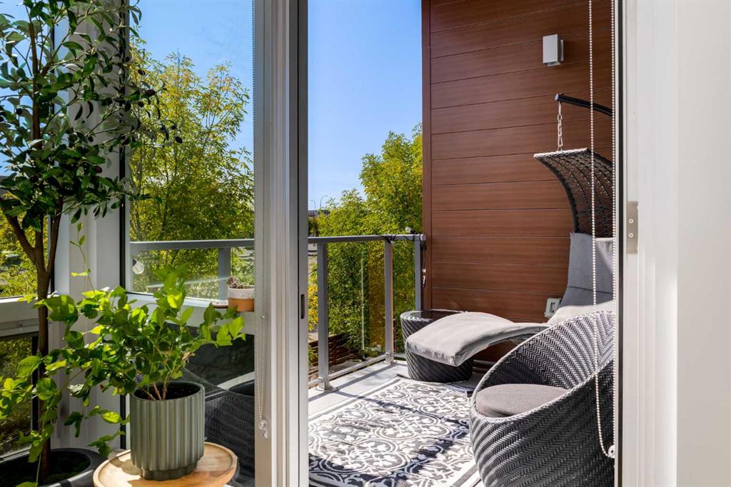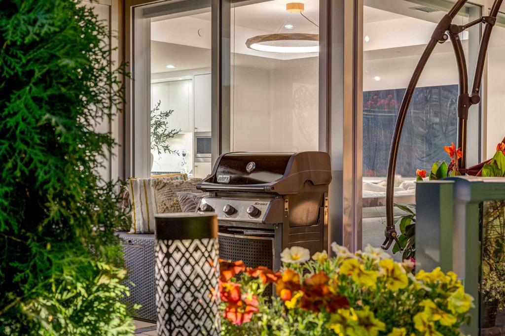 Experience luxury living in a sophisticated THREE BEDROOM Brownstone residence with over 2000 SF of interior living space and over 500SF of outdoor garden terrace space. Designed with both privacy and entertaining in mind, the home boasts upper-level south-facing bedrooms with large mature trees set behind, a dedicated gym area, a south-facing patio with room for an outdoor living room and an upper level deck, perfect for relaxation or gatherings. The chef-inspired kitchen is a true centerpiece, featuring Supermatte slate white cabinetry with brushed-gold hardware, a high-end gas cooktop and wall oven, an integrated 36" Fisher & Paykel fridge, integrated dishwasher, soft-close drawers, under-cabinet lighting, and stunning quartz countertops and backsplash. The dining room is open to the kitchen and cozy living room area. The interior design is spectacular featuring a Nordic-inspired floating fireplace, Chevron flooring, a bespoke granite waterwall feature, and designer lighting. A spacious walk-in pantry ensures ample storage for all your culinary needs. Modern upgrades include Japanese-style toilets, high-flow rain shower heads, and under-cabinet lighting throughout the kitchen and bathrooms, bringing contemporary elegance to every space. Sunlight fills the home through large windows, complemented by roller shades for privacy. Additional features include a full-size washer and dryer, custom built-in cabinetry, and a patio gas line for effortless outdoor cooking. This exceptional home includes two titled parking stalls in a heated, secured underground parkade, offering convenience and peace of mind. Located just steps from the award-winning eight-acre Radio Park, residents can enjoy a vibrant lakeside destination complete with fountains, boardwalks, scenic overlooks, dog parks, an amphitheatre and lush landscaping. The park is designed to offer year-round activities including a performance venue, winter ice rink, and dining experiences. Residents also benefit from a rooftop patio on the 8th floor, a second floor private owner’s lounge, underground visitor parking, bike storage, EV charging stations, and concierge services. The West District community continues to expand with retail shops, pedestrian-friendly sidewalks, bike paths, a central park, outdoor amphitheater, skatepark, seasonal markets, a transit hub, supermarket, and sports courts. Ideally situated, the home is just 15 minutes to downtown Calgary, one hour to the mountains, and 5 minutes to Winsport Canada Olympic Park, offering an unbeatable combination of lifestyle and convenience.