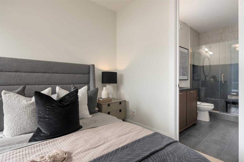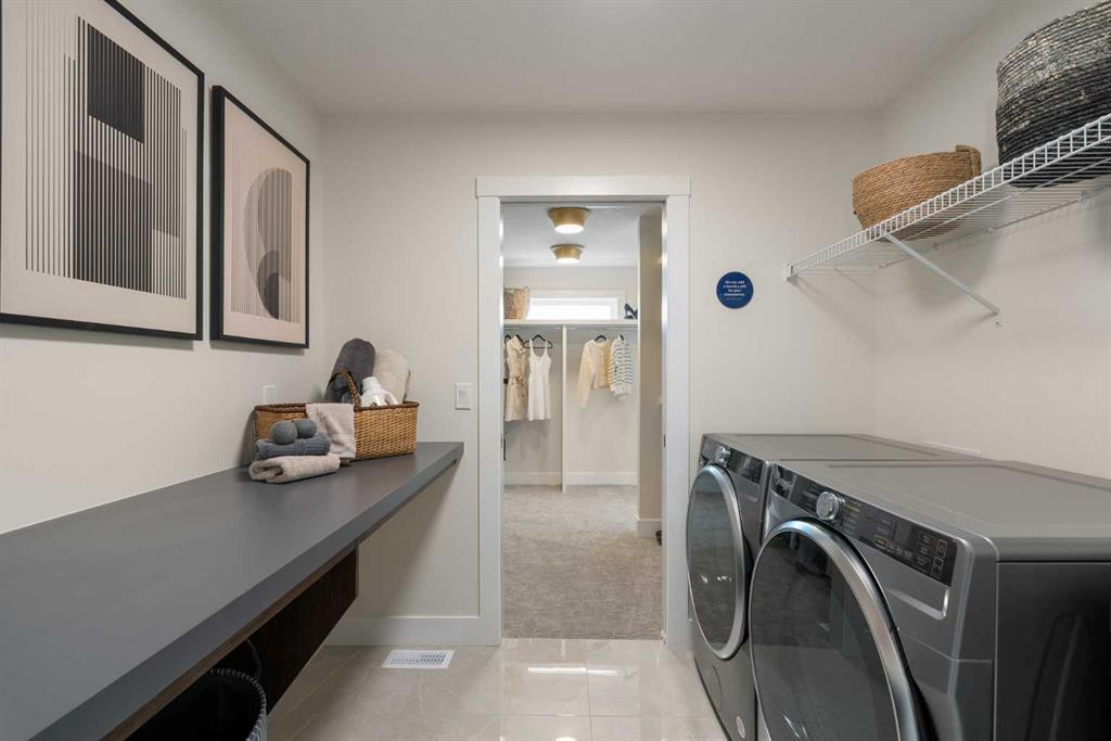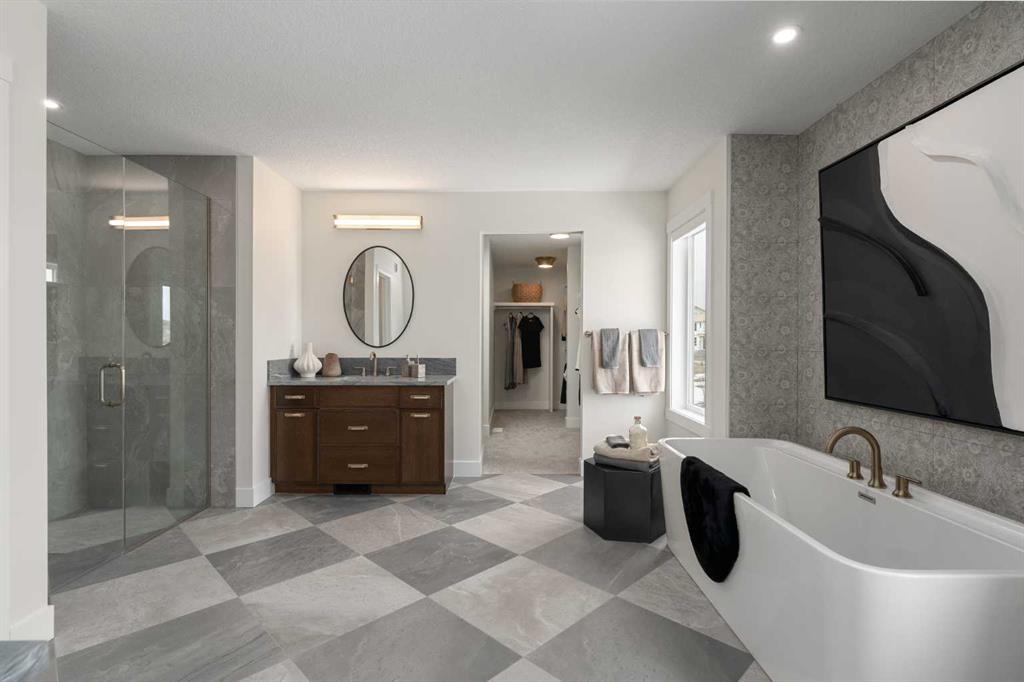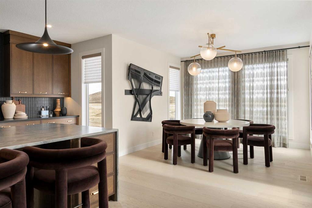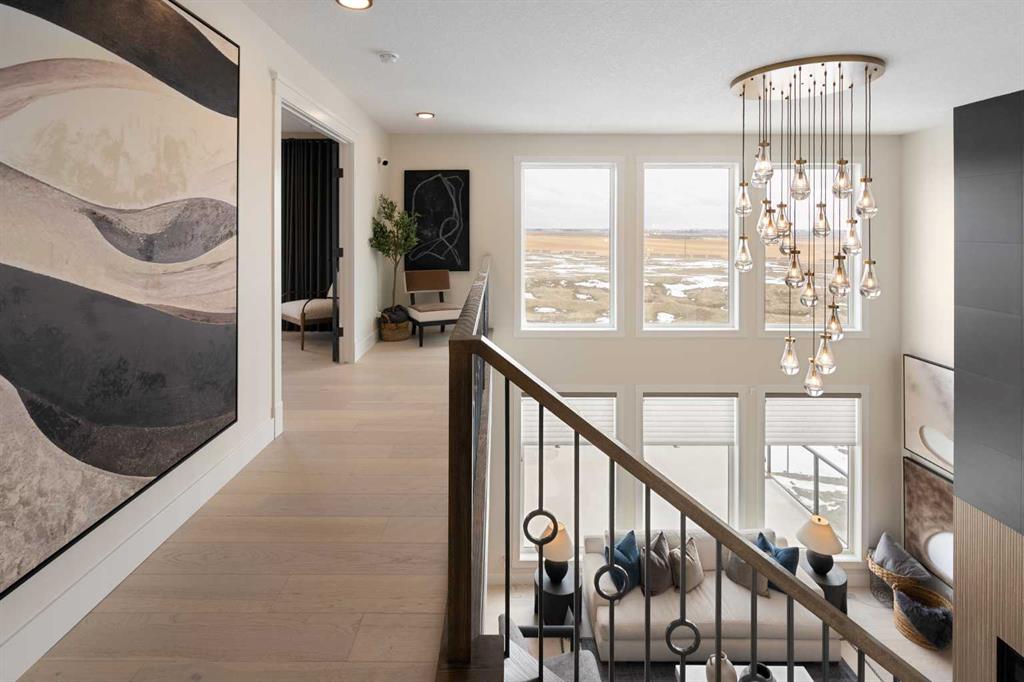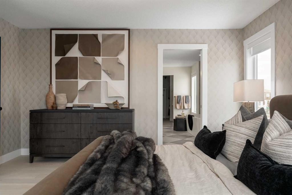 SHOW HOME FOR SALE! Welcome to the Palermo - an impeccably designed, brand-new residence offering a refined blend of modern elegance and everyday functionality, ideally located at 110 Herron Way NE in the sought-after community of Livingston. From the moment you enter, the home impresses with its sophisticated design and seamless flow. The main level is anchored by a stunning central kitchen, thoughtfully curated to serve as both a functional workspace and a striking focal point for entertaining. Featuring a large statement island with waterfall granite countertops, sleek natural wood cabinetry, and a premium Dacor appliance package including a built-in refrigerator, gas cooktop, a wall oven and microwave. This space effortlessly connects to the dining and living areas, creating an open, airy environment enhanced by expansive windows and abundant natural light. The main level is anchored by a dramatic open-to-above great room featuring a striking gas fireplace with tile to the ceiling and expansive windows that flood the space with natural light. The living space is designed with both comfort and style in mind, offering a warm yet elevated atmosphere ideal for hosting or unwinding. Clean lines, contemporary finishes, and intentional design details carry throughout, delivering a cohesive and polished aesthetic. The main level is complete with a bedroom and a full bathroom featuring a walk-in shower - ideal for multi-generational living. Natural wood and iron spindle railings lead to the upper level which overlooks the main level great room. Double doors open to the primary suite, located at the back of the home, away from the secondary bedrooms for optimal privacy. The primary bedroom offers a serene escape, complete with a spacious walk-in closet that connects directly to the laundry room for added convenience. The beautifully appointed ensuite was designed for relaxation, featuring stunning tile design, a curbless walk-in tiled shower with 10mm glass, a soaker tub, individual vanities and a private water closet. Hardwood flooring flows throughout the primary suite and down the hallway to the expansive family room, which features vaulted ceilings, wallpaper and custom lighting. Three generously sized bedrooms, a 5 piece main bathroom, and a large laundry room complete the upper level. The stunning design continues into the professionally developed walkout basement, which features an expansive recreation room, games area and flex space with French doors - creating the ideal home office. A sixth bedroom and full bathroom in the basement create the perfect living space for guests. A wall of windows floods the lower level with natural light, overlooking the private backyard and green space beyond, with patio doors leading to the covered patio. This professionally designed estate property includes a triple attached garage, central A/C, custom window treatments and a timeless cohesive design throughout on one of the community's most coveted home sites.