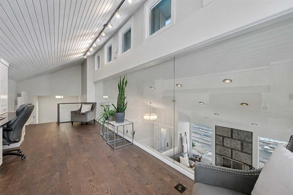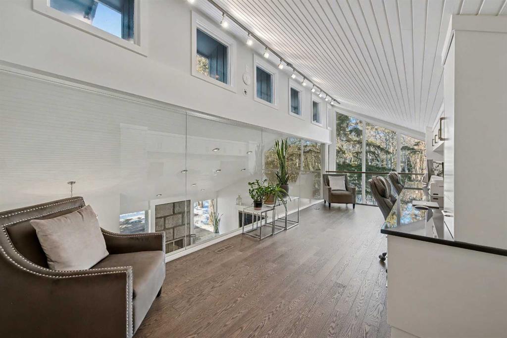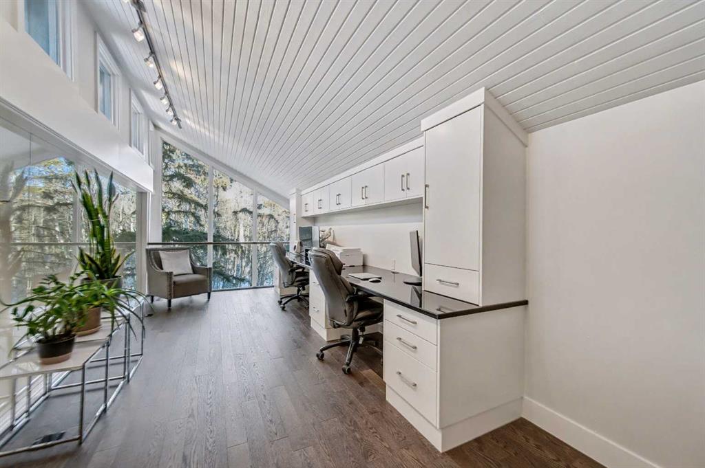 A spectacular glass enclosed home office overlooks the main floor, blending architectural beauty with everyday functionality perfect for those who can also work from home and appreciate inspiring spaces.