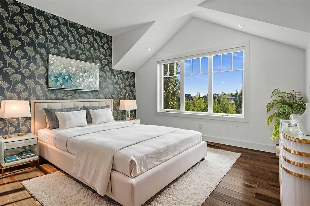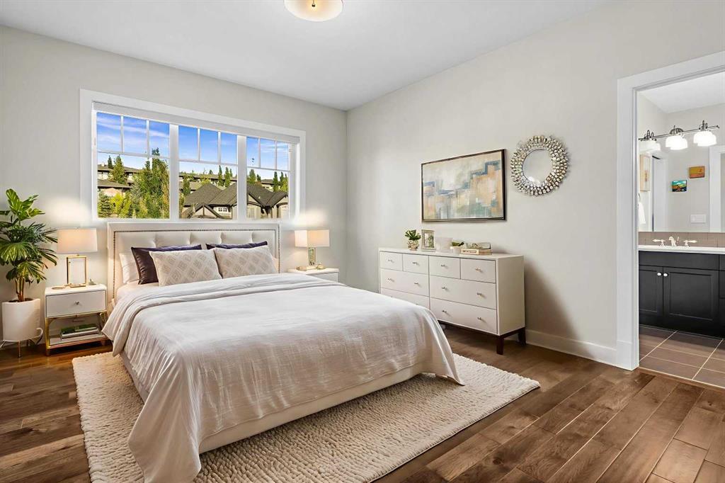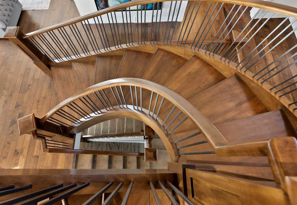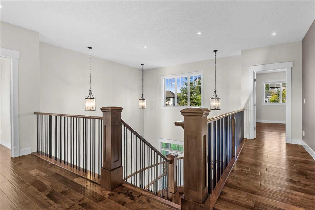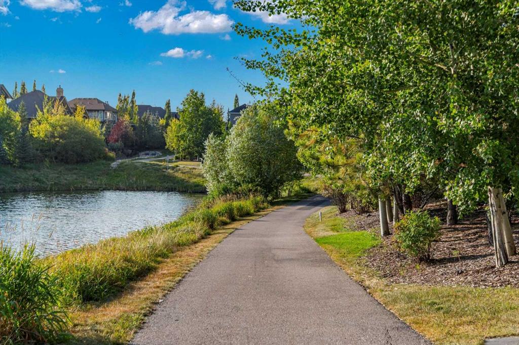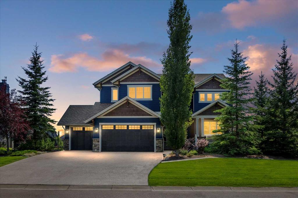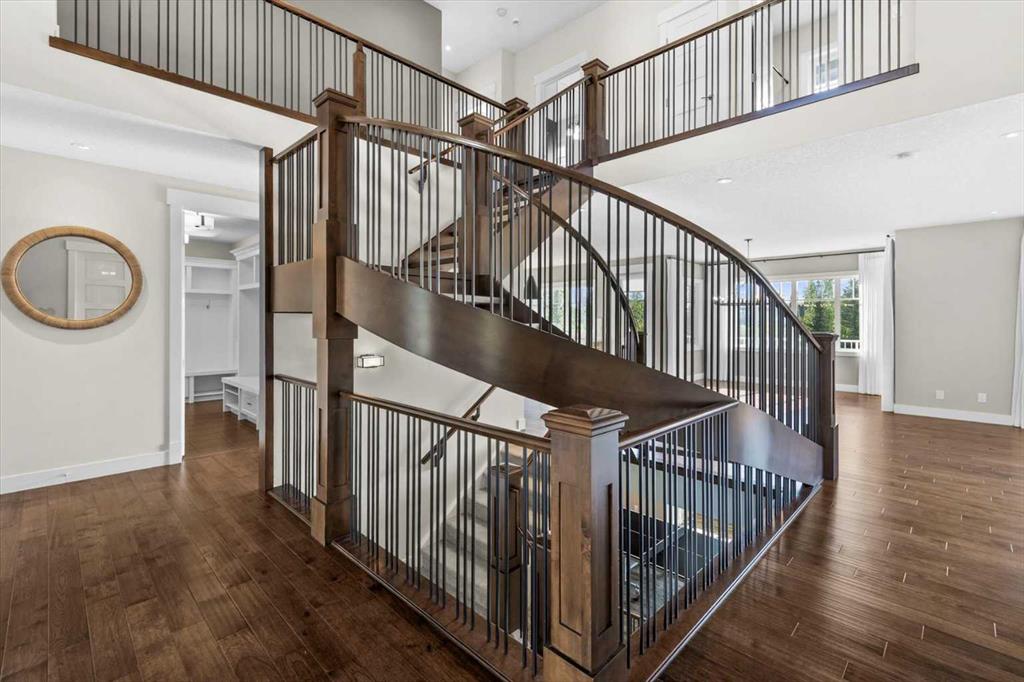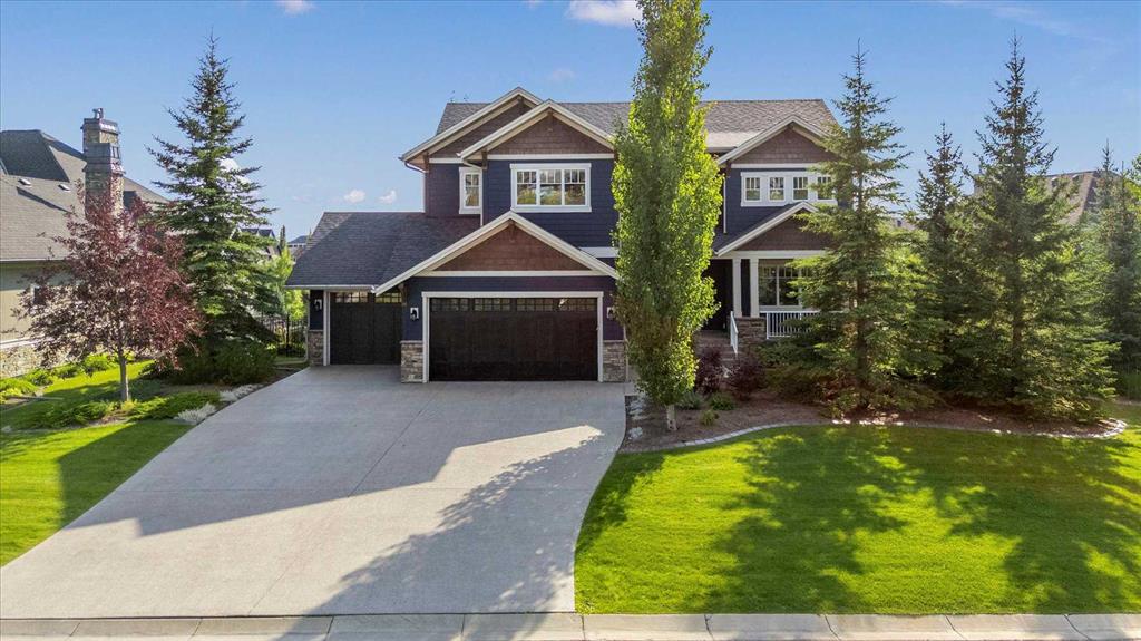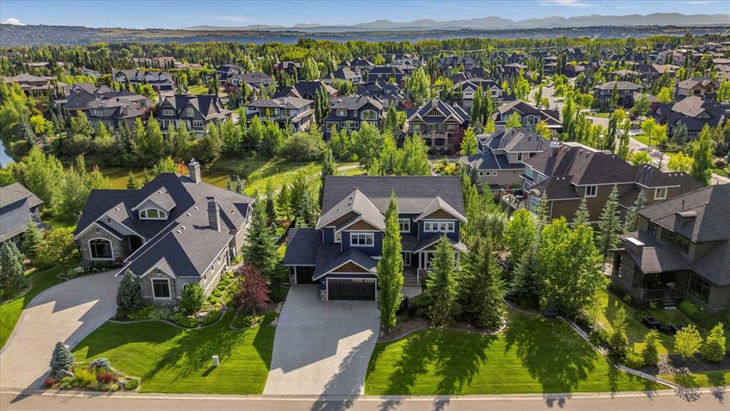 Set in one of Watermark's most coveted locations, a quiet cul-de-sac backing southwest onto green space with tranquil pond and stunning Rocky Mountain views, this custom built two-storey walkout by Wolf Custom Homes offers over 4500sqft of thoughtfully designed living space. Entering the home you are immediately captivated by the millwork on the artisanal curved wood staircase, the natural light streaming throughout the home and the serenity of the stunning views. The main floor is ideal for family connection and entertaining featuring an expansive great room with focal gas fireplace and custom cabinetry, a spacious dining area, and a chef-inspired kitchen with Calcutta Marble quartz countertops, premium JennAir appliances, and walk-through butler’s pantry with exceptional storage. An expansive southwest deck off the kitchen and dining area is perfect for weekend BBQ’s, outdoor dining or simply relaxing in the sunshine. Working from home is easy with the private office with double french doors on the main floor, while the large mudroom with custom built-ins keeps family life organized. On the upper level hardwood floors lead to four generous bedrooms and three full bathrooms, including a luxurious primary suite with vaulted ceilings, spectacular mountain views, a walk-in dressing room with custom cabinetry, and a spa-inspired ensuite featuring heated floors, dual vanities, a deep soaker tub, and a 10mm glass shower with dual rain heads. Two of the upper bedrooms share a Jack & Jill bathroom, and the fourth has its own private bath—ideal for teens or guests. A large laundry room on the upper level adds everyday convenience. The walkout lower level features in-slab heating and is perfect for movie nights or entertaining with the spacious family room and wet bar. Additionally on the lower level is a fifth bedroom that can double as a gym or second home office, a full bathroom, and plentiful storage. The private backyard continues the theme of exceptional living with professional landscaping, mature trees, fire pit conversation area, discreetly positioned hot tub, irrigation system and an abundance of space to play and entertain. Not to be missed is the finished oversized triple garage with polyaspartic flooring, slat walls, extensive built-in storage and EV charger. Recent updates to the home include servicing of furnaces, hot water tank, and A/C units; new light fixtures above island and in dining area, new wine fridge and icemaker in wet bar, hot tub, polyaspartic flooring and shelves in garage, mirrored wall in 5th bedroom, re-tiled shower base in ensuite, and addition of children’s play space under the stairs. Awarded Canada’s Community of the Year multiple times, Watermark features over 5km of paved trails, a network of cascading ponds and streams, community playgrounds and a Central Plaza. Exceptional access to several golf courses, the Rocky Mountains, Stoney Trail and downtown Calgary.