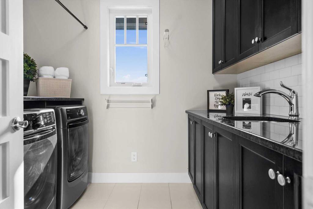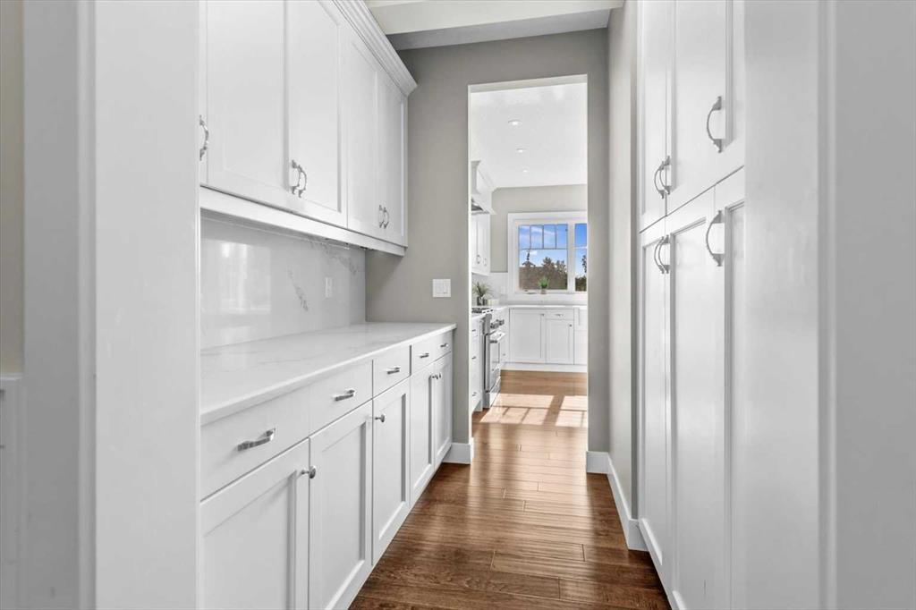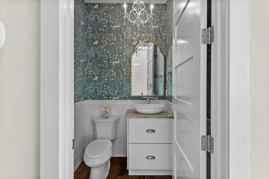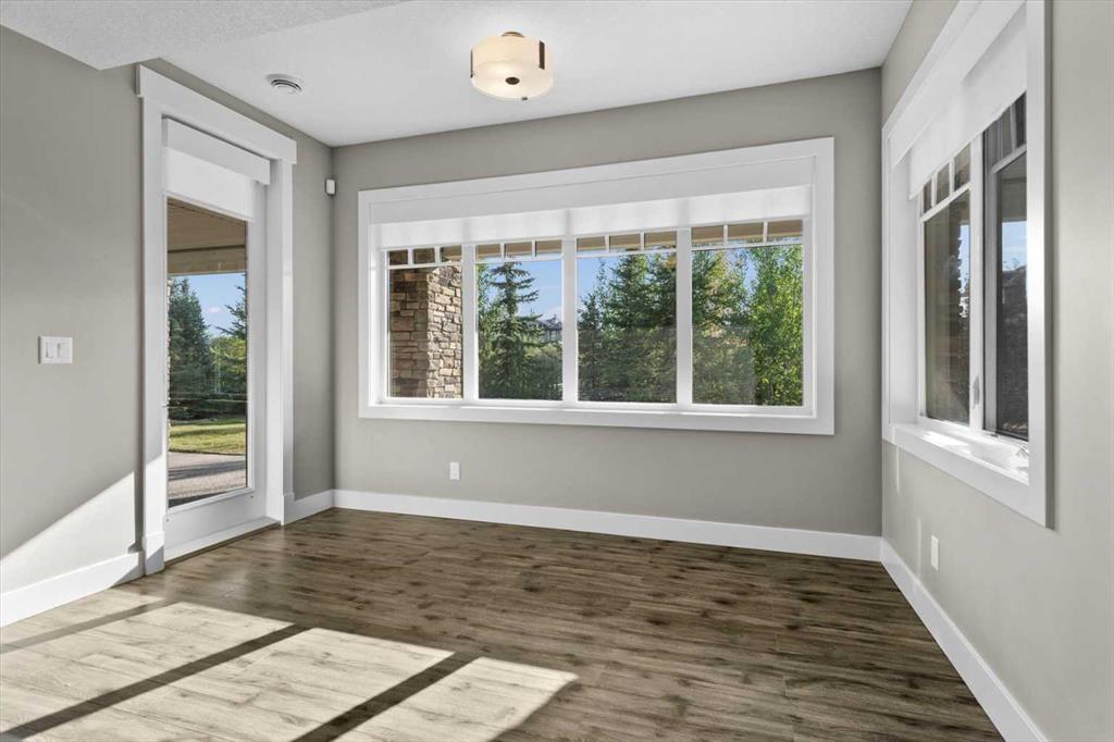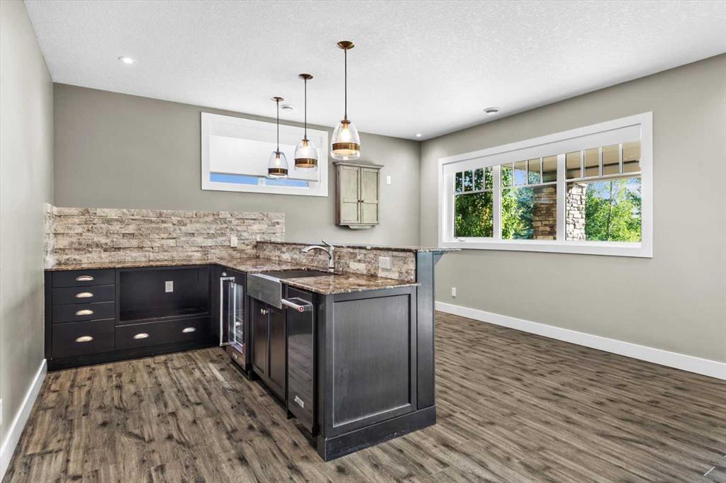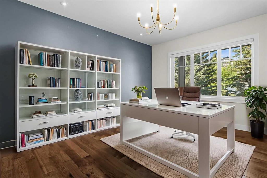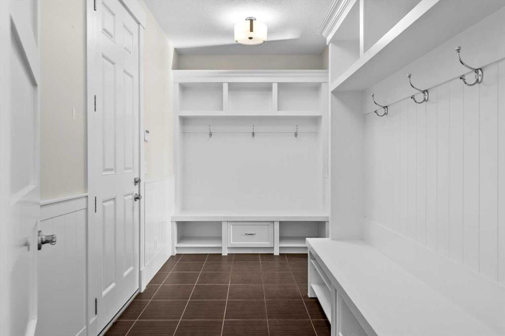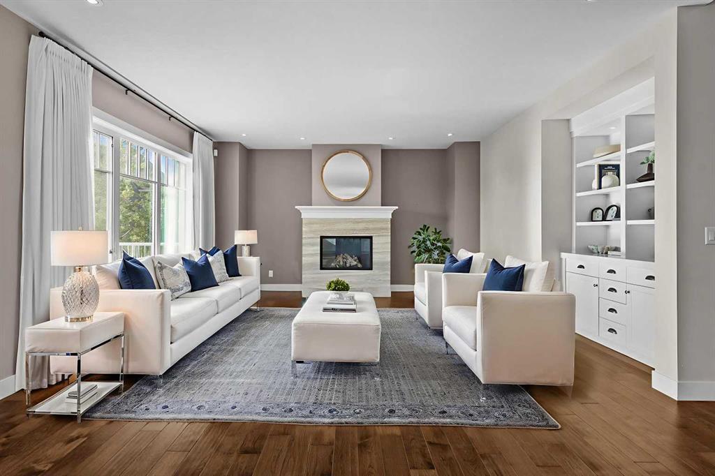 Set in one of Watermark's most coveted locations, a quiet cul-de-sac backing southwest onto green space with tranquil pond and stunning Rocky Mountain views, this custom built two-storey walkout by Wolf Custom Homes offers over 4500sqft of thoughtfully designed living space. Entering the home you are immediately captivated by the millwork on the artisanal curved wood staircase, the natural light streaming throughout the home and the serenity of the stunning views. The main floor is ideal for family connection and entertaining featuring an expansive great room with focal gas fireplace and custom cabinetry, a spacious dining area, and a chef-inspired kitchen with Calcutta Marble quartz countertops, premium JennAir appliances, and walk-through butler’s pantry with exceptional storage. An expansive southwest deck off the kitchen and dining area is perfect for weekend BBQ’s, outdoor dining or simply relaxing in the sunshine. Working from home is easy with the private office with double french doors on the main floor, while the large mudroom with custom built-ins keeps family life organized. On the upper level hardwood floors lead to four generous bedrooms and three full bathrooms, including a luxurious primary suite with vaulted ceilings, spectacular mountain views, a walk-in dressing room with custom cabinetry, and a spa-inspired ensuite featuring heated floors, dual vanities, a deep soaker tub, and a 10mm glass shower with dual rain heads. Two of the upper bedrooms share a Jack & Jill bathroom, and the fourth has its own private bath—ideal for teens or guests. A large laundry room on the upper level adds everyday convenience. The walkout lower level features in-slab heating and is perfect for movie nights or entertaining with the spacious family room and wet bar. Additionally on the lower level is a fifth bedroom that can double as a gym or second home office, a full bathroom, and plentiful storage. The private backyard continues the theme of exceptional living with professional landscaping, mature trees, fire pit conversation area, discreetly positioned hot tub, irrigation system and an abundance of space to play and entertain. Not to be missed is the finished oversized triple garage with polyaspartic flooring, slat walls, extensive built-in storage and EV charger. Recent updates to the home include servicing of furnaces, hot water tank, and A/C units; new light fixtures above island and in dining area, new wine fridge and icemaker in wet bar, hot tub, polyaspartic flooring and shelves in garage, mirrored wall in 5th bedroom, re-tiled shower base in ensuite, and addition of children’s play space under the stairs. Awarded Canada’s Community of the Year multiple times, Watermark features over 5km of paved trails, a network of cascading ponds and streams, community playgrounds and a Central Plaza. Exceptional access to several golf courses, the Rocky Mountains, Stoney Trail and downtown Calgary.