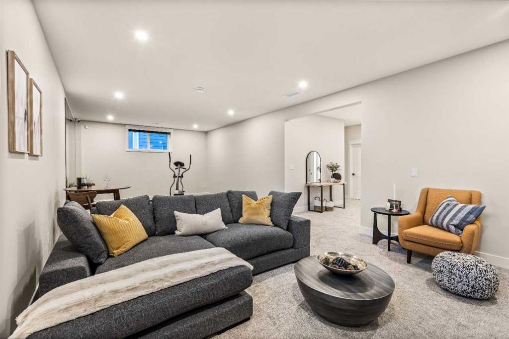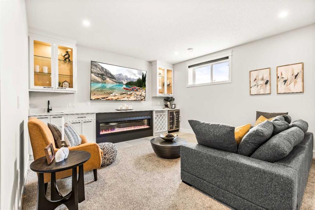 Nestled in a serene lakeside community, this exquisite 2-storey Show Home features 6 bedrooms, 5 full bathrooms, and a fully finished basement on a premium lot. The main floor boasts 10-ft ceilings, hardwood flooring, quartz countertops, a living room with feature wall, a den/office, a spice kitchen with gas range, hood fan, fridge, and dishwasher, plus an upgraded main kitchen with waterfall island and built-in KitchenAid appliances. The open-to-below in the family area showcases a natural gas fireplace, striking staircase with glass railings and sensor-activated lighting. Upstairs offers a bonus room with fireplace, laundry with sink, a luxurious primary bedroom with 6-piece ensuite and private balcony, two bedrooms with Jack & Jill bath, and a fourth bedroom with common bath. The basement includes side entry, rec room with fireplace, gym, wet bar, two bedrooms, and full bath. A triple-car garage, extended exposed aggregate driveway, and glass-railed deck completes this stunning home.