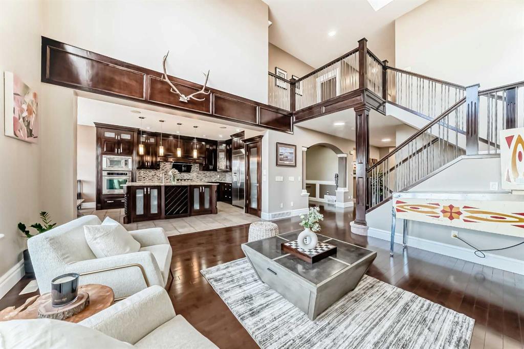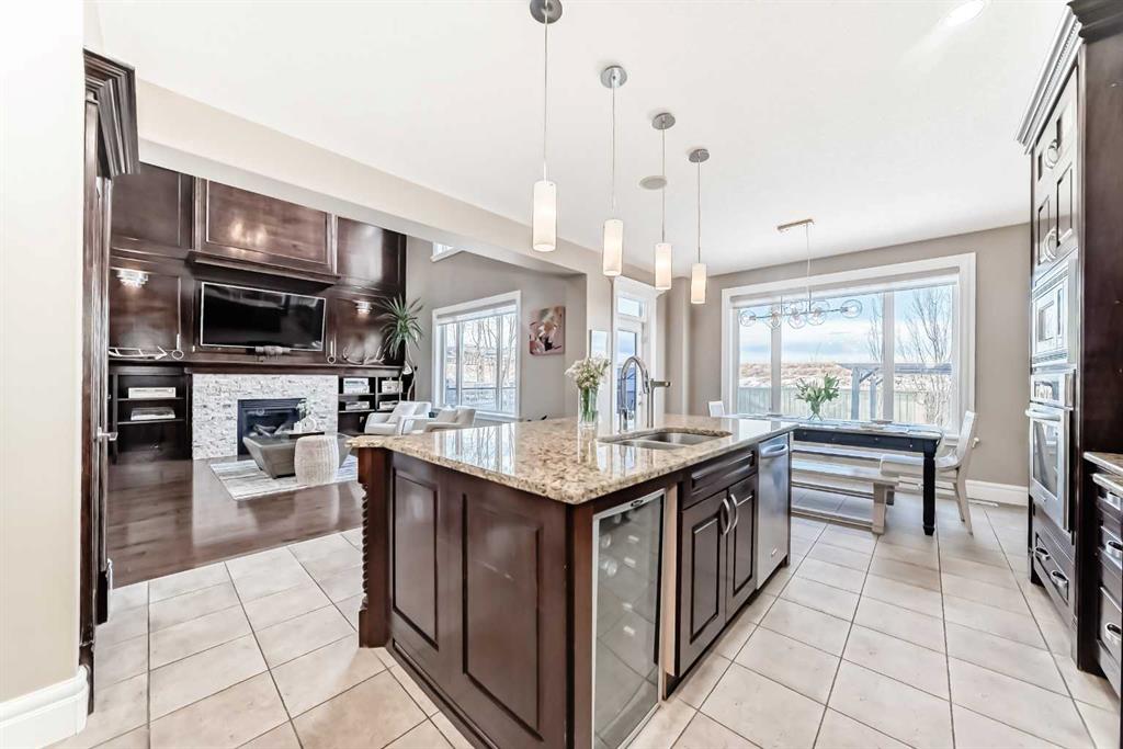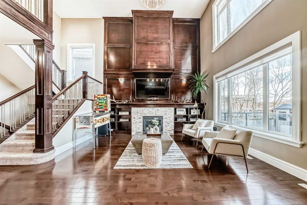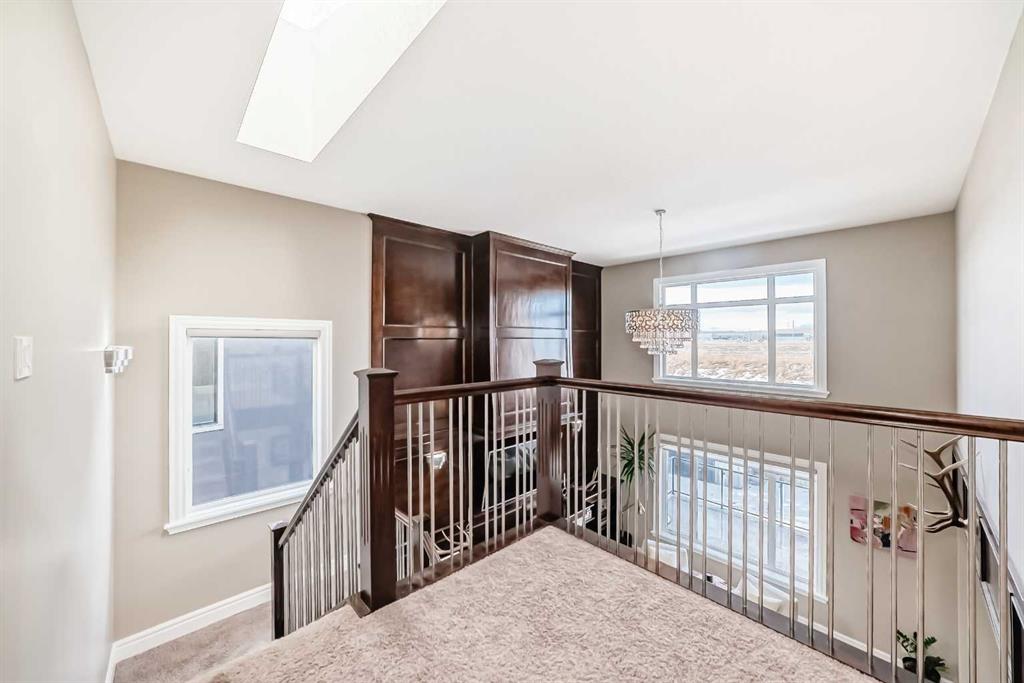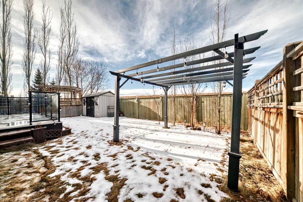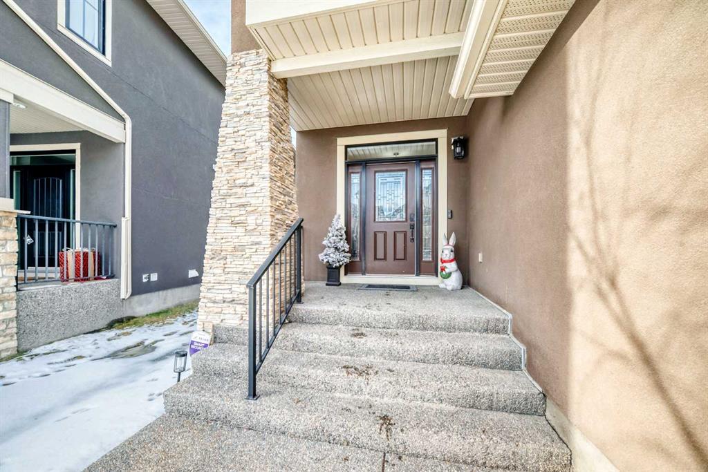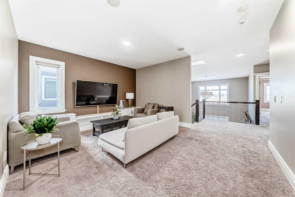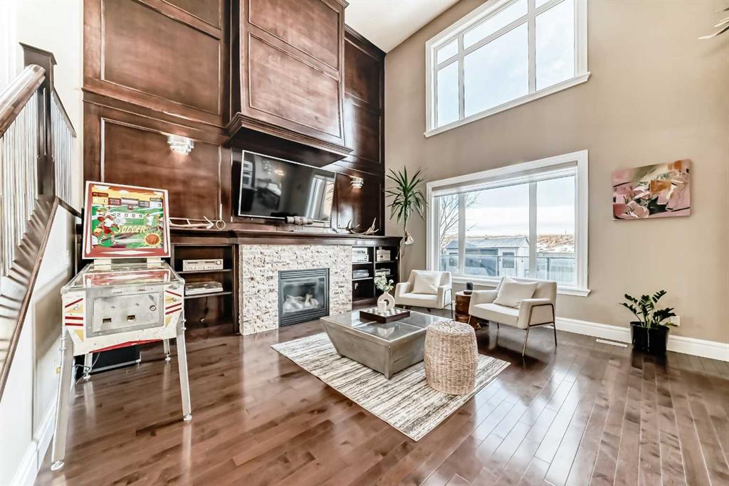 This beautifully maintained home features 4 bedrooms, 2.5 bathrooms, and a bright open-concept layout ideal for modern family living and entertaining. Extensive upgrades include custom trim, crown moulding, detailed woodworking, LED lighting, and built-in ceiling speakers. The main floor offers a spacious living area and a private home office, perfect for remote work. The chef-inspired kitchen showcases custom cabinetry, granite countertops, stainless steel appliances, a large central island with wine rack and beverage cooler, tiled backsplash, and a glass-top stove with built-in microwave and oven. The impressive great room features a 20-foot ceiling, oversized windows, a skylight, hardwood flooring, and a striking gas fireplace with a two-storey wood mantel, creating a bright and elegant living space.Upstairs, the primary suite includes dual closets, double vanities with granite countertops, a soaker tub, and a tiled shower. Three additional bedrooms are complemented by a media room, a full bathroom, and a convenient upper-floor laundry room. Enjoy a private backyard retreat with an oversized vinyl deck with glass railing, natural gas BBQ hookup, and a pergola—ideal for outdoor relaxation and entertaining.Recent upgrades include: FOTILE range hood fan, 5-head gas cooktop, kitchen water purification system, whole-house fresh paint, updated interior and exterior lighting, and duct cleaning. A rare opportunity to own a move-in-ready former show home in one of Calgary’s most sought-after communities.