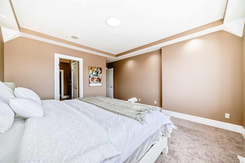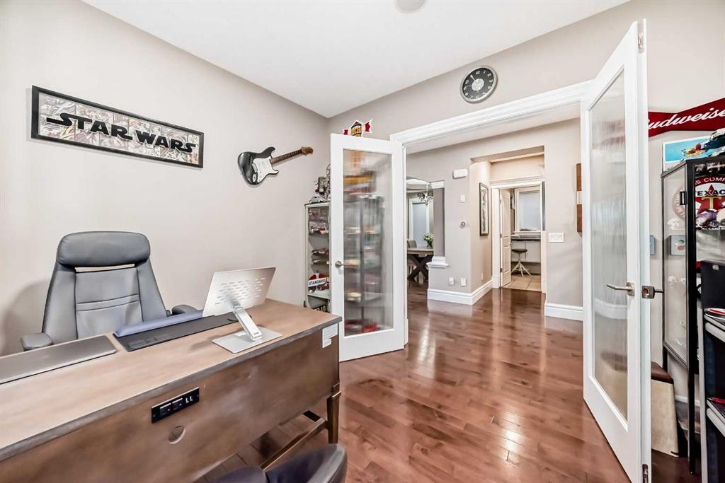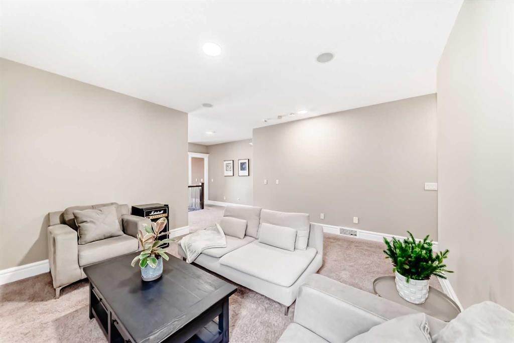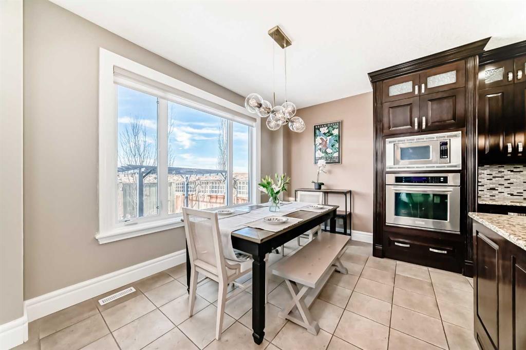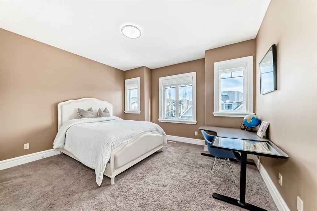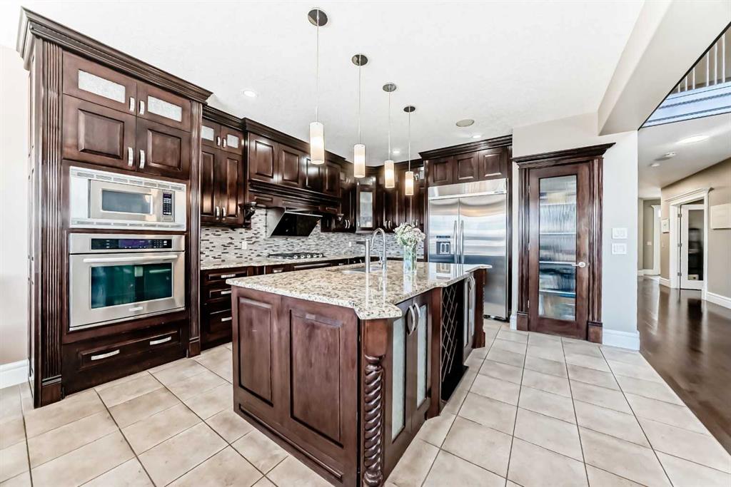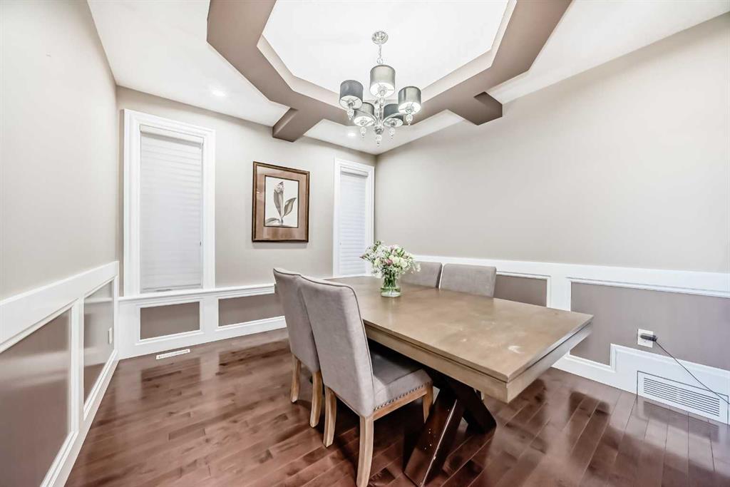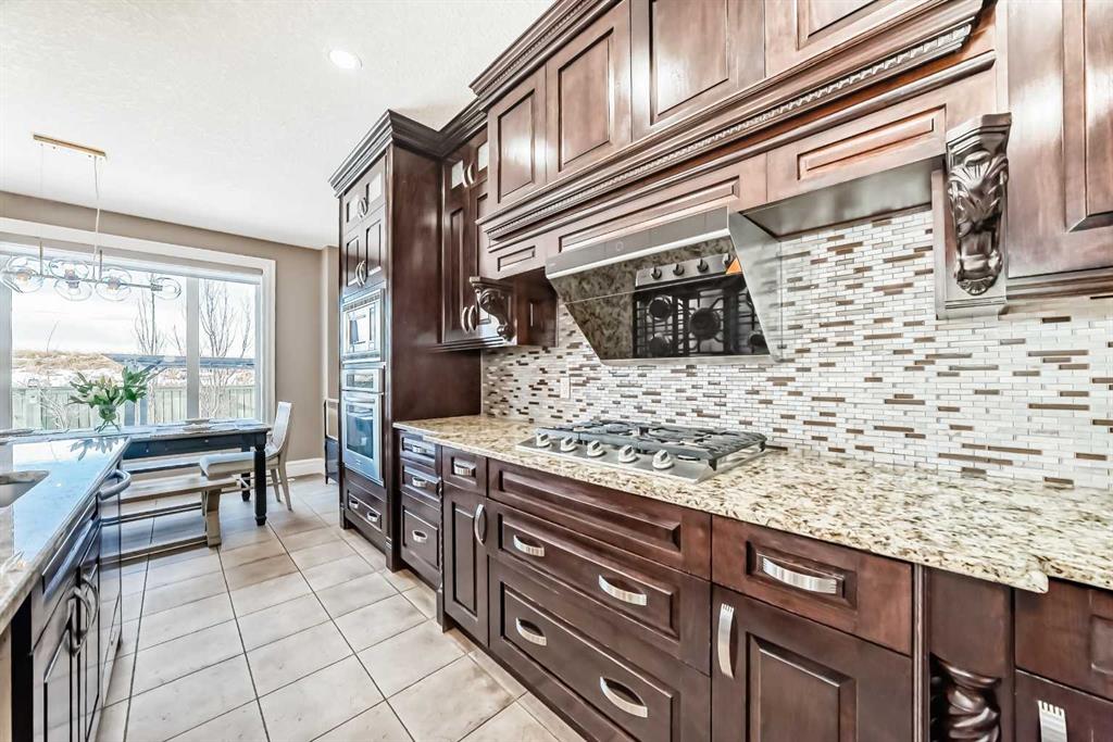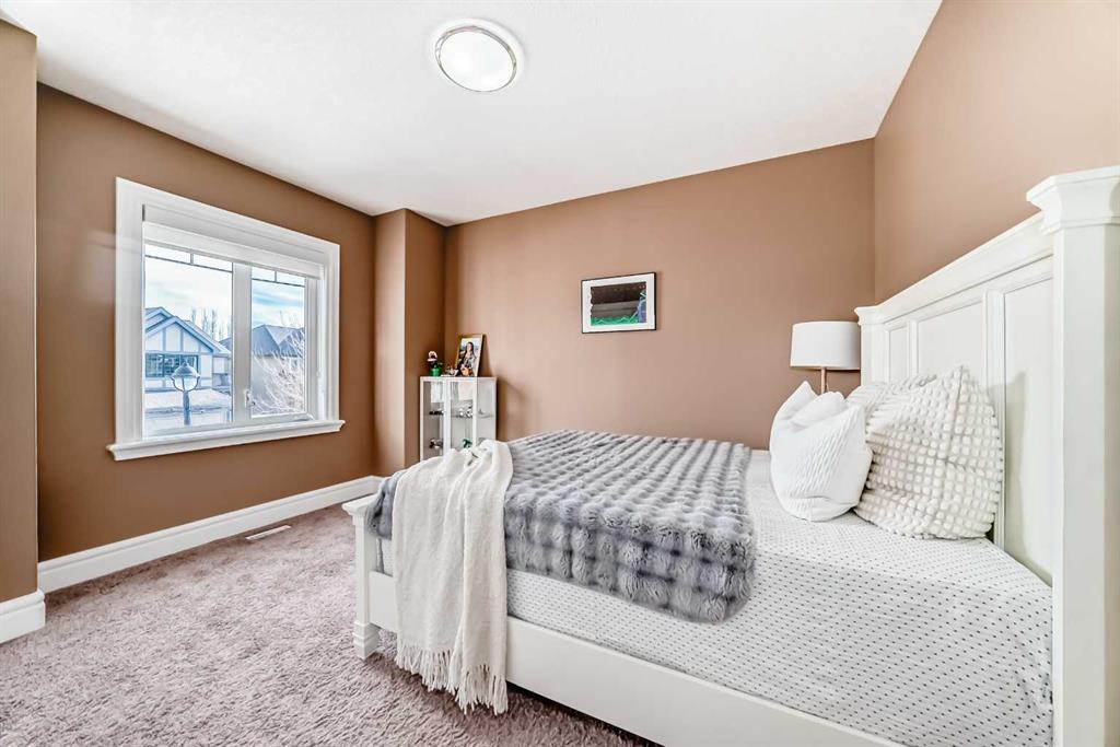 This beautifully maintained home features 4 bedrooms, 2.5 bathrooms, and a bright open-concept layout ideal for modern family living and entertaining. Extensive upgrades include custom trim, crown moulding, detailed woodworking, LED lighting, and built-in ceiling speakers. The main floor offers a spacious living area and a private home office, perfect for remote work. The chef-inspired kitchen showcases custom cabinetry, granite countertops, stainless steel appliances, a large central island with wine rack and beverage cooler, tiled backsplash, and a glass-top stove with built-in microwave and oven. The impressive great room features a 20-foot ceiling, oversized windows, a skylight, hardwood flooring, and a striking gas fireplace with a two-storey wood mantel, creating a bright and elegant living space.Upstairs, the primary suite includes dual closets, double vanities with granite countertops, a soaker tub, and a tiled shower. Three additional bedrooms are complemented by a media room, a full bathroom, and a convenient upper-floor laundry room. Enjoy a private backyard retreat with an oversized vinyl deck with glass railing, natural gas BBQ hookup, and a pergola—ideal for outdoor relaxation and entertaining.Recent upgrades include: FOTILE range hood fan, 5-head gas cooktop, kitchen water purification system, whole-house fresh paint, updated interior and exterior lighting, and duct cleaning. A rare opportunity to own a move-in-ready former show home in one of Calgary’s most sought-after communities.