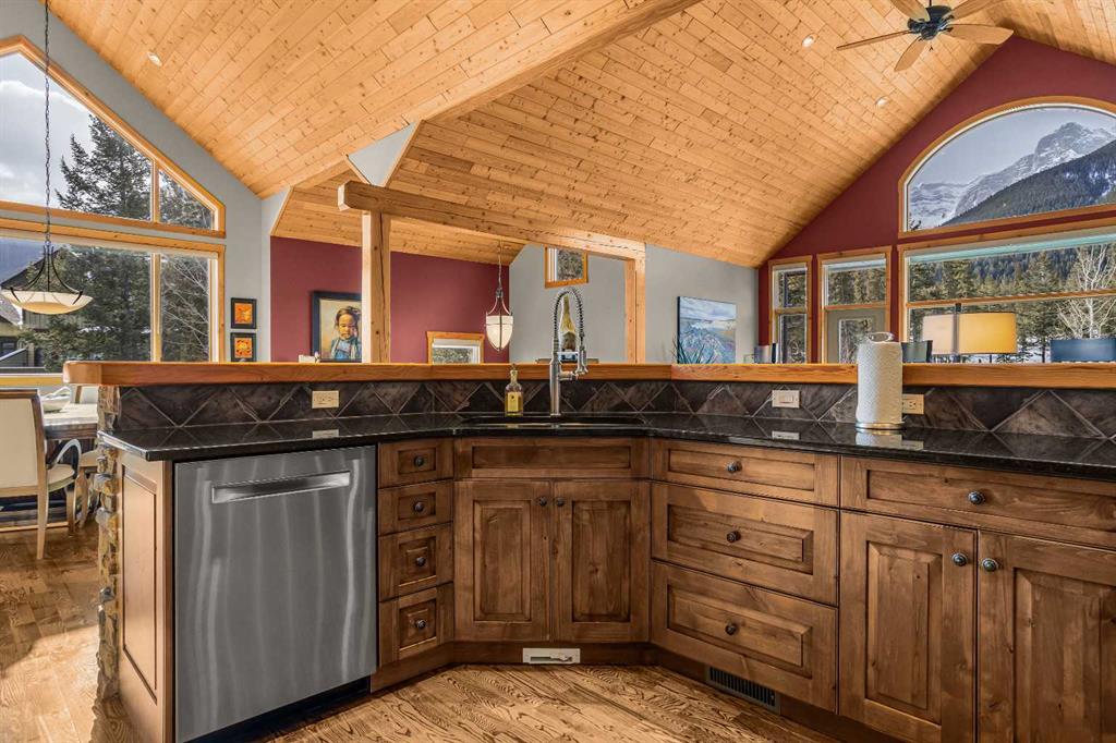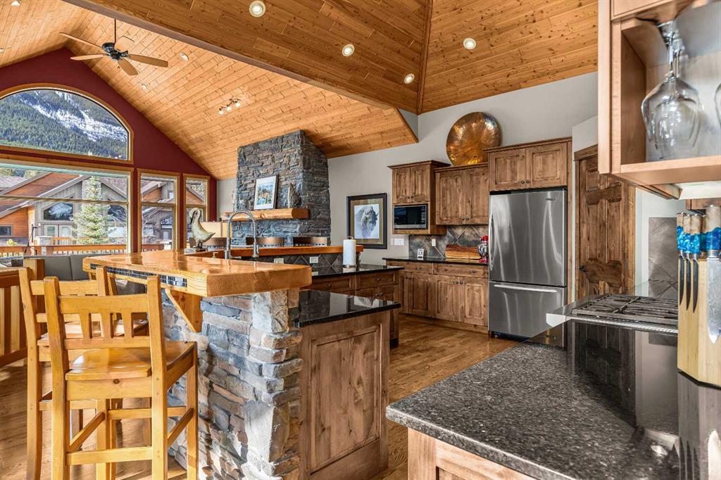 Set within the exclusive enclave of Hubman Landing, this 5-bedroom, 5-bathroom residence offers over 4,100 sq ft of living space, thoughtfully positioned to capture exceptional views from nearly every window. Elevated above the surrounding trees and backing onto privacy, the home embraces its natural setting with multiple outdoor patios and balconies designed to take full advantage of the landscape. The main level is anchored by vaulted ceilings and warm hardwood flooring, creating a timeless Canmore aesthetic. The kitchen is both functional and inviting, opening into generous living and dining spaces that frame the mountains beyond. The primary suite is conveniently located on the main floor for true one-level living and features a striking floor-to-ceiling fireplace, creating a dramatic focal point while maintaining a sense of comfort and retreat.