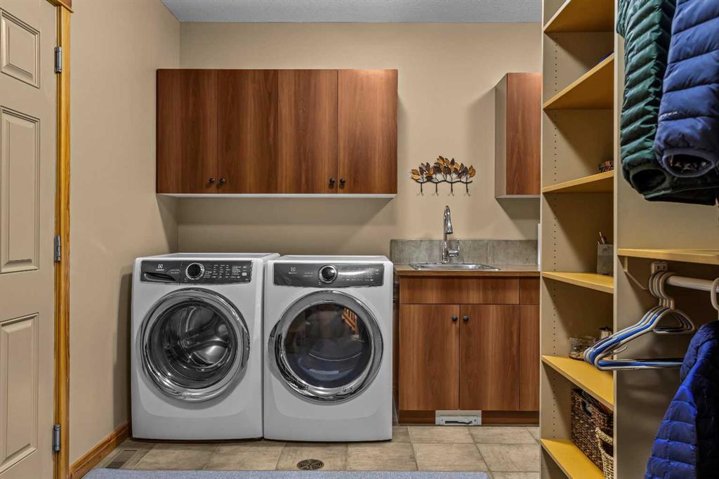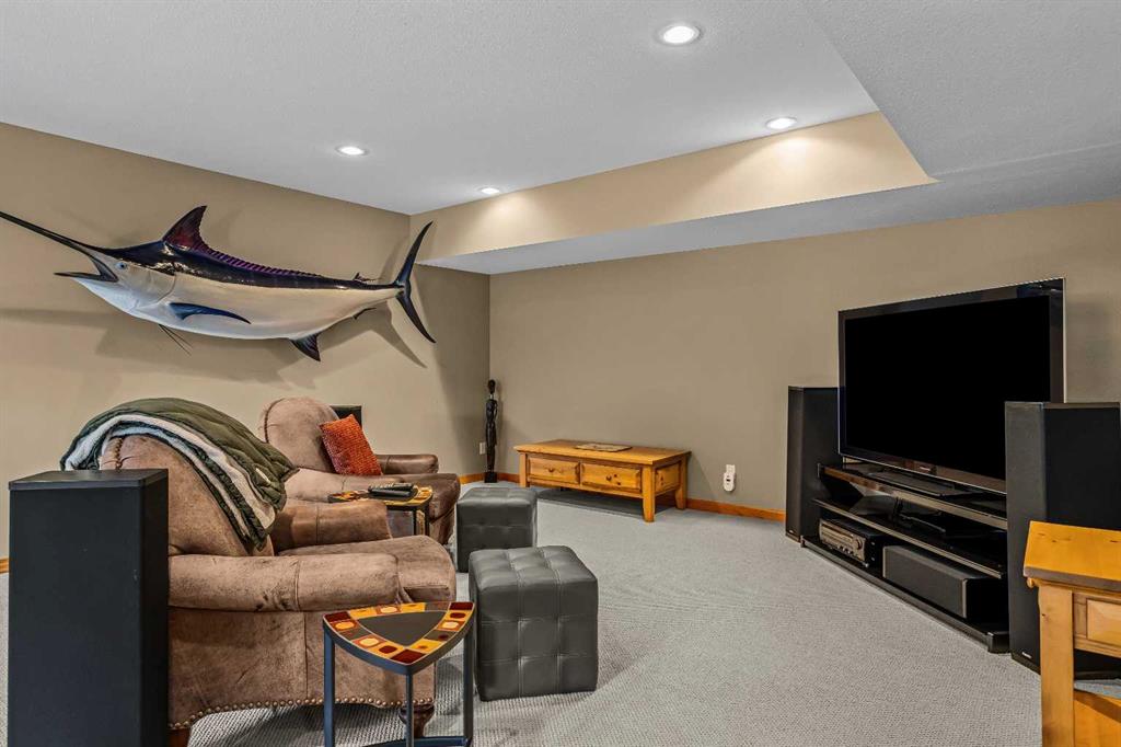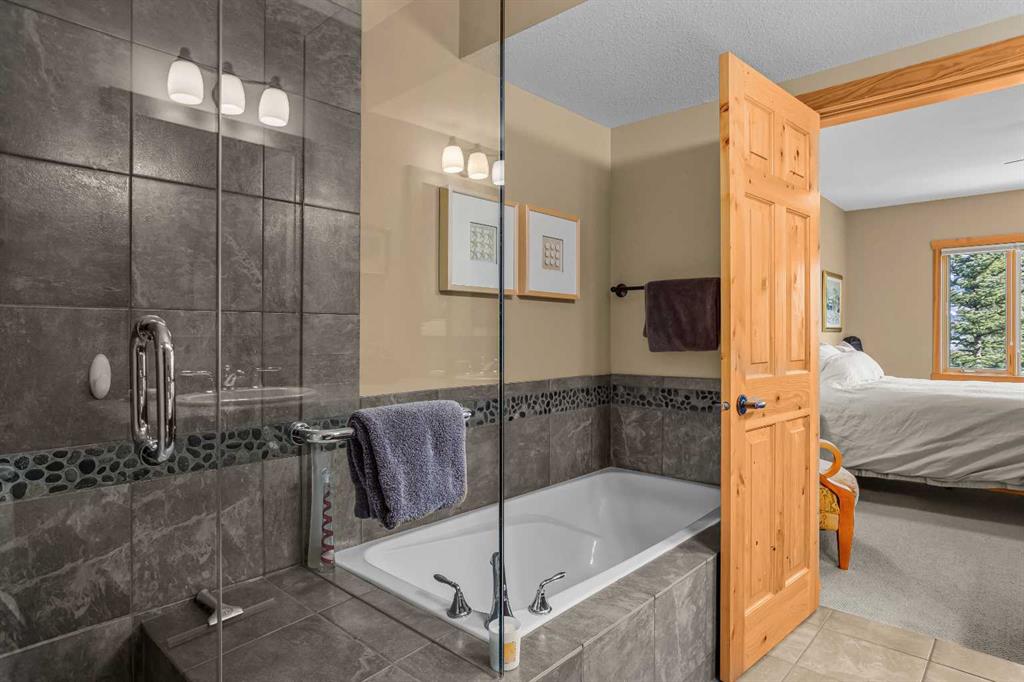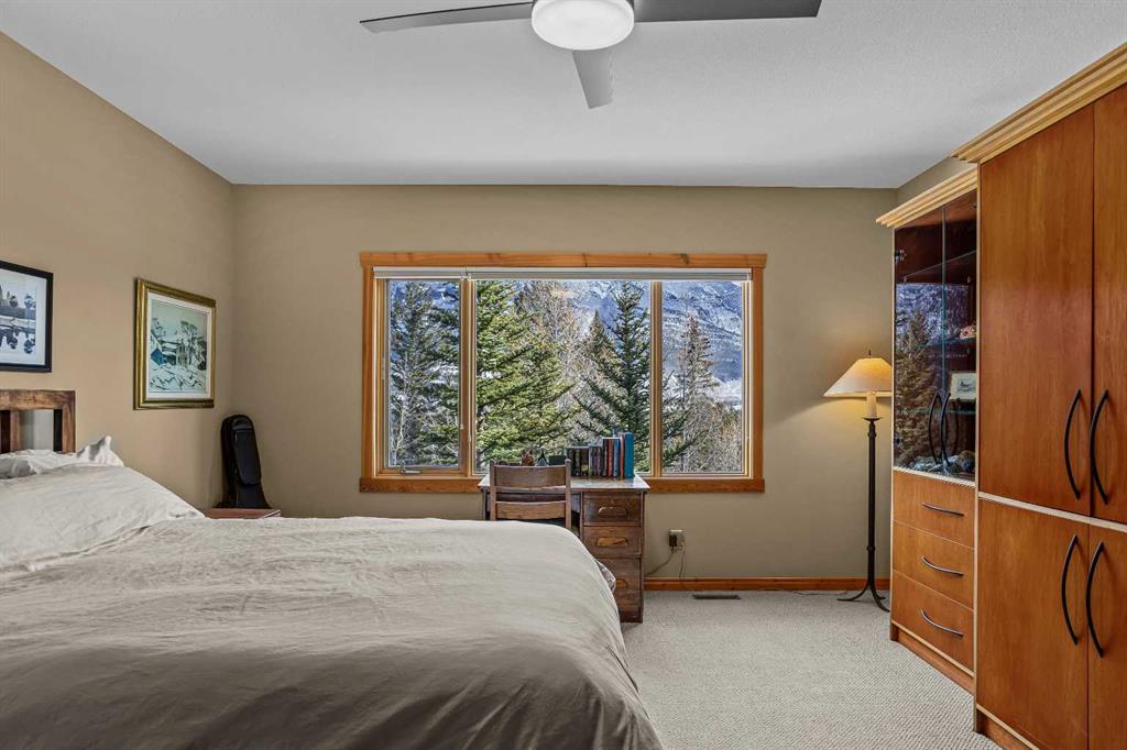The walkout lower level provides additional living space with separation between levels, ideal for guests, family, or multi-generational living. With five bedrooms and five bathrooms in total, the layout offers flexibility without compromising privacy. A tranquil backyard with a flagstone patio and fire pit, surrounded by mature trees, offers a private outdoor retreat that complements the home’s elevated setting. A double-car garage, expansive square footage, and a setting that combines elevation, views, and seclusion make this a rare opportunity in one of Canmore’s most sought-after communities.