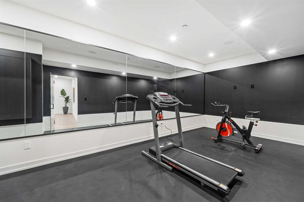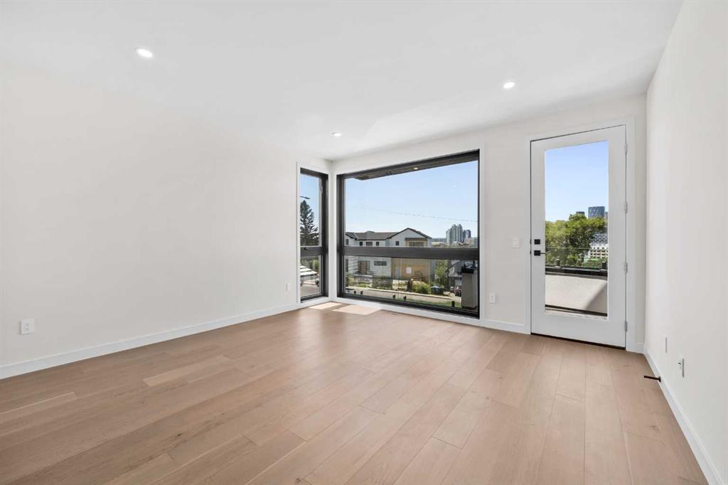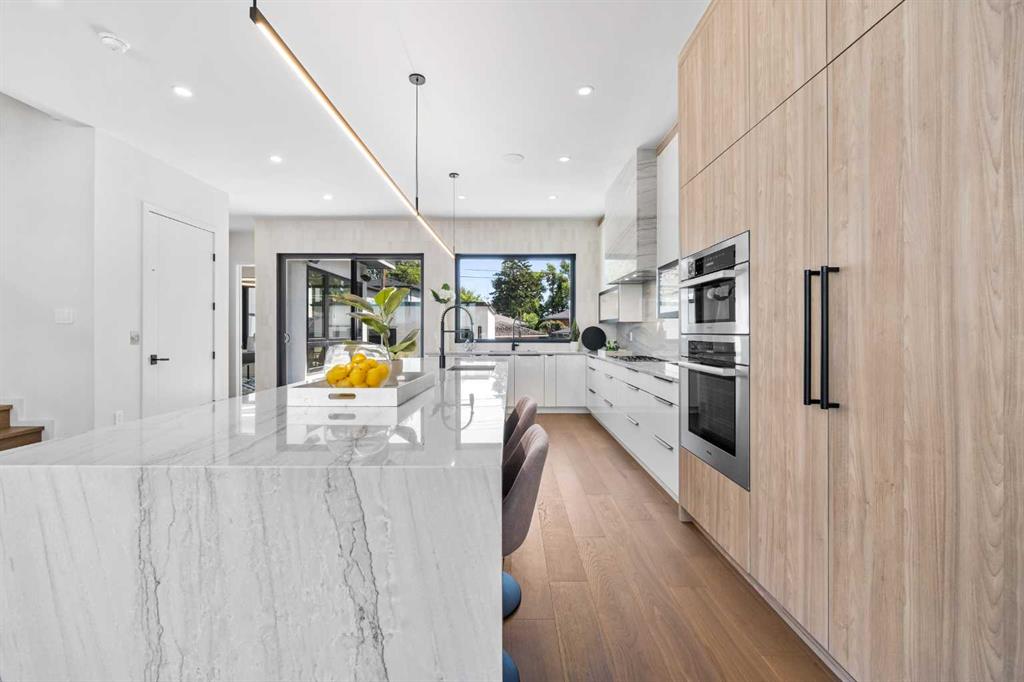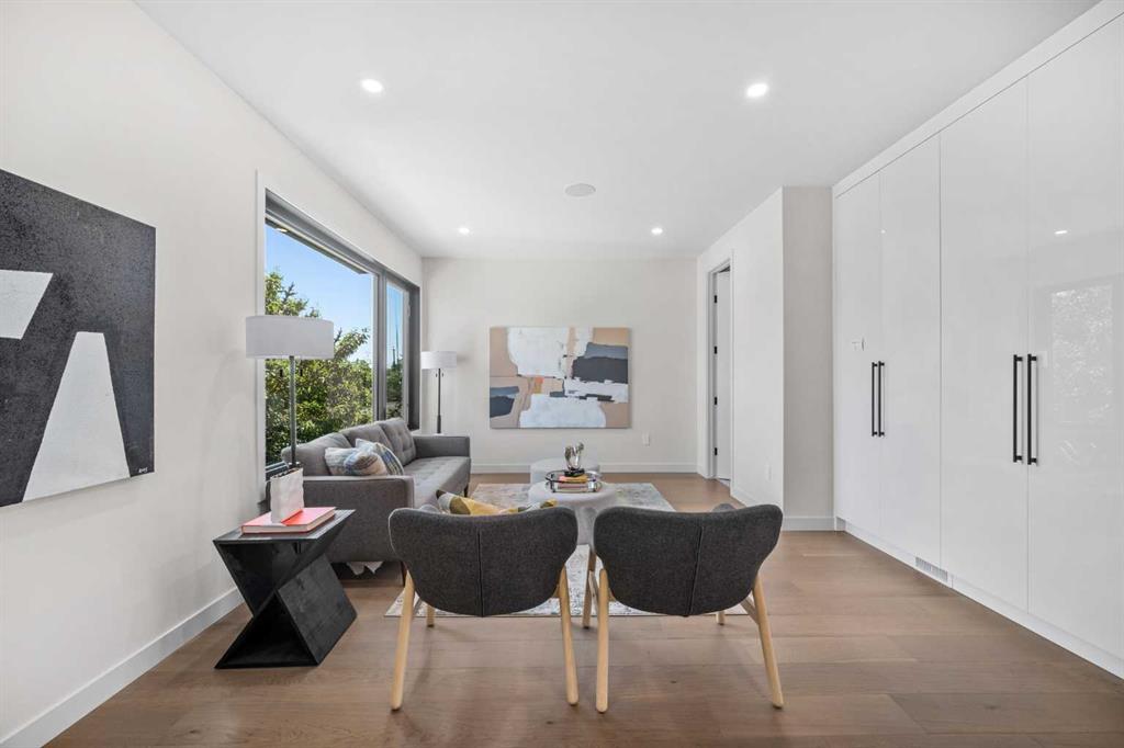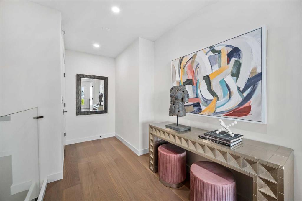 An architectural masterpiece by Silverpoint Custom Homes and Paul Lavoie Interior Design. Perched on a spectacular lot overlooking Bridgeland, and offering breathtaking views of the City and Rocky Mountains. A 5,200-square-foot gem, which seamlessly blends Hollywood Hills vibes, in a meticulous and one of a kind design. A fantastic open floor plan with a separate formal living and dining rooms overlooking the city. Boasting a truly magnificent kitchen, featuring a 13ft waterfall island and all MIELE appliances. Hardwood floors weave throughout the four levels including the basement, creating a harmonious atmosphere of seamless design. The main level surprises you with a hidden coat closet, a spacious mudroom, and a private den overlooking a backyard oasis with a large deck, (hot-tub ready) Move effortlessly between levels via the elevator or a captivating floor to ceiling glass-walled staircase leading to three generous bedrooms and a master top suite, simply like no other. The second floor offers 3 spacious bedrooms with panoramic city views from 2 bedrooms, private balconies, and a separate family lounge with access to a full guest bath. A fabulous laundry room and linen closet complete this level, not to mention large picture windows offering fulll sunrise worthy east views. The third-floor PRINCIPAL BEDROOM is a showstopper with a HUGE BALCONY showcasing the best panoramic city and mountain vews. A separate lounge area with coffee bar, fridge and a built in TV LIFT separate the bedroom area. As you enter the ensuite, flooded with natural light, a magical SMARTGLASS window gives you the option of privacy, or to enjoy the fabulous city views while soaking in the tub. A luxurious dual vanity, dual spa shower area surrounded by glass, featuring heated floors and shower bench. The walk-in wardrobe suite is a one of a kind dream space, with built in's that will rival a designer shop. Large skylights, a huge window and your own washer/dryer, make this the perfect dressing area. The lower level caters to the extended family and features a media area with full bar, gym, and a large bedroom. A full bath including a steam shower completes this level with all heated hardwood flooring. The outdoor spaces surrounding the house lets you indulge in extended year round outdoor living. A large front patio with a fire pit option, and seating lets you indulge in the west city and mountain views. The rear yard offers you a great dining space, and private relaxation areas with an optional hot tub, and a multi purpose sports area or green space. This home as expected includes all Smart home features, an elevator, extensive internal glass walls, AC, infloor heat, and an oversized garage with a full third car garage option which can be built prior to possession for the buyer. An amazingly unique home with modern, yet classic design elements, encompassing every luxury option a discerning home owner would desire in their dream home.