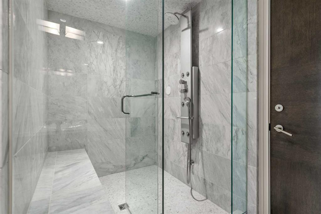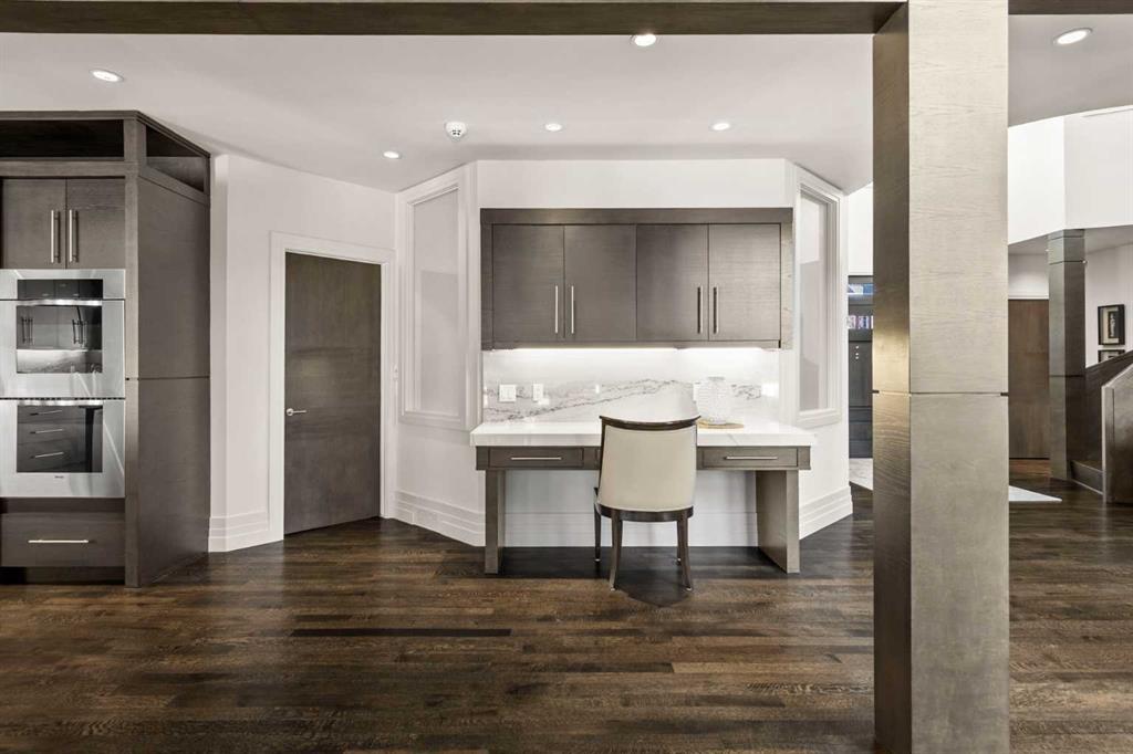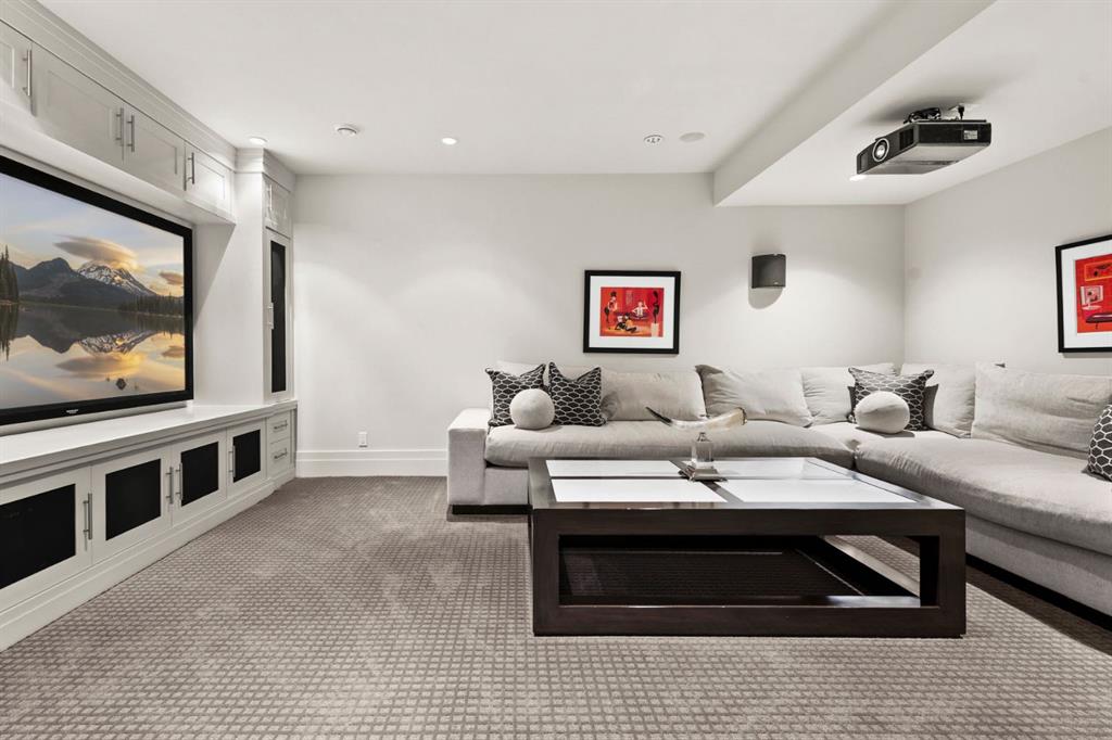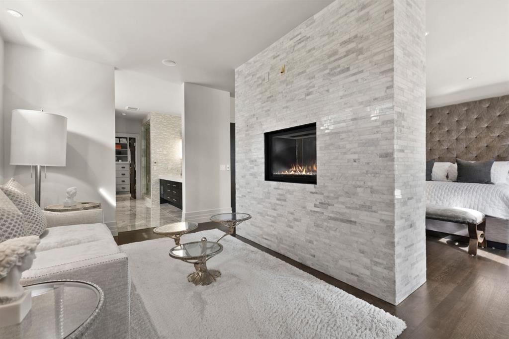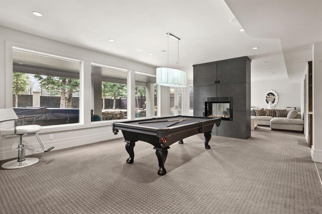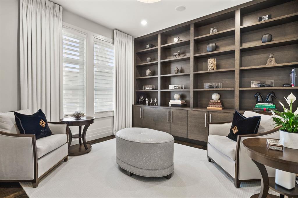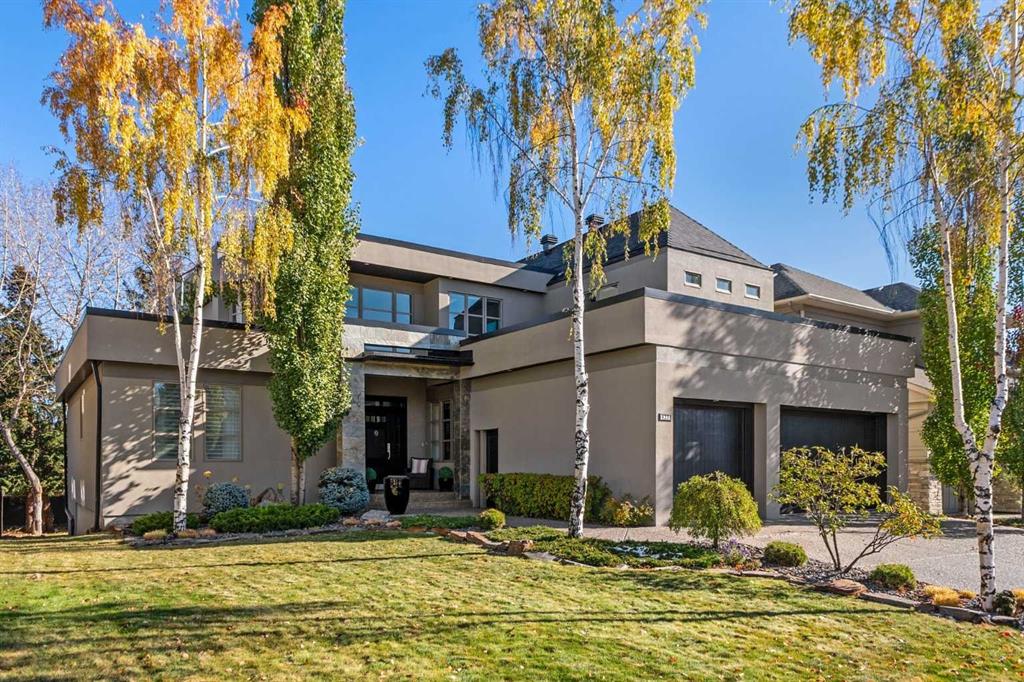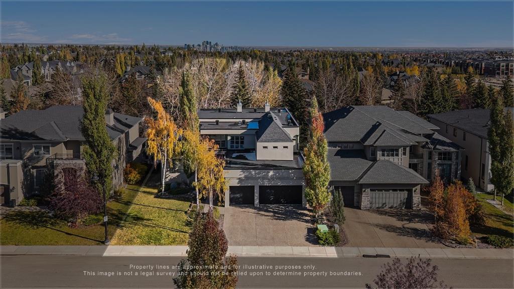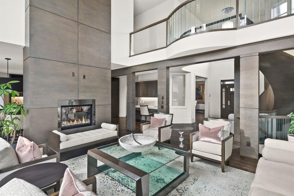 Set in the prestigious community of Aspen Estates, this custom-designed residence makes a striking architectural statement both inside and out, offering over 6,106 sq.ft. of meticulously developed living space and an expansive main level far larger than a traditional two-storey home. The moment you step inside, the soaring 19-ft foyer and living room—with dramatic double-height windows—creates an unforgettable sense of volume, light, and spatial drama, revealing the home’s strong architectural bones and meticulous detailing. Throughout the interior, rift-cut oak serves as a unifying design element, its refined linear grain expressed in both the extensive custom millwork and the sculptural floating staircase, lending a quiet, contemporary elegance that reinforces the home’s architectural coherence. Additional refined materials include recently refinished hardwood flooring, two-inch solid quartzite stone counters, three double-sided floor-to-ceiling fireplaces, heated floors throughout the bathrooms, lower level, and garage, solid core doors, and custom lighting and window coverings. The chef-inspired kitchen is both beautiful and functional, centered around a massive tiered quartz island and outfitted with Sub-Zero and Viking appliances and an expansive butler’s pantry, complemented by a formal dining room, a private office with built-ins, and a generously sized bedroom with full bathroom on this level. Above the open-to-below living area, an architectural catwalk floats through the space, leading to the bedroom wing where the serene primary suite offers extensive built-ins, a large walk-in closet, a marble floor-to-ceiling surround two-way fireplace, a peaceful sitting area, and a spa-inspired ensuite with heated floors, soaker tub, and steam shower, along with two additional bedrooms each with their own ensuite and walk-in closet. The lower level is designed for indulgent relaxation and entertaining, featuring a spacious recreation area, wet bar, theatre room, dedicated fitness room, a fifth bedroom, and a luxurious bathroom with steam shower, all kept perfectly comfortable year-round with in-floor heating and dual A/C units. Outside, the private, tree-lined backyard feels like a secluded retreat, offering upper and lower decks, expansive irrigated greenspace, and exceptional privacy. With Rundle College, the C-Train, Aspen Landing, and Westside Recreation Centre all within walking distance—and Webber Academy, Calgary Academy, and CFIS just minutes away—this home offers a rare blend of architectural beauty, lifestyle convenience, and effortless access to both downtown and the mountains.