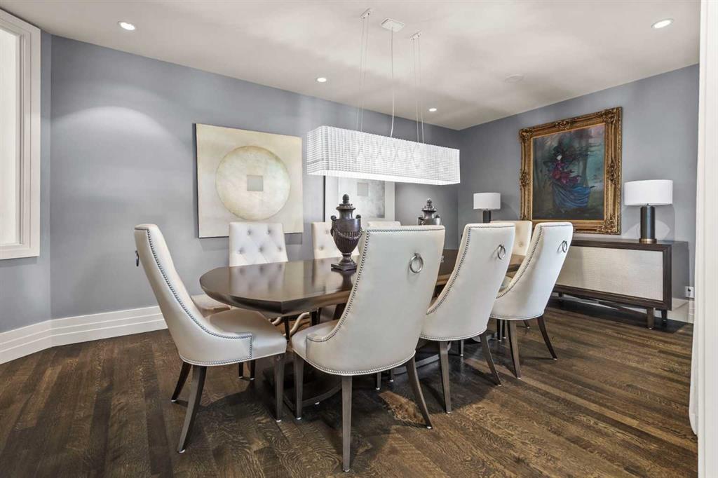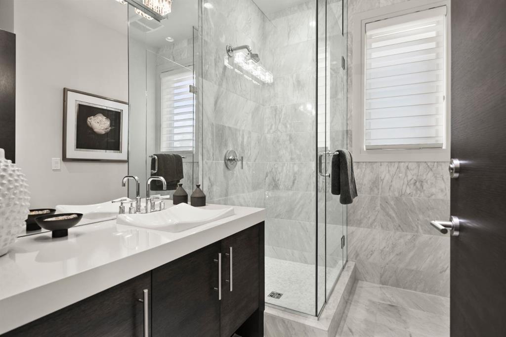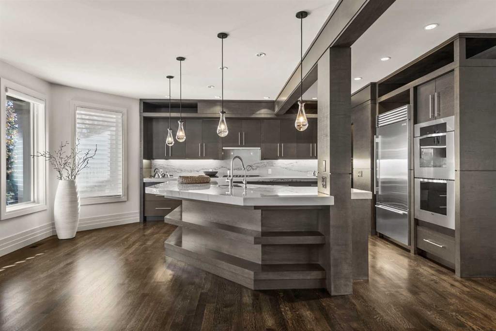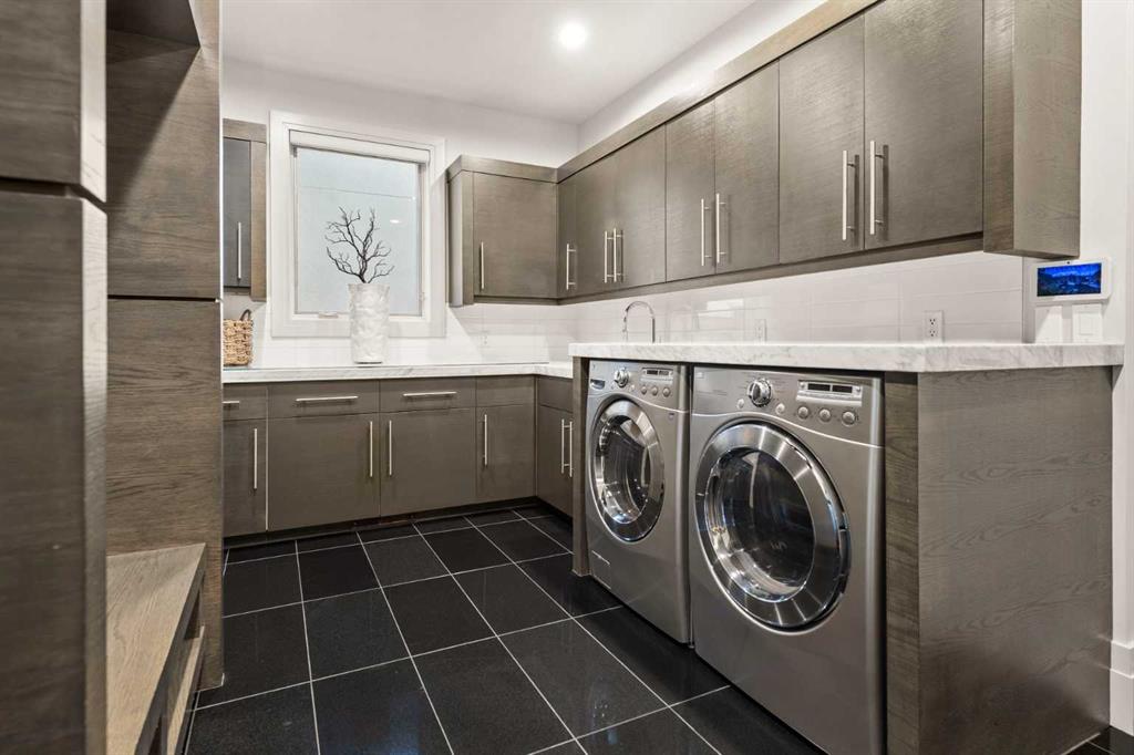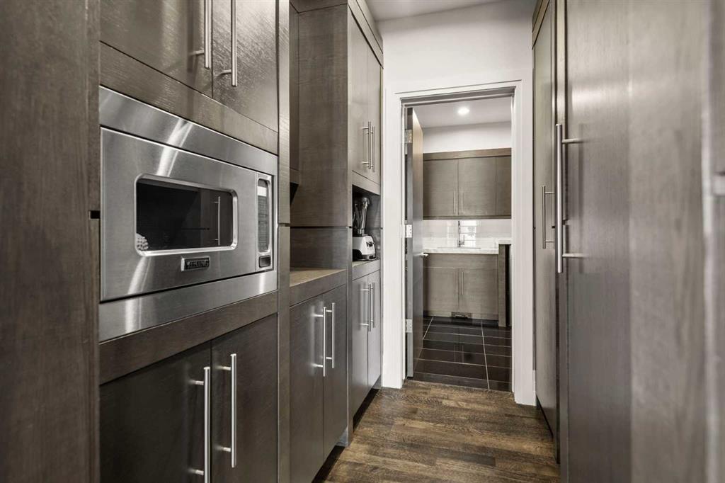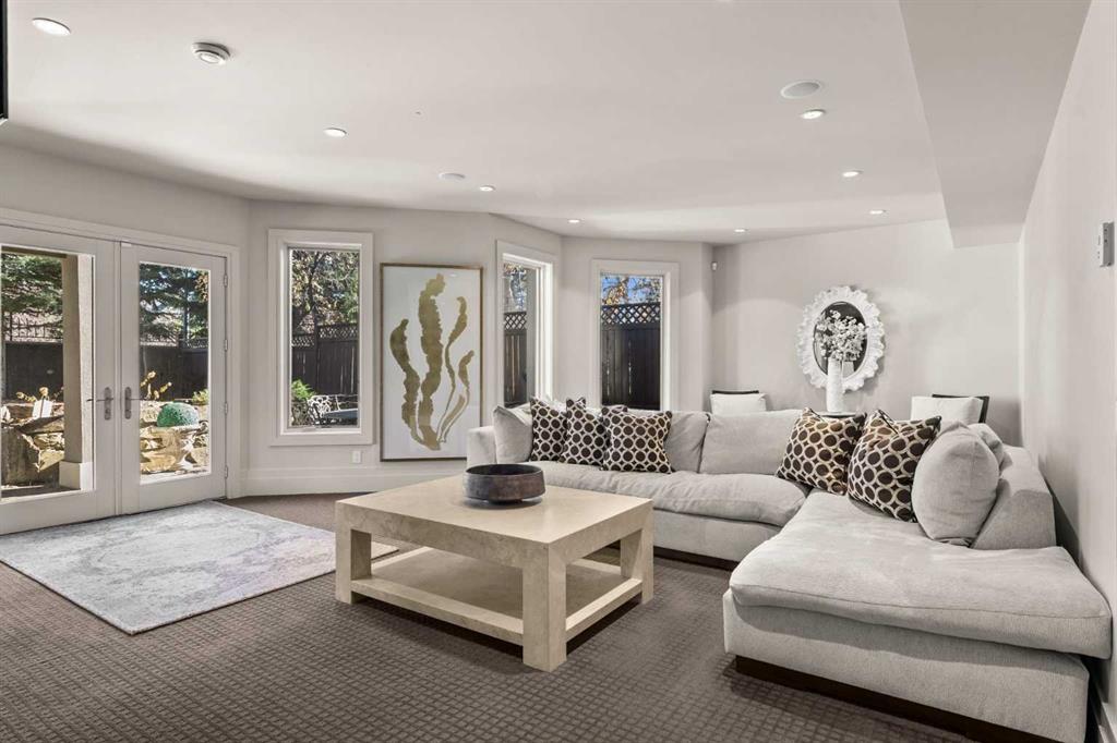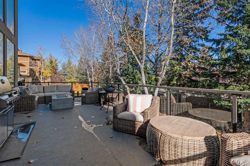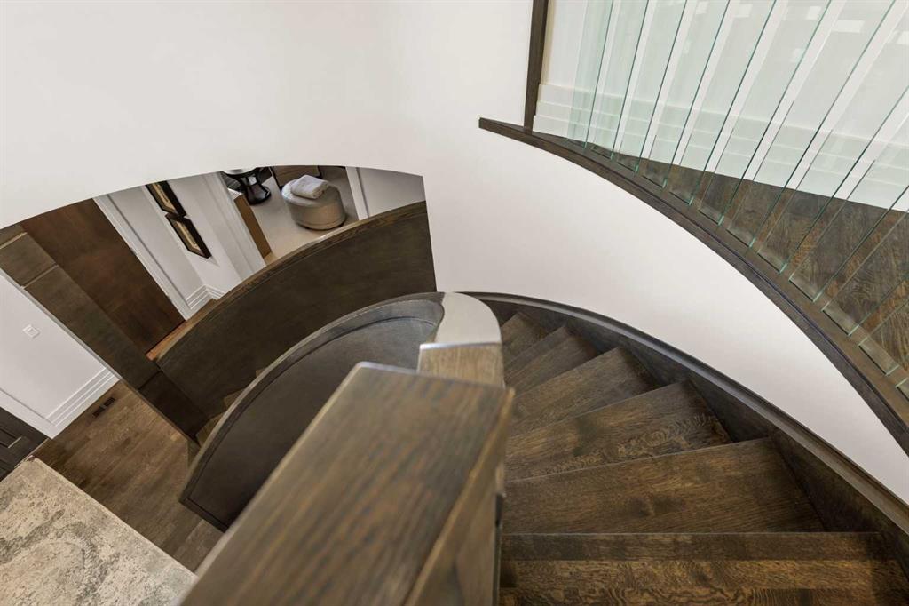 Set in the prestigious community of Aspen Estates, this custom-designed residence makes a striking architectural statement both inside and out, offering over 6,106 sq.ft. of meticulously developed living space and an expansive main level far larger than a traditional two-storey home. The moment you step inside, the soaring 19-ft foyer and living room—with dramatic double-height windows—creates an unforgettable sense of volume, light, and spatial drama, revealing the home’s strong architectural bones and meticulous detailing. Throughout the interior, rift-cut oak serves as a unifying design element, its refined linear grain expressed in both the extensive custom millwork and the sculptural floating staircase, lending a quiet, contemporary elegance that reinforces the home’s architectural coherence. Additional refined materials include recently refinished hardwood flooring, two-inch solid quartzite stone counters, three double-sided floor-to-ceiling fireplaces, heated floors throughout the bathrooms, lower level, and garage, solid core doors, and custom lighting and window coverings. The chef-inspired kitchen is both beautiful and functional, centered around a massive tiered quartz island and outfitted with Sub-Zero and Viking appliances and an expansive butler’s pantry, complemented by a formal dining room, a private office with built-ins, and a generously sized bedroom with full bathroom on this level. Above the open-to-below living area, an architectural catwalk floats through the space, leading to the bedroom wing where the serene primary suite offers extensive built-ins, a large walk-in closet, a marble floor-to-ceiling surround two-way fireplace, a peaceful sitting area, and a spa-inspired ensuite with heated floors, soaker tub, and steam shower, along with two additional bedrooms each with their own ensuite and walk-in closet. The lower level is designed for indulgent relaxation and entertaining, featuring a spacious recreation area, wet bar, theatre room, dedicated fitness room, a fifth bedroom, and a luxurious bathroom with steam shower, all kept perfectly comfortable year-round with in-floor heating and dual A/C units. Outside, the private, tree-lined backyard feels like a secluded retreat, offering upper and lower decks, expansive irrigated greenspace, and exceptional privacy. With Rundle College, the C-Train, Aspen Landing, and Westside Recreation Centre all within walking distance—and Webber Academy, Calgary Academy, and CFIS just minutes away—this home offers a rare blend of architectural beauty, lifestyle convenience, and effortless access to both downtown and the mountains.