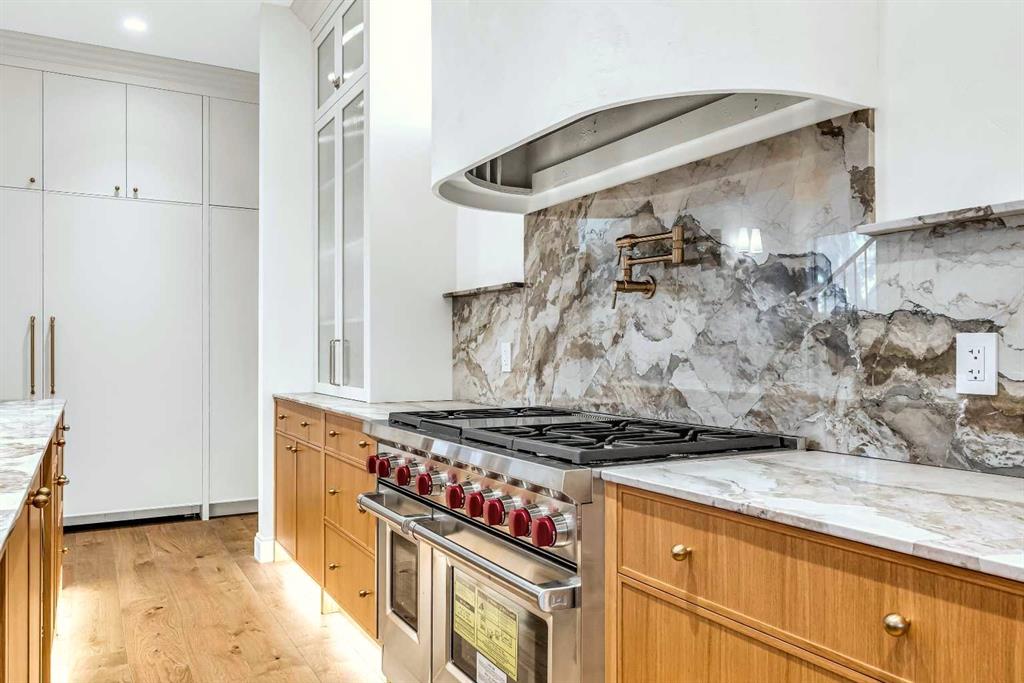 Inside, 10-ft ceilings create a light, refined atmosphere. The MAIN level features a formal dining room, custom wet bar pantry, and a warm living space anchored by a custom Urbana fireplace. The chef’s kitchen impresses with marble counters, bespoke cabinetry, and a full Wolf/Sub-Zero appliance package — including a 48” gas range, built-in steam oven, 3x under-counter fridges, and wine cooler.