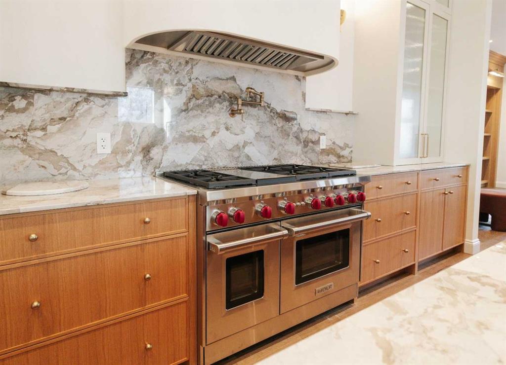Inside, 10-ft ceilings create a light, refined atmosphere. The MAIN level features a formal dining room, custom wet bar pantry, and a warm living space anchored by a custom Urbana fireplace. The chef’s kitchen impresses with marble counters, bespoke cabinetry, and a full Wolf/Sub-Zero appliance package — including a 48” gas range, built-in steam oven, 3x under-counter fridges, and wine cooler.