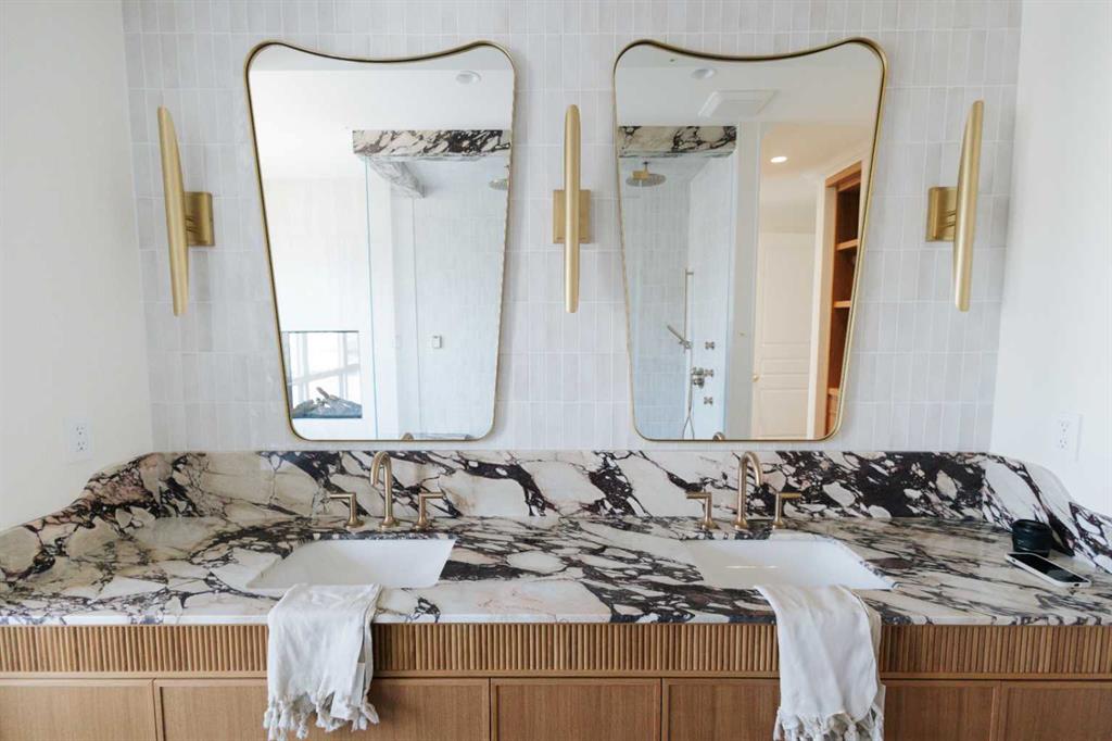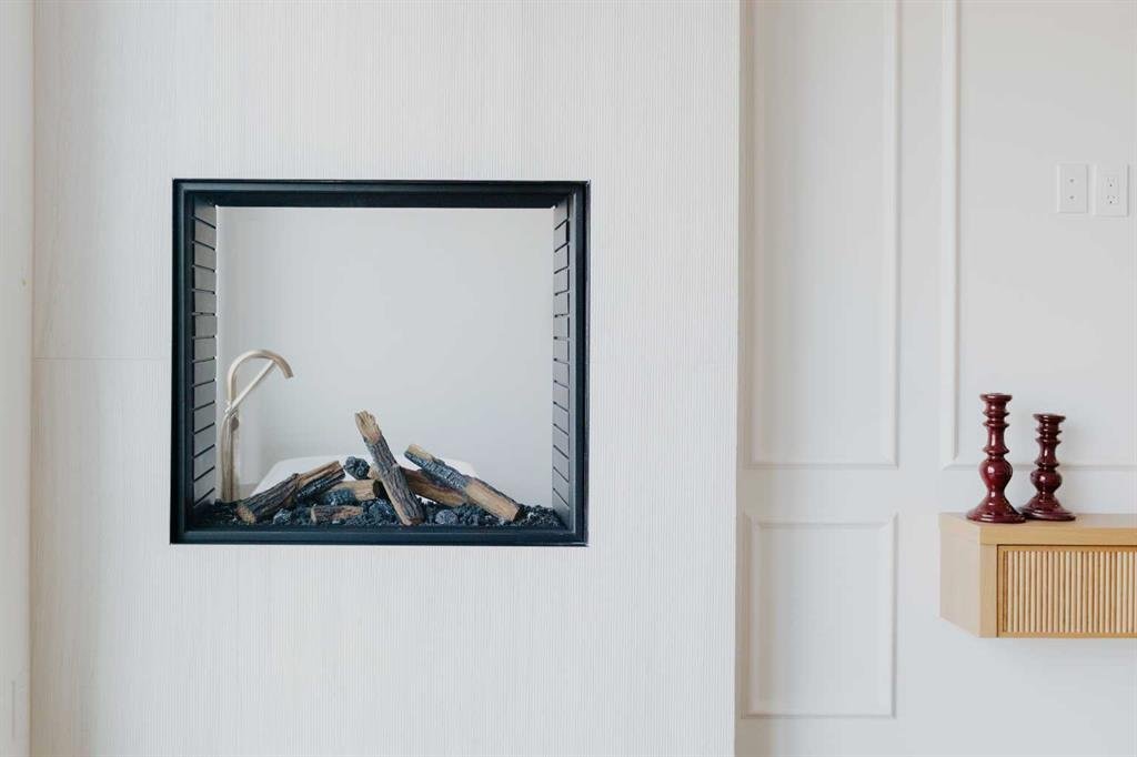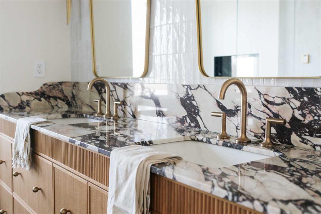 Upstairs, the PRIMARY suite exudes sophistication, featuring a matching double-sided Urbana fireplace, custom walk-in closets, and a spa-inspired ensuite with Calacatta Viola marble, a steam shower, his-and-hers sinks, soaker tub, and heated bench & floor. Two additional bedrooms each offer private ensuites and walk-in closets.