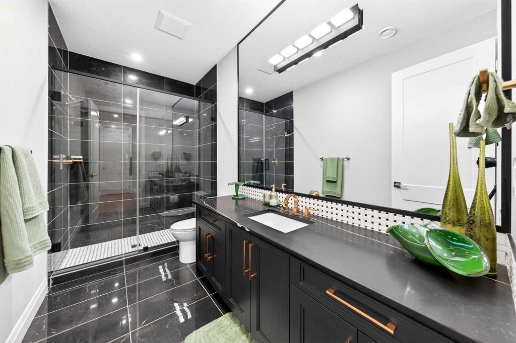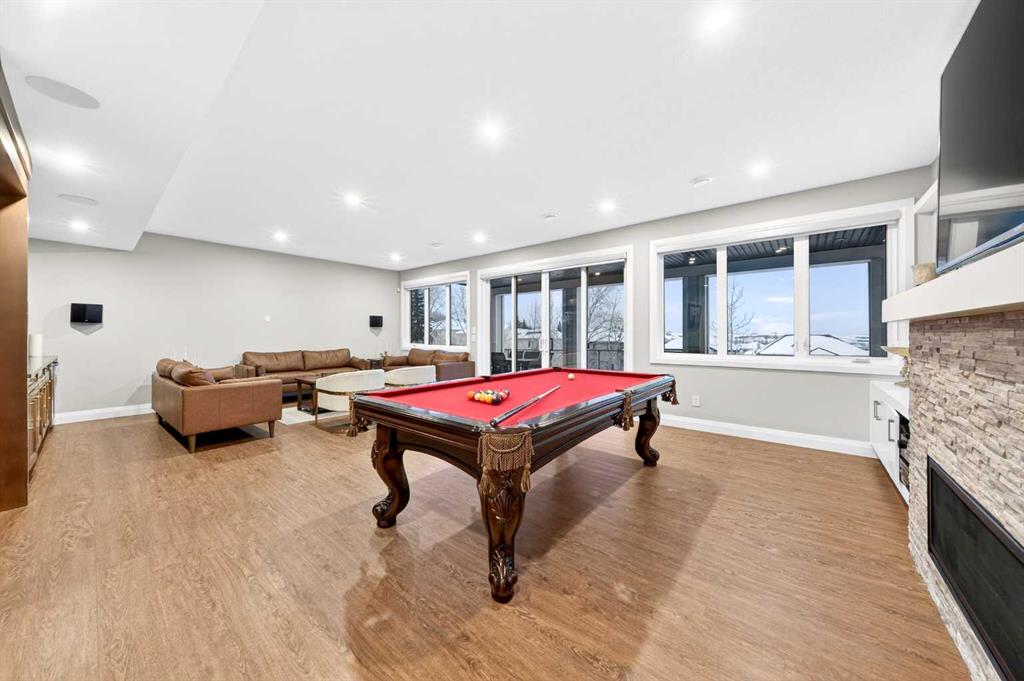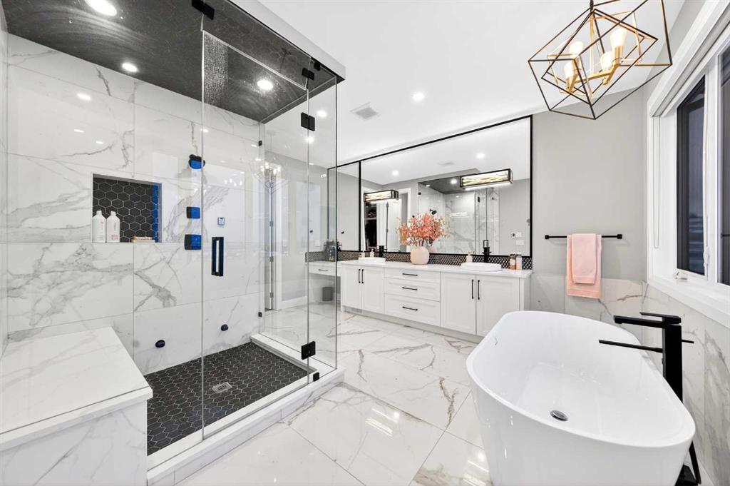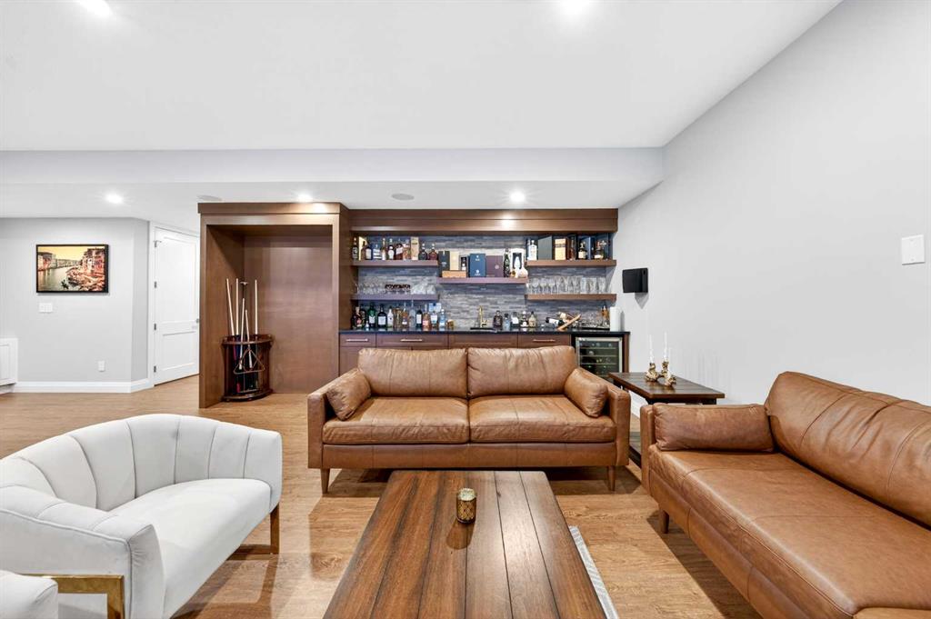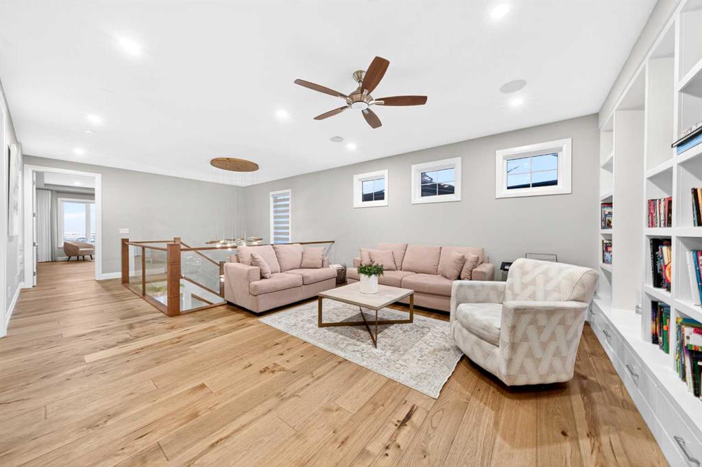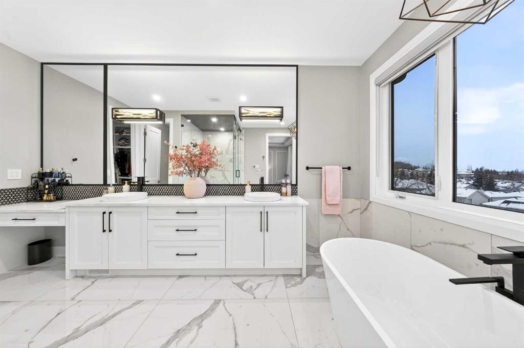 The upper level features 9-ft ceilings and engineered hardwood flooring throughout. A centre Bonus Room provides the perfect space for a media lounge or children’s play area. The luxurious Primary Suite, along with two secondary suites, include heated floors, a spa-inspired ensuite with double vanity, steam shower, freestanding soaking tub, and a spacious walk-in closet with organizers. Three additional bedrooms each include their own ensuite and walk-in closet, complemented by an upper-level laundry room with sink and cabinetry.