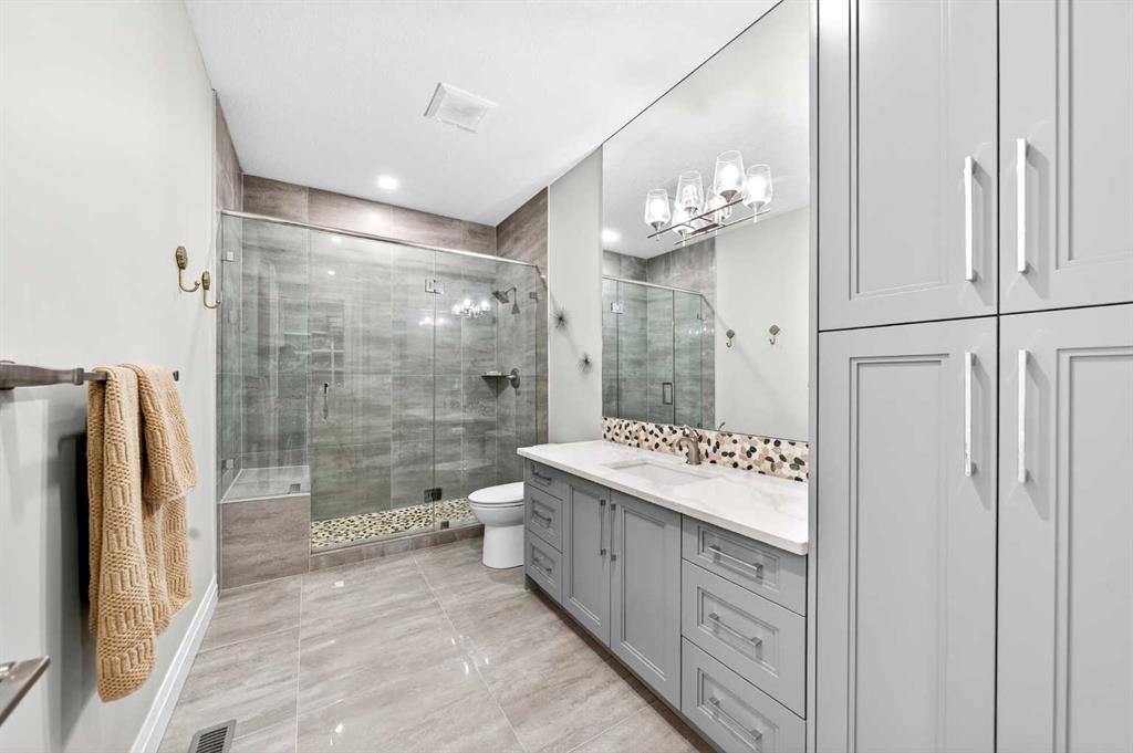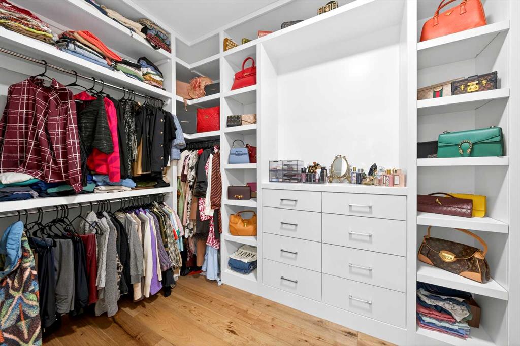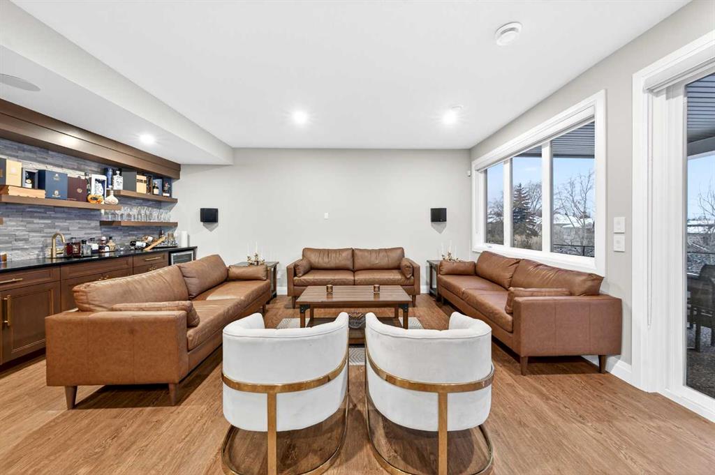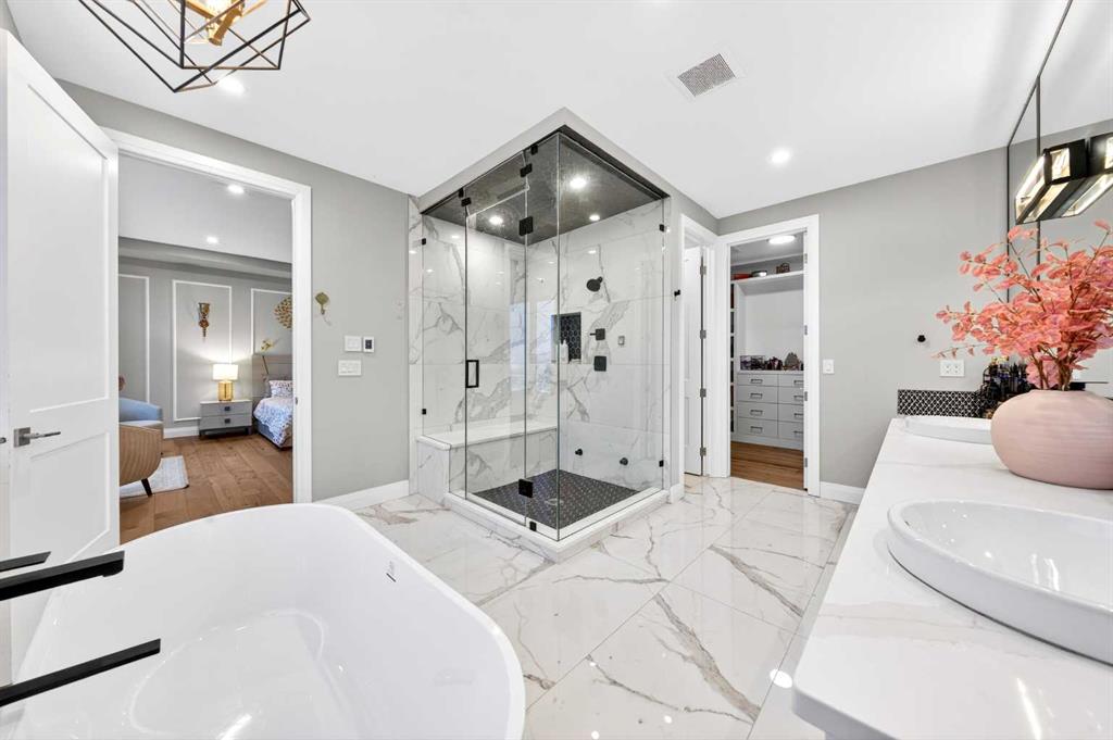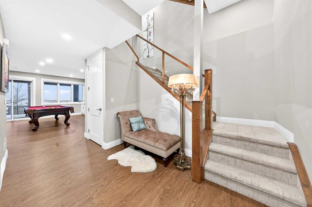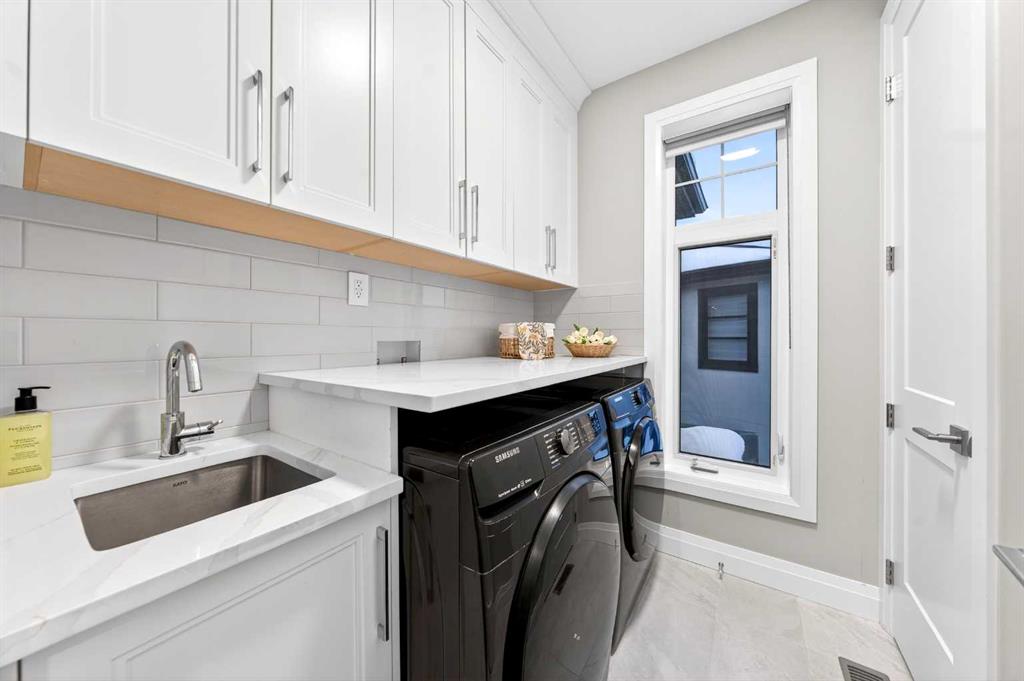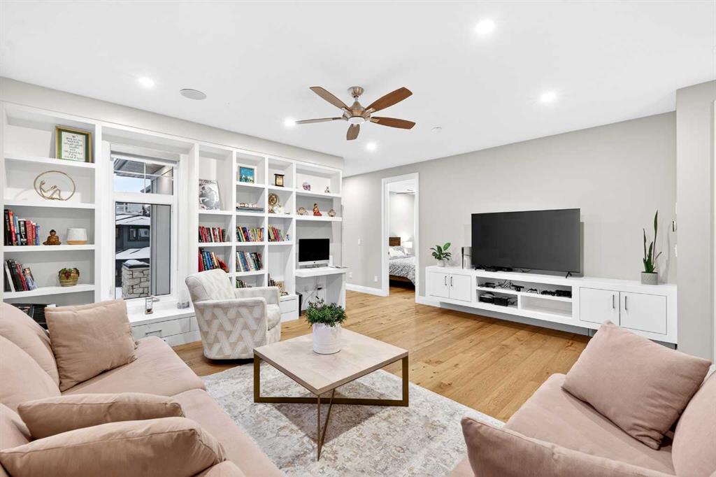 The upper level features 9-ft ceilings and engineered hardwood flooring throughout. A centre Bonus Room provides the perfect space for a media lounge or children’s play area. The luxurious Primary Suite, along with two secondary suites, include heated floors, a spa-inspired ensuite with double vanity, steam shower, freestanding soaking tub, and a spacious walk-in closet with organizers. Three additional bedrooms each include their own ensuite and walk-in closet, complemented by an upper-level laundry room with sink and cabinetry.
