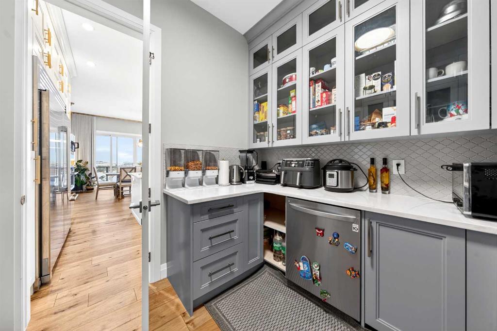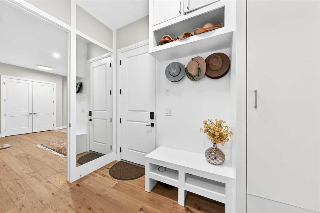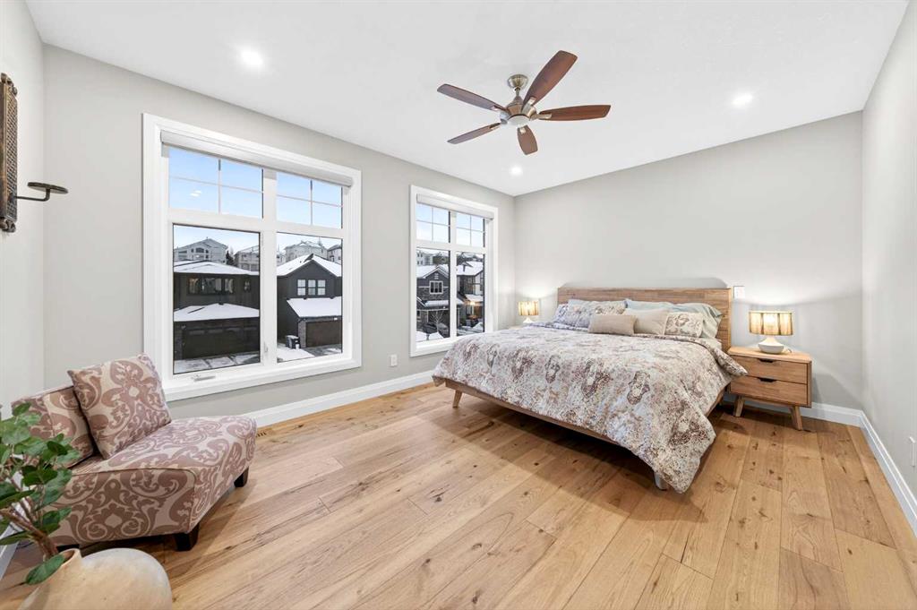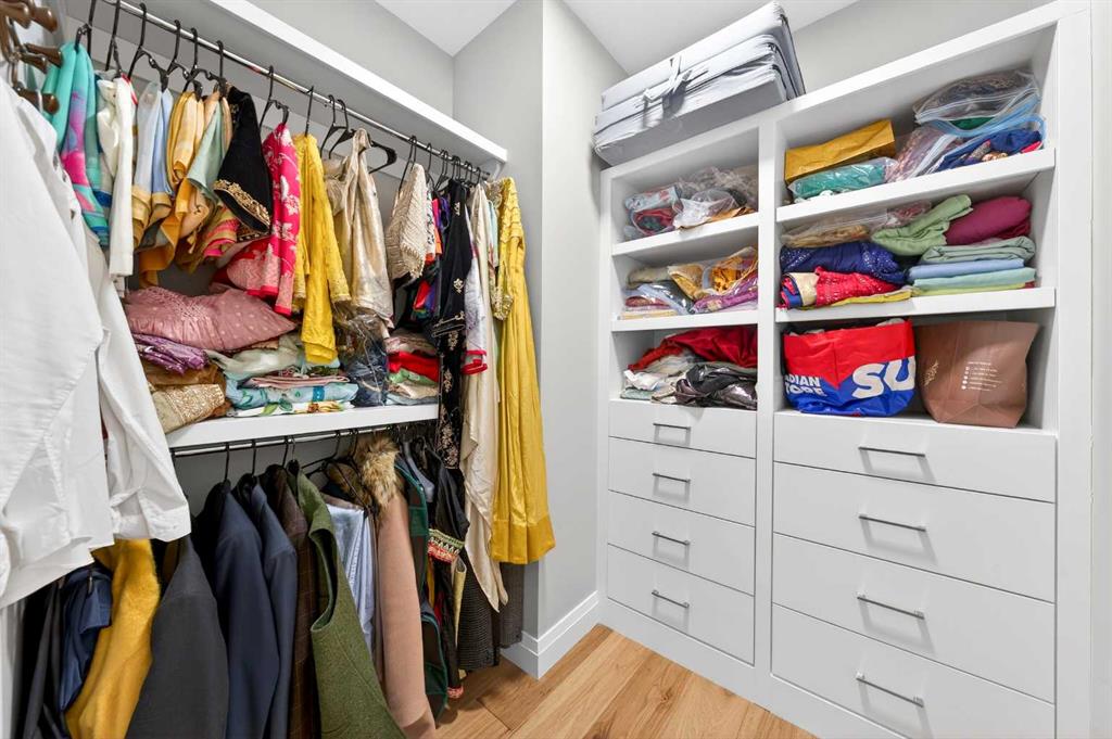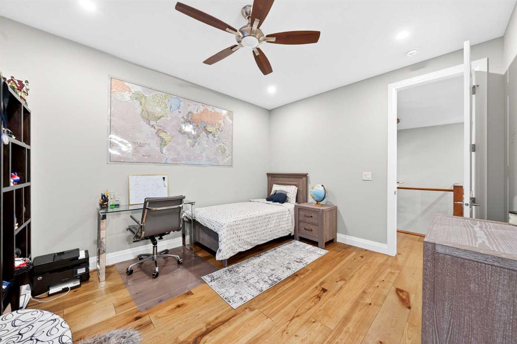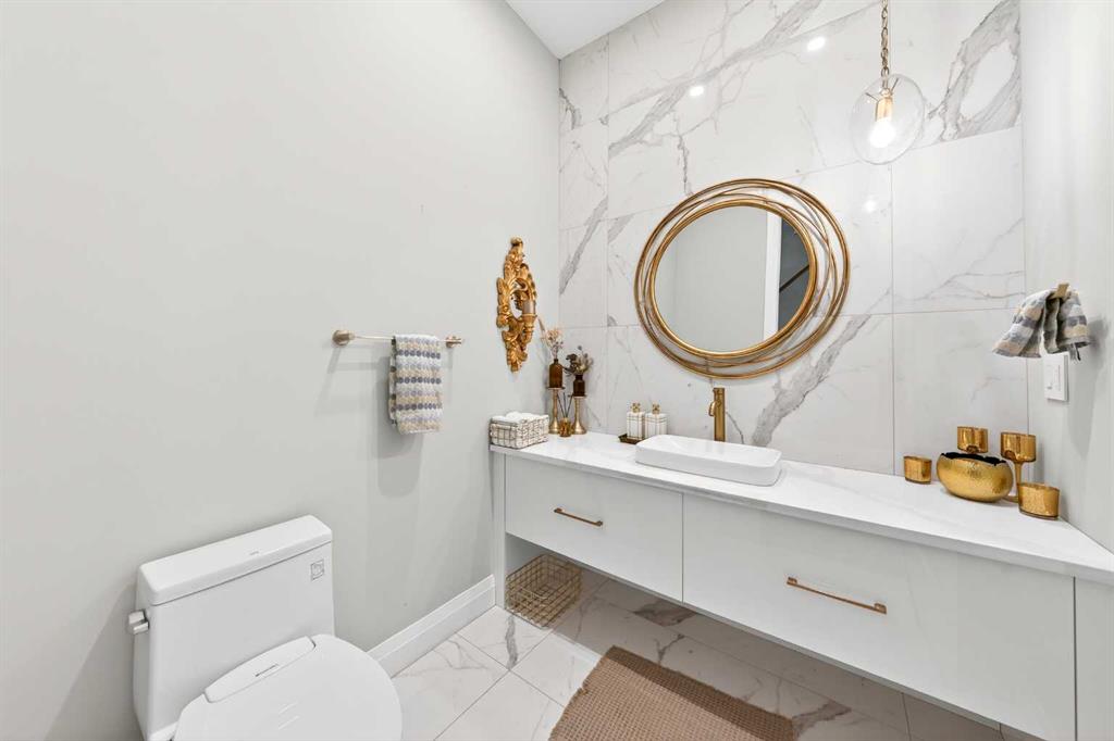 The upper level features 9-ft ceilings and engineered hardwood flooring throughout. A centre Bonus Room provides the perfect space for a media lounge or children’s play area. The luxurious Primary Suite, along with two secondary suites, include heated floors, a spa-inspired ensuite with double vanity, steam shower, freestanding soaking tub, and a spacious walk-in closet with organizers. Three additional bedrooms each include their own ensuite and walk-in closet, complemented by an upper-level laundry room with sink and cabinetry.