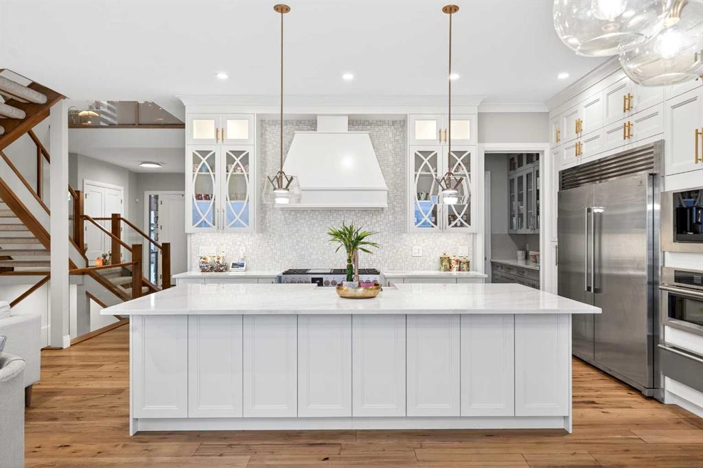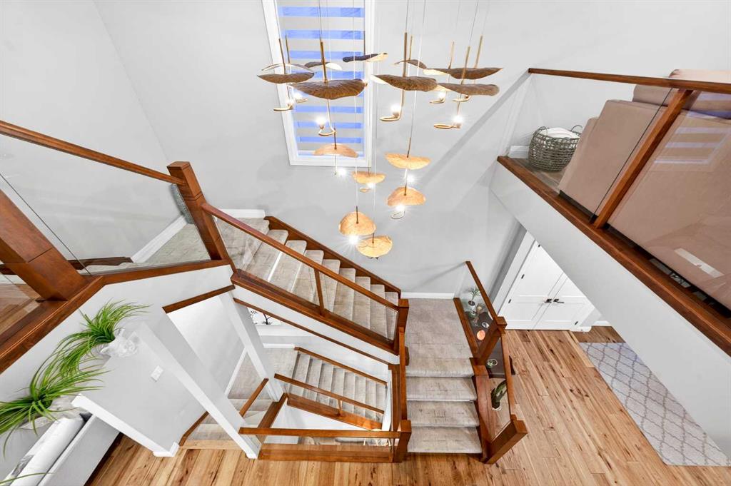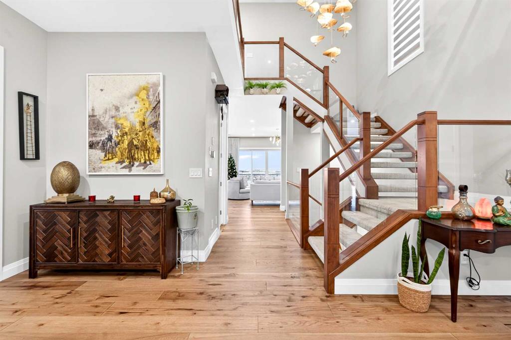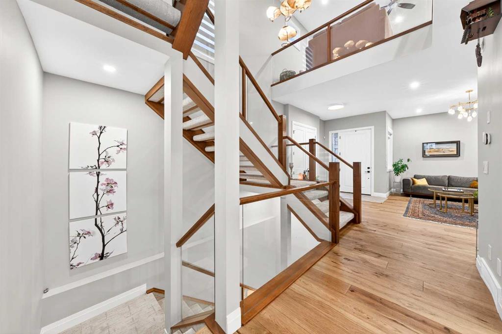 The main floor welcomes you with a dramatic 10-ft ceiling, upgraded lighting, and engineered hardwood flooring throughout. At the heart of the home, the gourmet white Kitchen is a chef’s dream, featuring a large centre island, ample cabinetry with golden hardware, stainless steel appliances including an Electrolux full-size side by side Fridge and Freezer, Fulgor Milano 6-burner stove, wall oven, built-in coffee machine, beverage fridge, two dishwashers, and a walk-through pantry with sink and abundant storage. The Kitchen opens to the Family Room and Dining Room, both with double sliding patio doors that flood the space with natural light and provide access to a full-size deck with gas hookup. From the deck, enjoy Unobstructed view of the north and walking path, extending to distant horizons, and a stunning night view that’s simply breathtaking. A stunning open-riser staircase with stain-grade glass railings connects the main and upper levels, enhancing the open and airy ambiance.