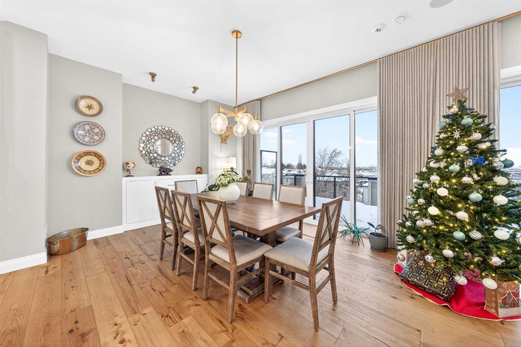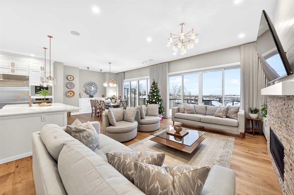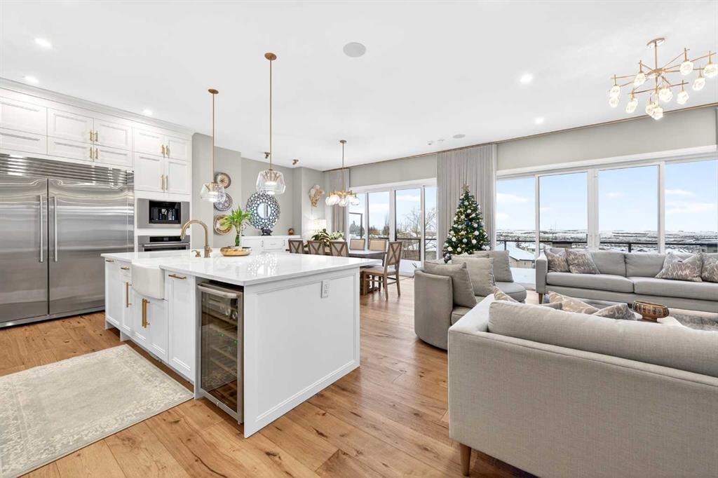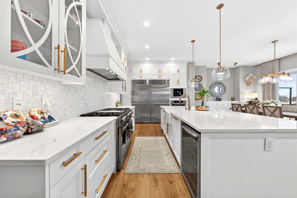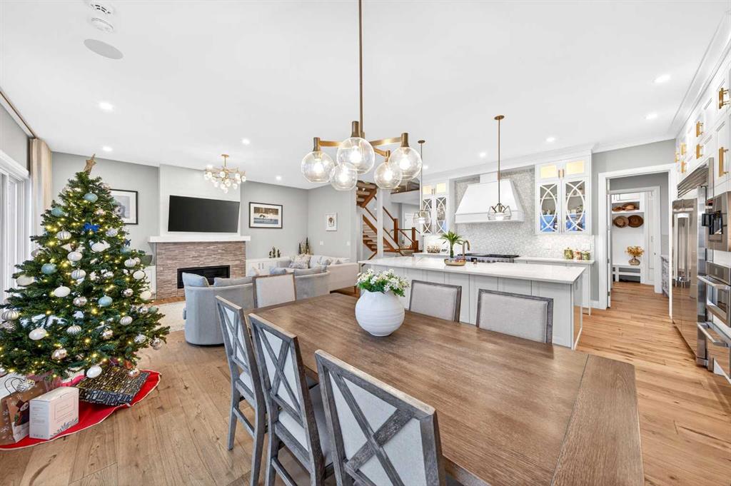 The main floor welcomes you with a dramatic 10-ft ceiling, upgraded lighting, and engineered hardwood flooring throughout. At the heart of the home, the gourmet white Kitchen is a chef’s dream, featuring a large centre island, ample cabinetry with golden hardware, stainless steel appliances including an Electrolux full-size side by side Fridge and Freezer, Fulgor Milano 6-burner stove, wall oven, built-in coffee machine, beverage fridge, two dishwashers, and a walk-through pantry with sink and abundant storage. The Kitchen opens to the Family Room and Dining Room, both with double sliding patio doors that flood the space with natural light and provide access to a full-size deck with gas hookup. From the deck, enjoy Unobstructed view of the north and walking path, extending to distant horizons, and a stunning night view that’s simply breathtaking. A stunning open-riser staircase with stain-grade glass railings connects the main and upper levels, enhancing the open and airy ambiance.