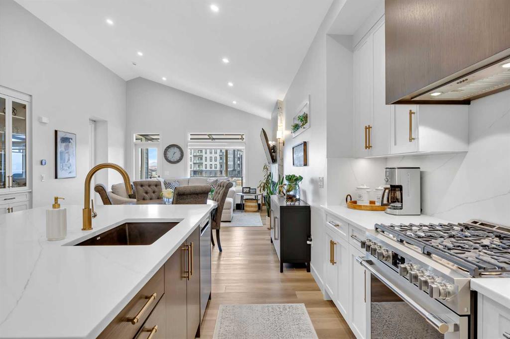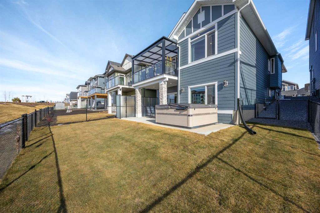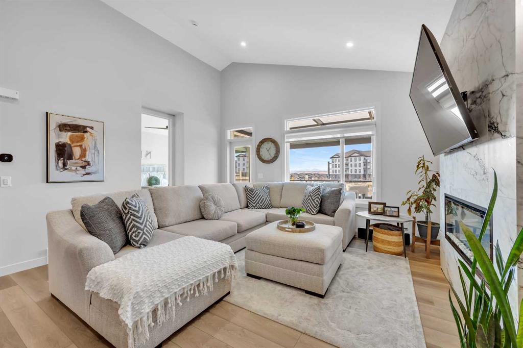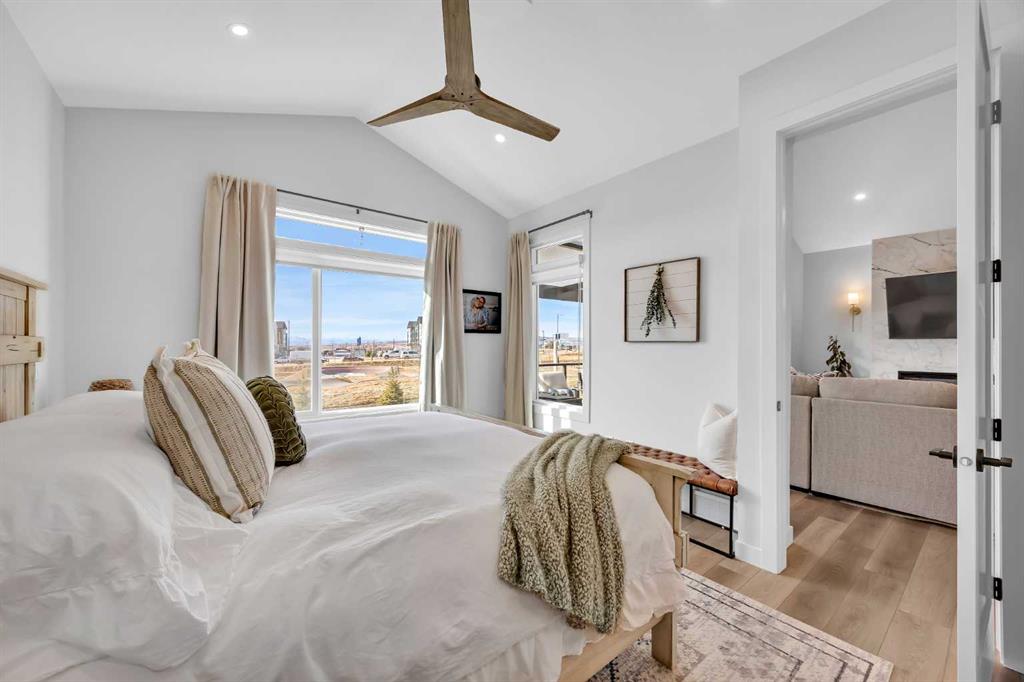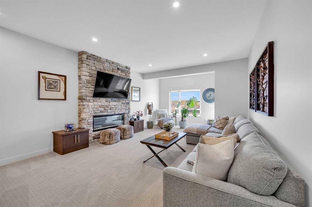 Welcome to an exceptional walkout bungalow offering over 2,500 square feet of fully developed living space, mountain views, and a layout designed for both everyday comfort and entertaining. Featuring three bedrooms, two and a half bathrooms, a main floor den, a dedicated gym, and a fully finished walkout basement with a built in wet bar, this extensively upgraded home delivers a rare combination of space, style, and function in Wedderburn, Okotoks. The main level features soaring vaulted ceilings and expansive windows that fill the home with natural light. The open concept layout centers around a chef inspired kitchen with quartz countertops, a large central island, full height cabinetry, and a custom built in hutch that adds both function and style. The great room is anchored by a striking linear fireplace, creating a warm and inviting space to gather. The primary suite is a true retreat, complete with a spacious walk in closet and a beautifully finished ensuite with dual vanities, a soaker tub, and a fully tiled shower. A main floor den provides flexible space for a home office, hobby room, or quiet sitting area. The mudroom and laundry area off the double attached garage are thoughtfully designed with built in cabinetry, quartz counters, and excellent storage. The fully developed walkout basement expands your living space with two additional bedrooms, a full bathroom, a dedicated gym area, and a spacious recreation room featuring a second fireplace and a built in wet bar, ideal for hosting or relaxing. Step outside to the lower patio and enjoy the outdoor connection this walkout lifestyle provides. Located in Wedderburn, a growing Okotoks community with pathways, parks, and convenient access to local amenities and Calgary, this is a rare opportunity to own a highly upgraded walkout bungalow with executive level finishings.
