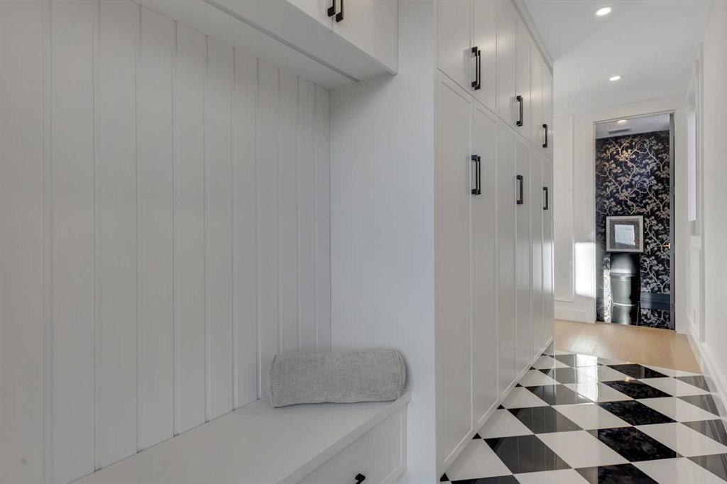 The living room is warm and inviting, anchored by a gas fireplace with a tiled surround and a floating oak media feature. Large sliding doors open to the backyard, flooding the space with natural light and creating a seamless indoor-outdoor connection. At the rear, a spacious mudroom with custom built-ins continues the home’s thoughtful approach to storage, while a beautifully finished powder room completes the main level.