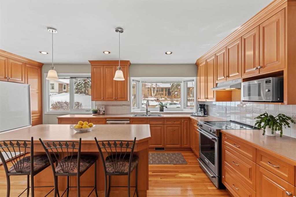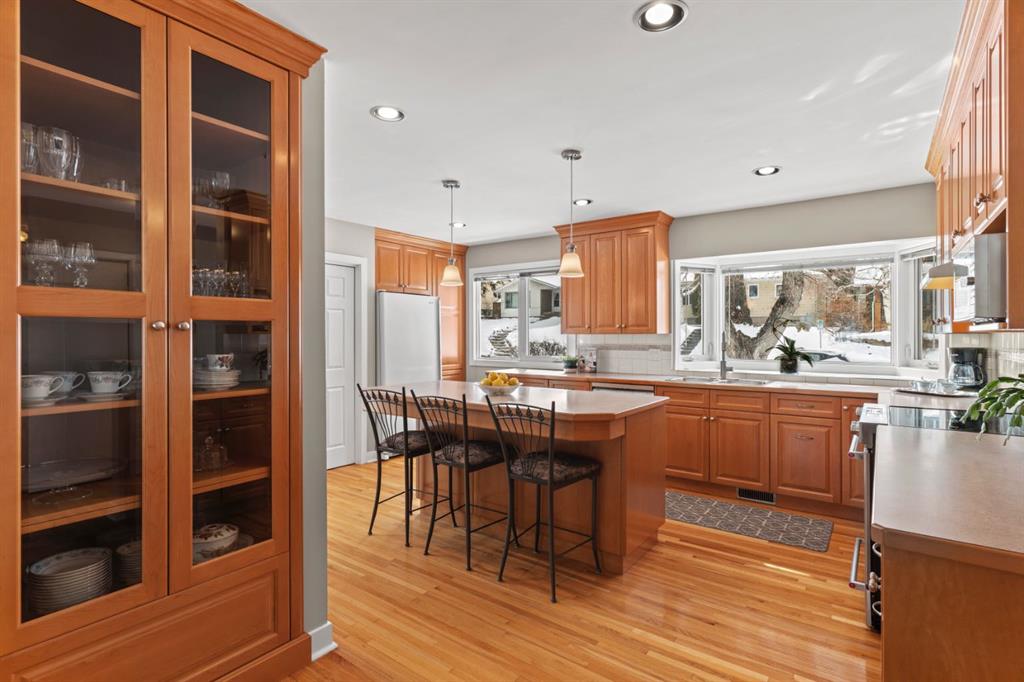 Look beyond the usual inner-city infill and take a look at this! A move-in ready, 5-bedroom bungalow on a full-sized lot in sought-after St. Andrews Heights. Offering 1,345 sq ft on an oversized 54’ x 134’ lot, this lovingly maintained home has been meticulously cared for by long-term owners and thoughtfully updated over the years—combining the durability of a classic bungalow with modern comfort. Set on a quiet, tree-lined street with mature landscaping and excellent curb appeal, you’re just steps to parks, pathways, and schools, with quick access to Foothills Medical Centre, Alberta Children’s Hospital, the University of Calgary, and downtown. Inside, a bright and thoughtful main floor layout features hardwood floors, an expanded living room with a wall of windows overlooking the backyard, and an updated kitchen with maple cabinetry, generous counter space, pantry, and a central island with seating. A full dining area connects seamlessly to the living space, while three bedrooms and an updated 4-piece bath complete the level. The fully developed basement adds two additional bedrooms, a 3-piece bath, ample storage, and a spacious rec room—ideal for family, guests, or home office flexibility. Extensive updates—including windows, furnace (2023), appliances, roof, and more—offer true move-in ready confidence, while the oversized lot and double detached garage provide both immediate enjoyment and future potential. A rare opportunity—and exceptional value—in one of Calgary’s most established inner-city communities.