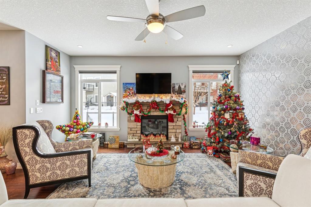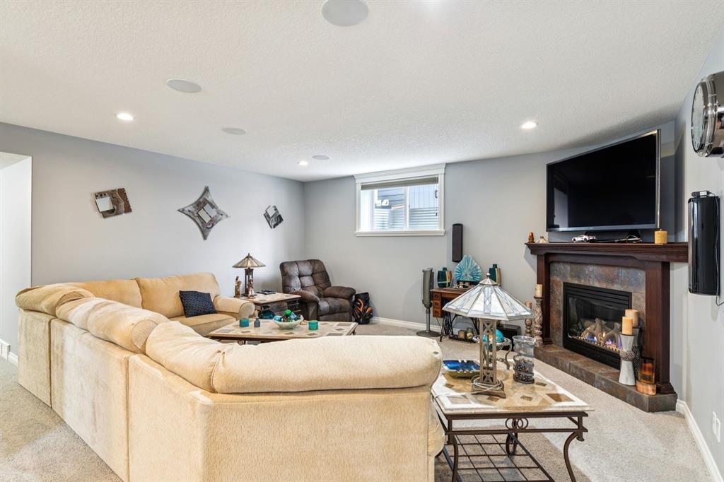 The fully finished basement extends the living space with 8'7" ceilings, a large games area, a second family room with a cozy corner fireplace, a full bathroom, a spacious bedroom with a walk-in closet, oversized windows, and abundant storage.