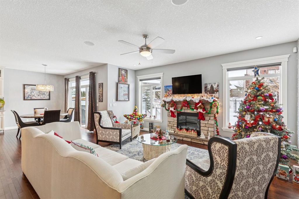 The main level also offers a spacious family room with a stone-surround gas fireplace, a semi-formal dining room with French doors, a large front foyer, and durable tile flooring that carries through to the garage entry. Enjoy Sonos built-in audio on every level and a total of three fireplaces throughout the home.