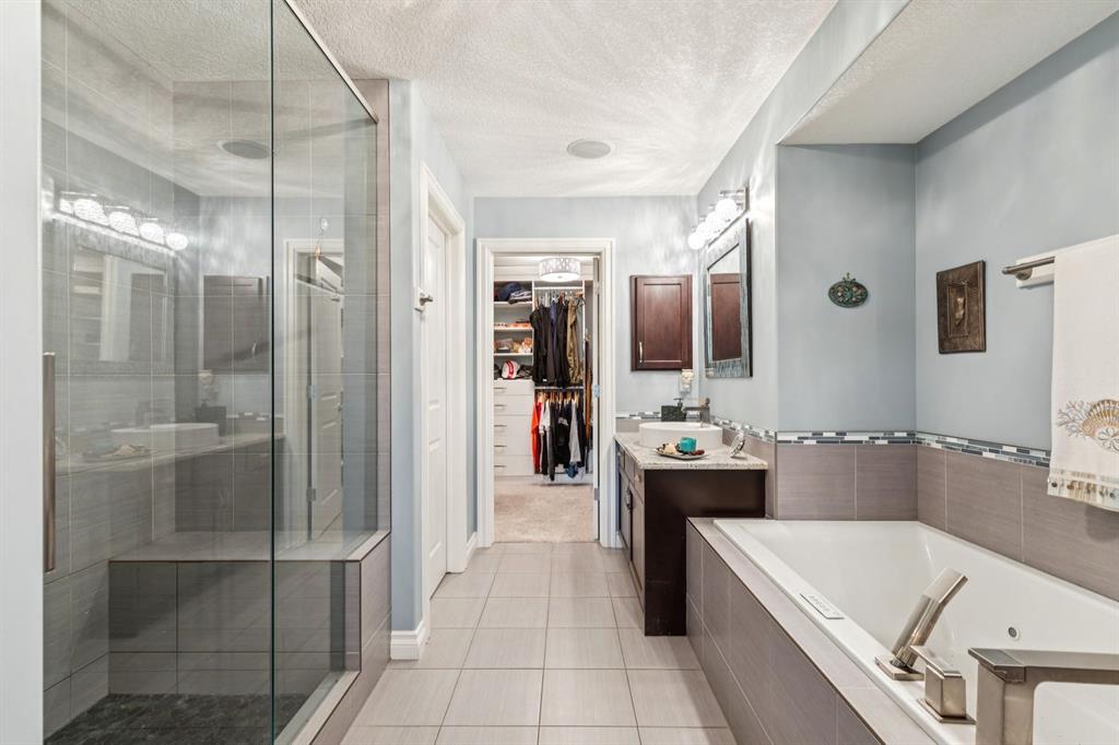 The primary suite is truly a retreat, highlighted by vaulted ceilings, a two-sided fireplace, and generous natural light. The ensuite includes dual sinks, an oversized glass shower, an air-jet soaker tub, and a private water closet. The showstopper, however, is the spectacular walk-in closet—truly a dream space for anyone who appreciates luxury organization and storage.