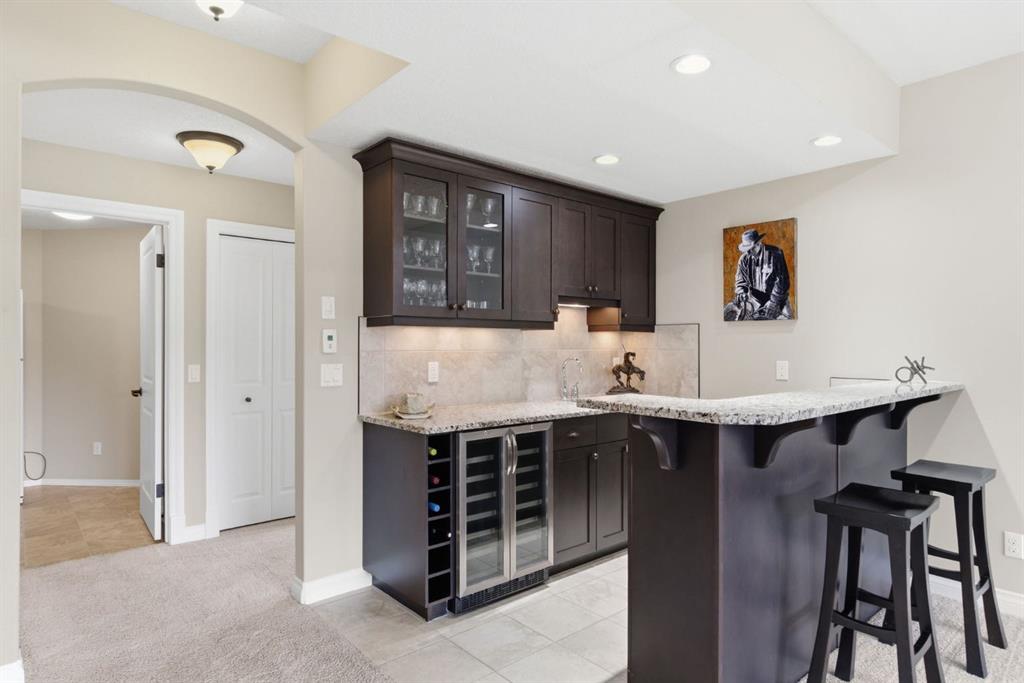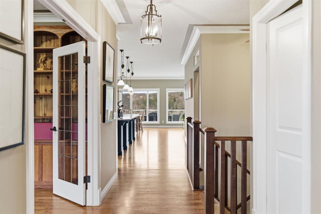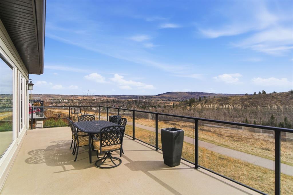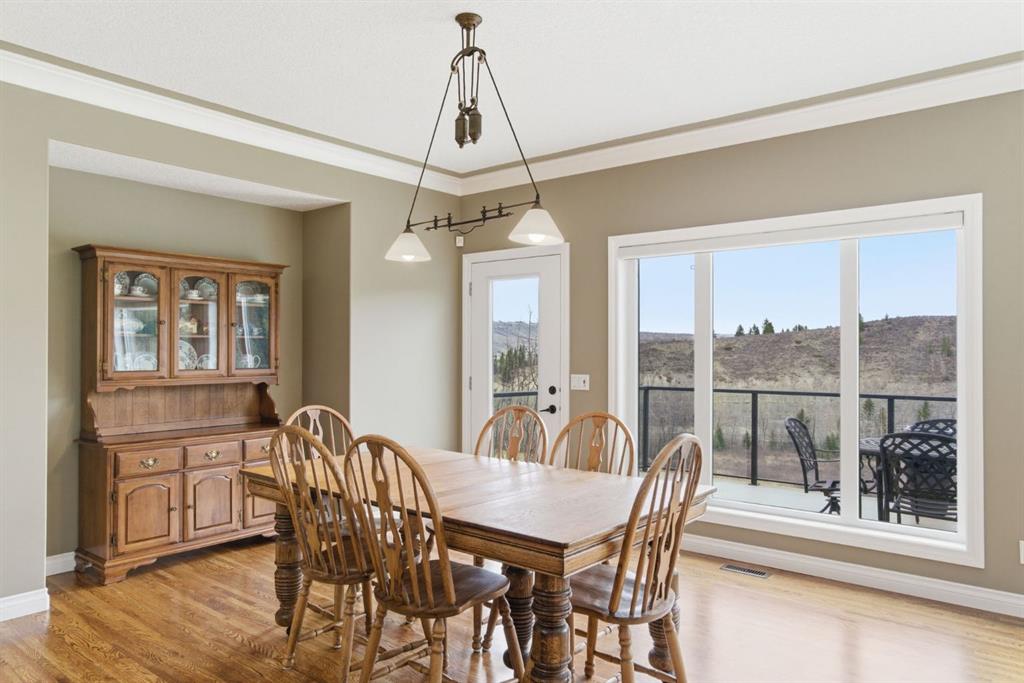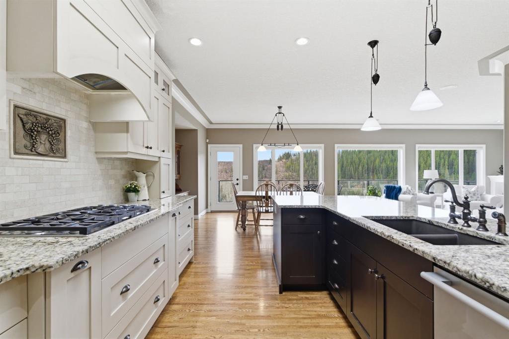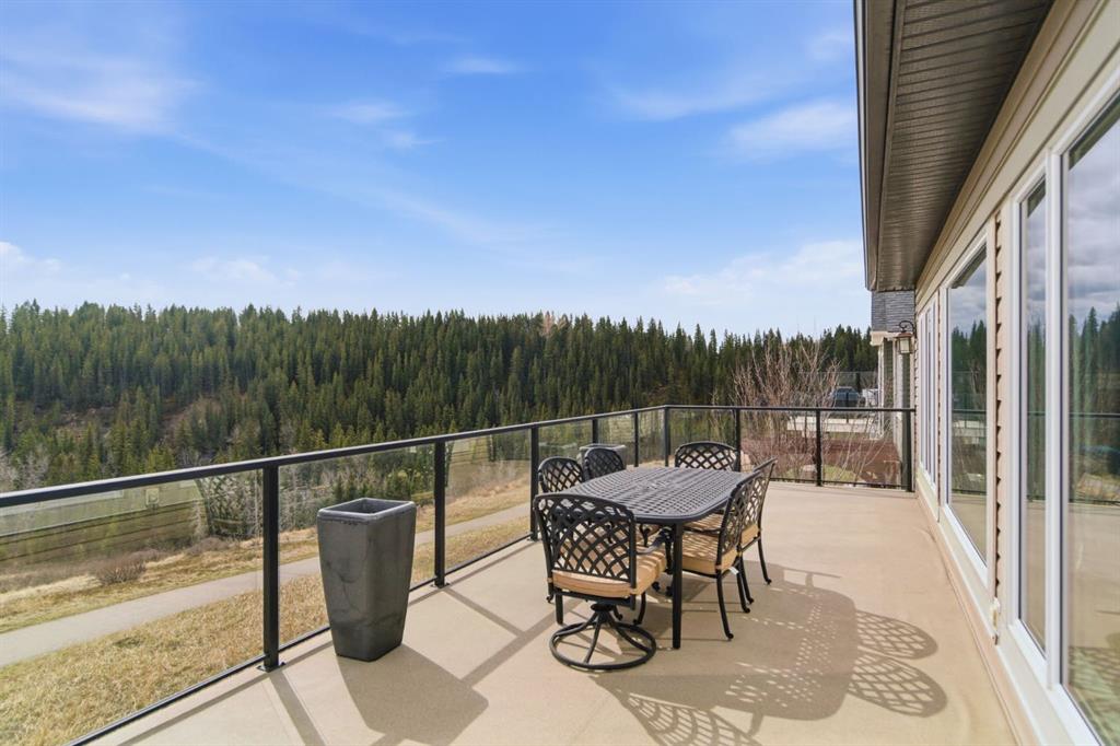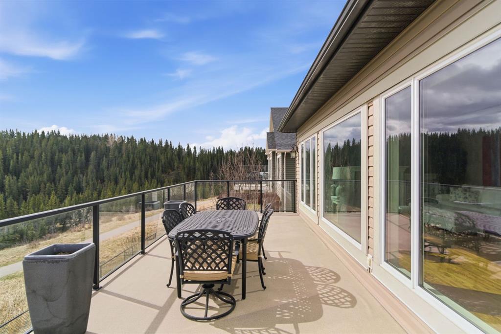Welcome to 135 Jumping Pound Terrace. Your invited to our open house this Saturday April 25th from 11 am to 2 PM to explore this beautiful Walk-out Bungalow which backs onto the Jumping Pound Ridge with the Creek in the Valley below. Imagine no neighbors behind. Wake up to the Sunny back deck with incredible views of the Valley and Cochrane beyond. This home features 2,795 sq ft of living space with and office near the front entrance. The Gourmet kitchen is a must see with Exquisite white tall cabinets including glass front uppers, custom hood fan, gas cook top, wall oven, lots of drawers, massive flat granite island, and corner pantry. The dining room and living room over look the large deck and valley views with the living room featuring the gas fireplace and wall units built in. The crown molding and cut painted ceilings and gleaming hardwood floors showcase the attention to detail in this property. The Primary bedroom is on the main floor and has the large ensuite with a tower cabinet between the two sinks, large soaker tub, and well appointed tile and glass shower. large walk in closet is a plus. The large walk in closet with counter and sink is located so plumbing and wiring could be brought up to install laundry on the main level. The lower level is fully finished with two more bedroom, a large family room and full wet bar with granite counters and wine cooler. The infloor heat makes this a cozy basement all year long. The Laundry room is large and also has a full refrigerator and freezer. Step out of the walk out basement to the large full length patio featuring river rock clad pillars, Views of the Valley and a walking path up the side of the house to the garage. Check out the triple car heated garage. Central Air Conditioning, Ceiling Speakers, Powered Blinds in the living room and lower family room. Build by Kingsmith homes. Call to book a personal viewing before its gone.