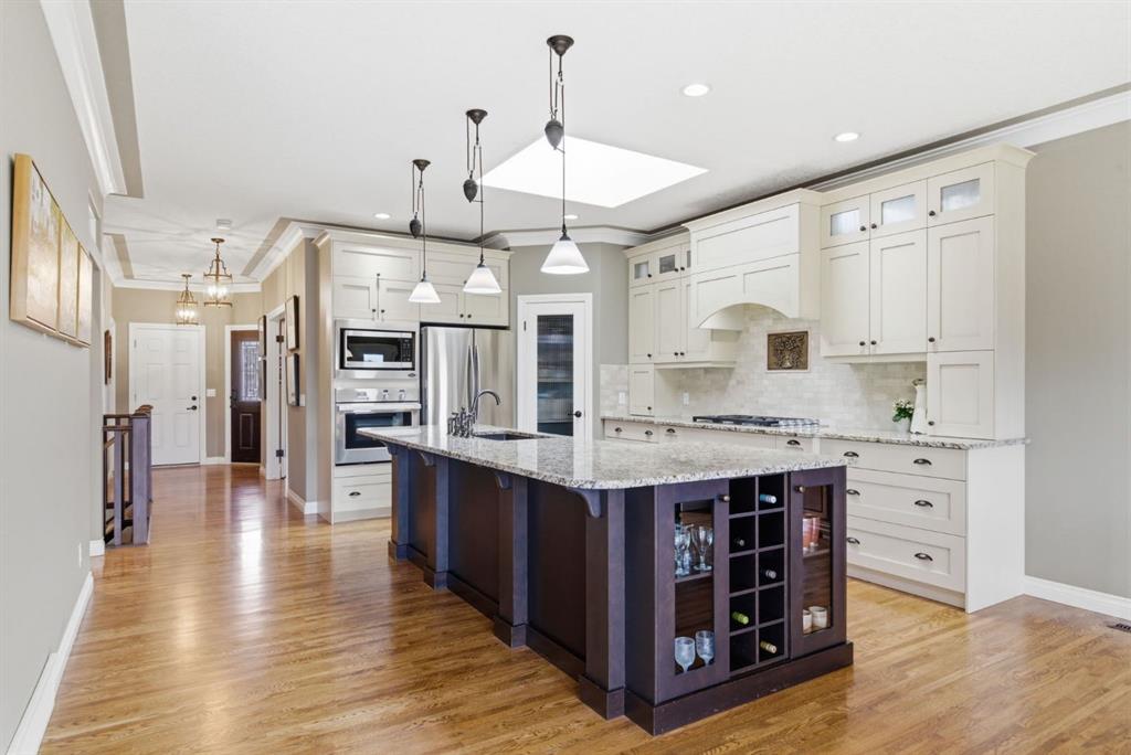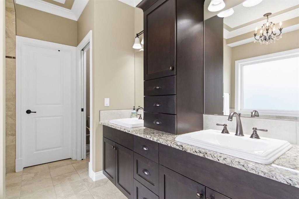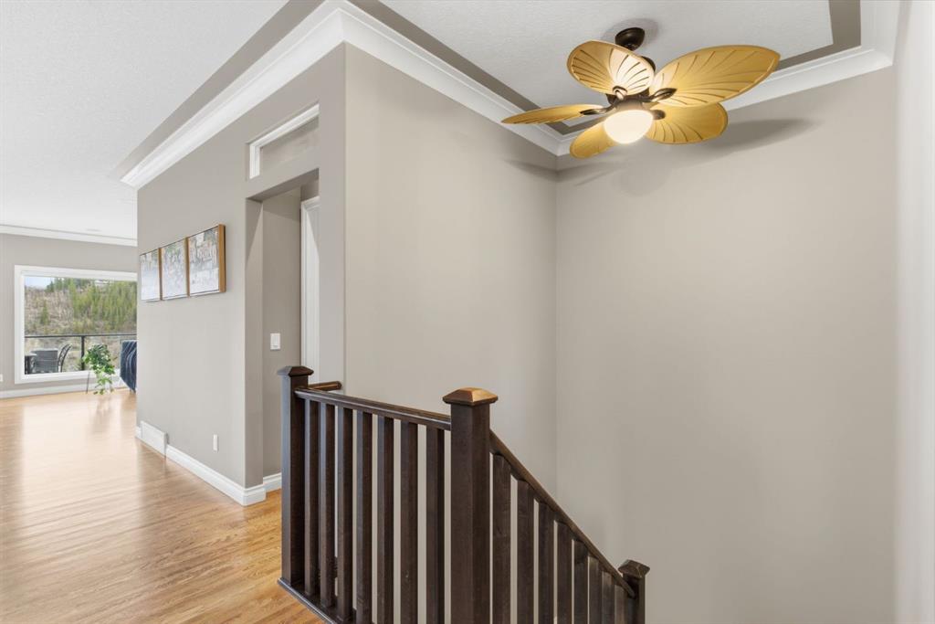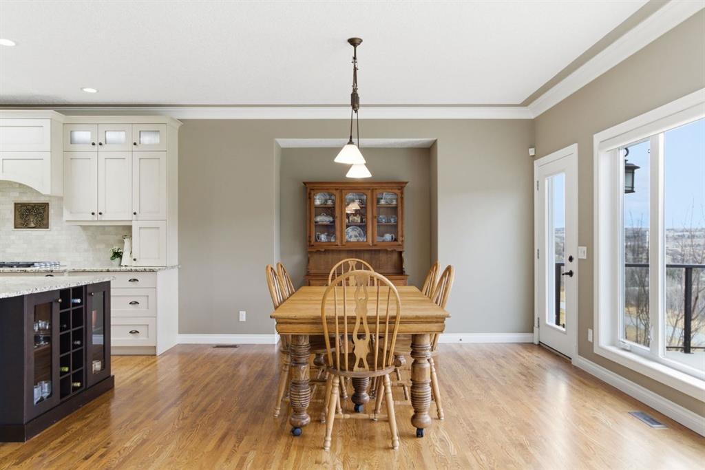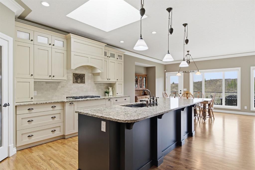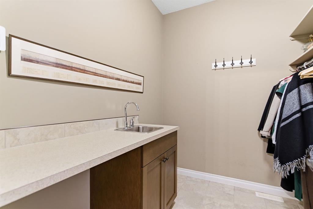 Welcome to 135 Jumping Pound Terrace. Your invited to our open house this Saturday April 25th from 11 am to 2 PM to explore this beautiful Walk-out Bungalow which backs onto the Jumping Pound Ridge with the Creek in the Valley below. Imagine no neighbors behind. Wake up to the Sunny back deck with incredible views of the Valley and Cochrane beyond. This home features 2,795 sq ft of living space with and office near the front entrance. The Gourmet kitchen is a must see with Exquisite white tall cabinets including glass front uppers, custom hood fan, gas cook top, wall oven, lots of drawers, massive flat granite island, and corner pantry. The dining room and living room over look the large deck and valley views with the living room featuring the gas fireplace and wall units built in. The crown molding and cut painted ceilings and gleaming hardwood floors showcase the attention to detail in this property. The Primary bedroom is on the main floor and has the large ensuite with a tower cabinet between the two sinks, large soaker tub, and well appointed tile and glass shower. large walk in closet is a plus. The large walk in closet with counter and sink is located so plumbing and wiring could be brought up to install laundry on the main level. The lower level is fully finished with two more bedroom, a large family room and full wet bar with granite counters and wine cooler. The infloor heat makes this a cozy basement all year long. The Laundry room is large and also has a full refrigerator and freezer. Step out of the walk out basement to the large full length patio featuring river rock clad pillars, Views of the Valley and a walking path up the side of the house to the garage. Check out the triple car heated garage. Central Air Conditioning, Ceiling Speakers, Powered Blinds in the living room and lower family room. Build by Kingsmith homes. Call to book a personal viewing before its gone.