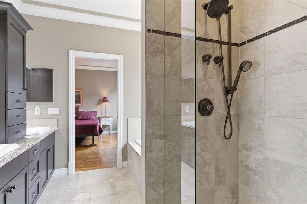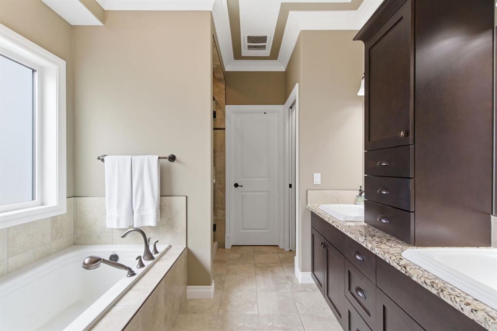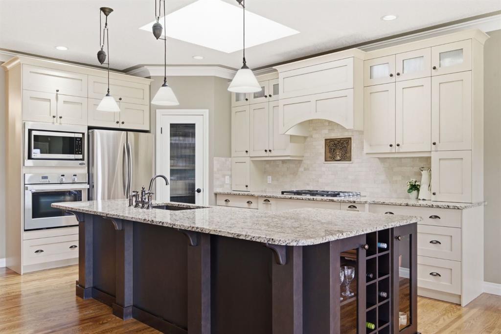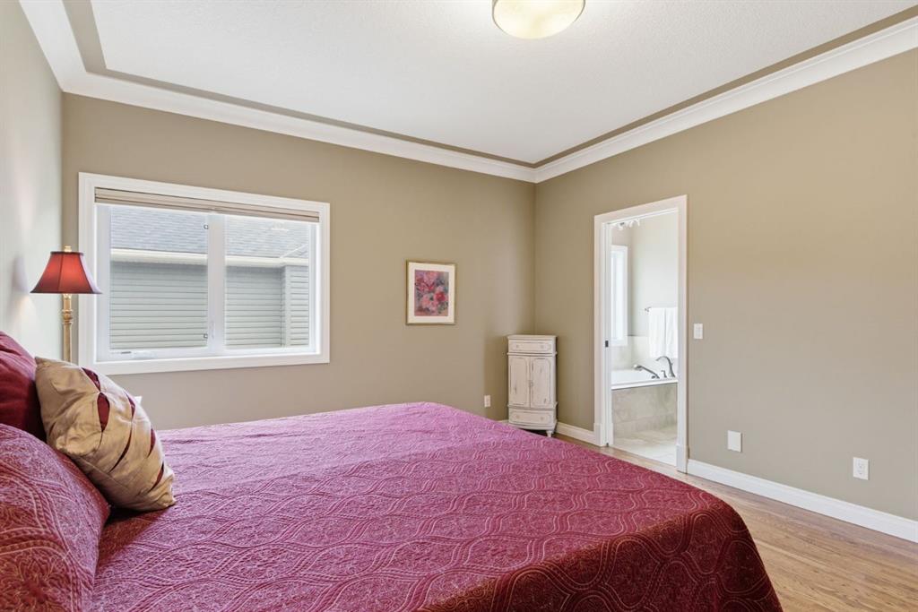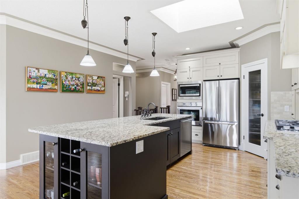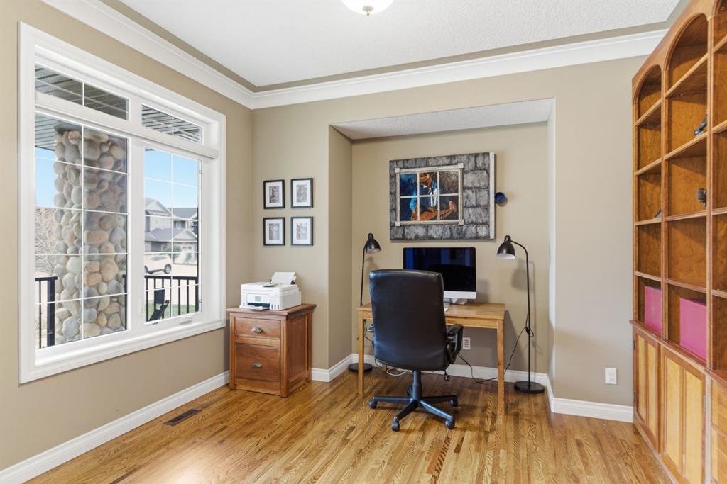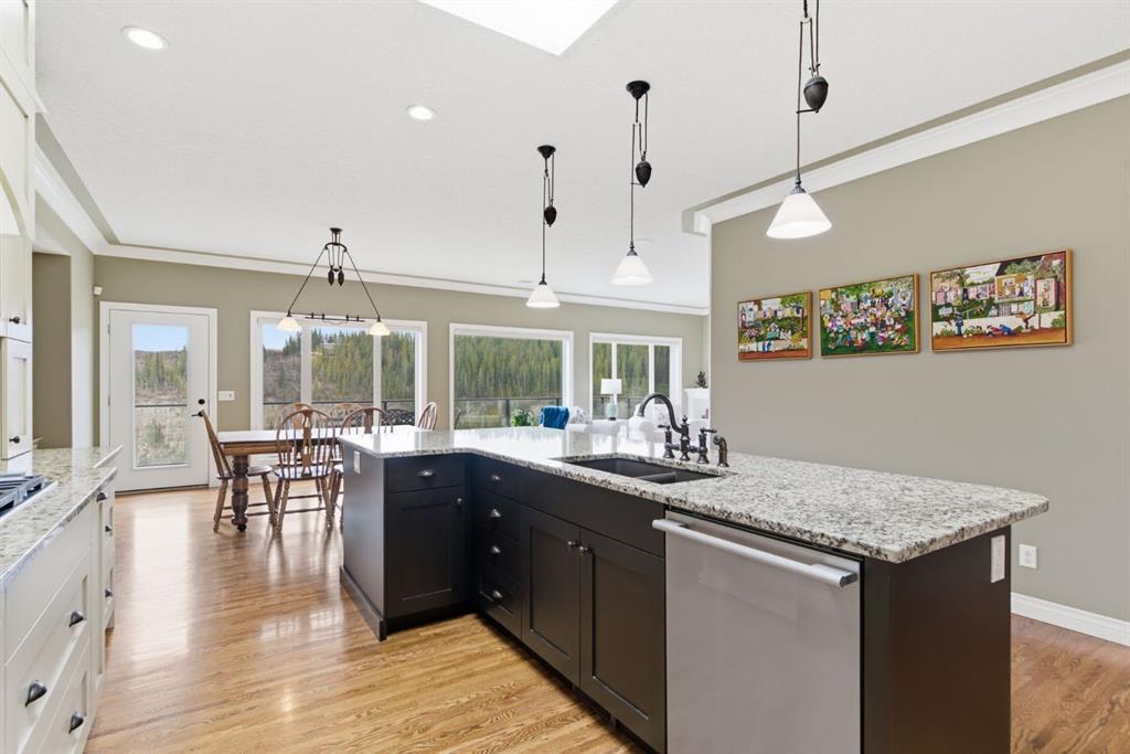 Welcome to 135 Jumping Pound Terrace. Your invited to our open house this Saturday April 25th from 11 am to 2 PM to explore this beautiful Walk-out Bungalow which backs onto the Jumping Pound Ridge with the Creek in the Valley below. Imagine no neighbors behind. Wake up to the Sunny back deck with incredible views of the Valley and Cochrane beyond. This home features 2,795 sq ft of living space with and office near the front entrance. The Gourmet kitchen is a must see with Exquisite white tall cabinets including glass front uppers, custom hood fan, gas cook top, wall oven, lots of drawers, massive flat granite island, and corner pantry. The dining room and living room over look the large deck and valley views with the living room featuring the gas fireplace and wall units built in. The crown molding and cut painted ceilings and gleaming hardwood floors showcase the attention to detail in this property. The Primary bedroom is on the main floor and has the large ensuite with a tower cabinet between the two sinks, large soaker tub, and well appointed tile and glass shower. large walk in closet is a plus. The large walk in closet with counter and sink is located so plumbing and wiring could be brought up to install laundry on the main level. The lower level is fully finished with two more bedroom, a large family room and full wet bar with granite counters and wine cooler. The infloor heat makes this a cozy basement all year long. The Laundry room is large and also has a full refrigerator and freezer. Step out of the walk out basement to the large full length patio featuring river rock clad pillars, Views of the Valley and a walking path up the side of the house to the garage. Check out the triple car heated garage. Central Air Conditioning, Ceiling Speakers, Powered Blinds in the living room and lower family room. Build by Kingsmith homes. Call to book a personal viewing before its gone.