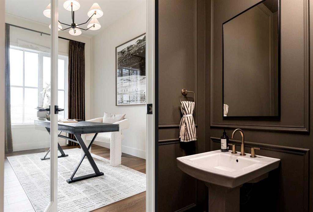 The designer kitchen comes complete with soft-close cabinetry, a custom hood fan surround, pot-and-pan drawers, a full-height backsplash, your choice of Classic Series quartz or granite countertops, and a premium KitchenAid appliance package. A large walk-through pantry connects to the mudroom with the option to upgrade to a spice kitchen if desired. A private main-floor den is perfect for a home office, music room or playroom, or could be upgraded to a main floor bedroom with full bathroom to allow for multi-generational living.