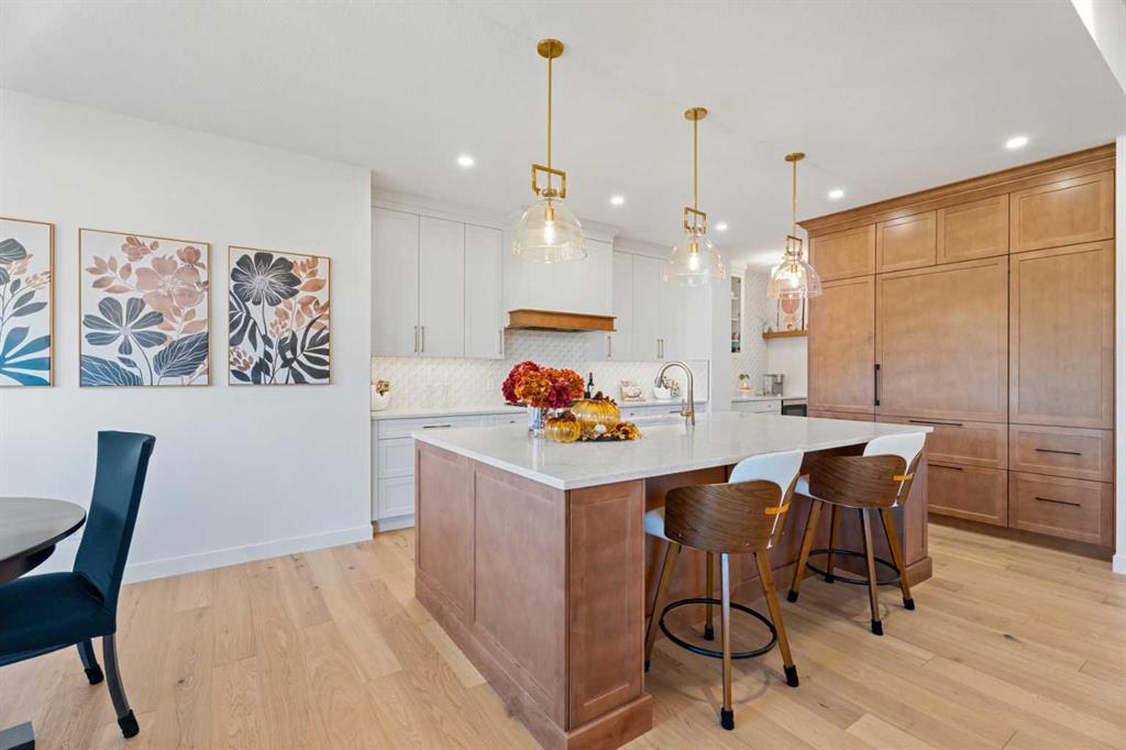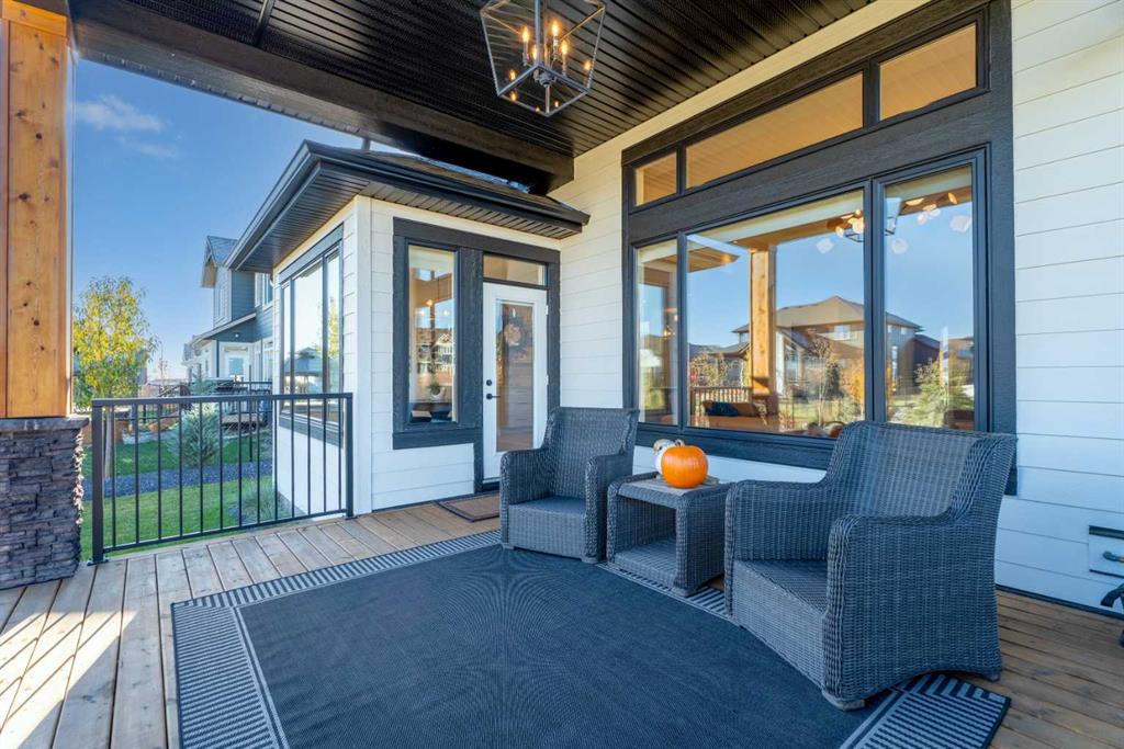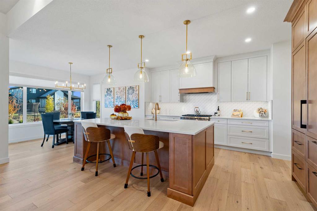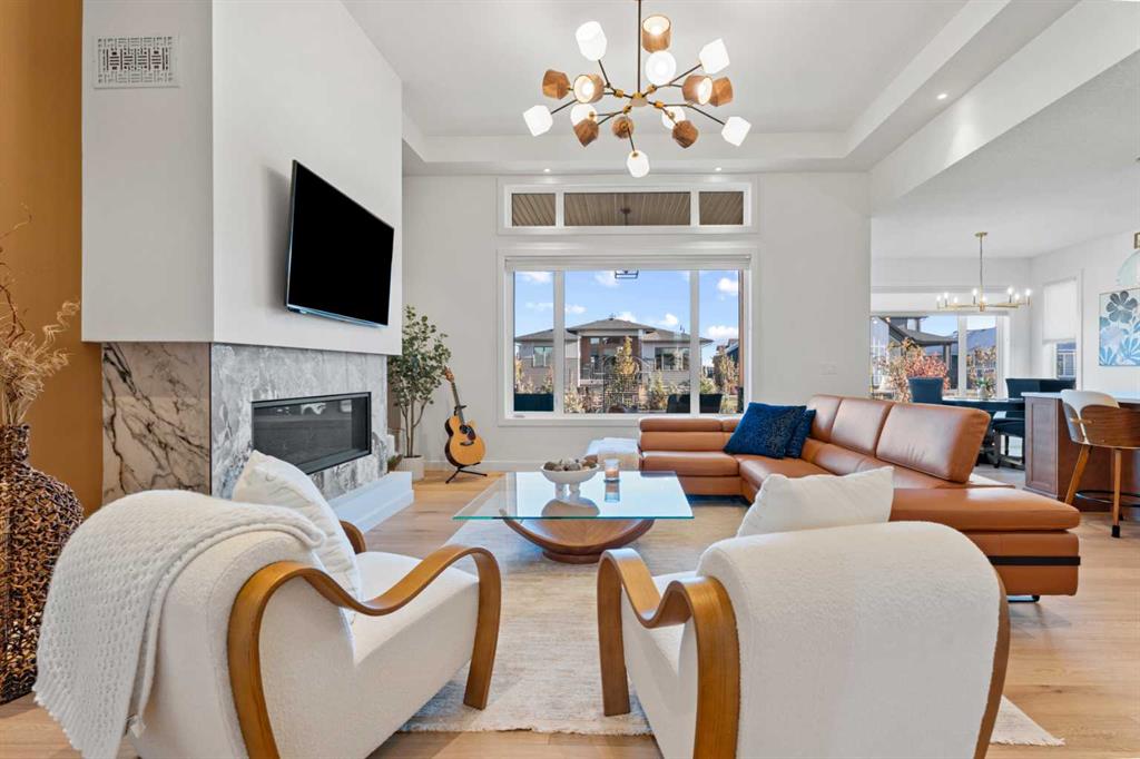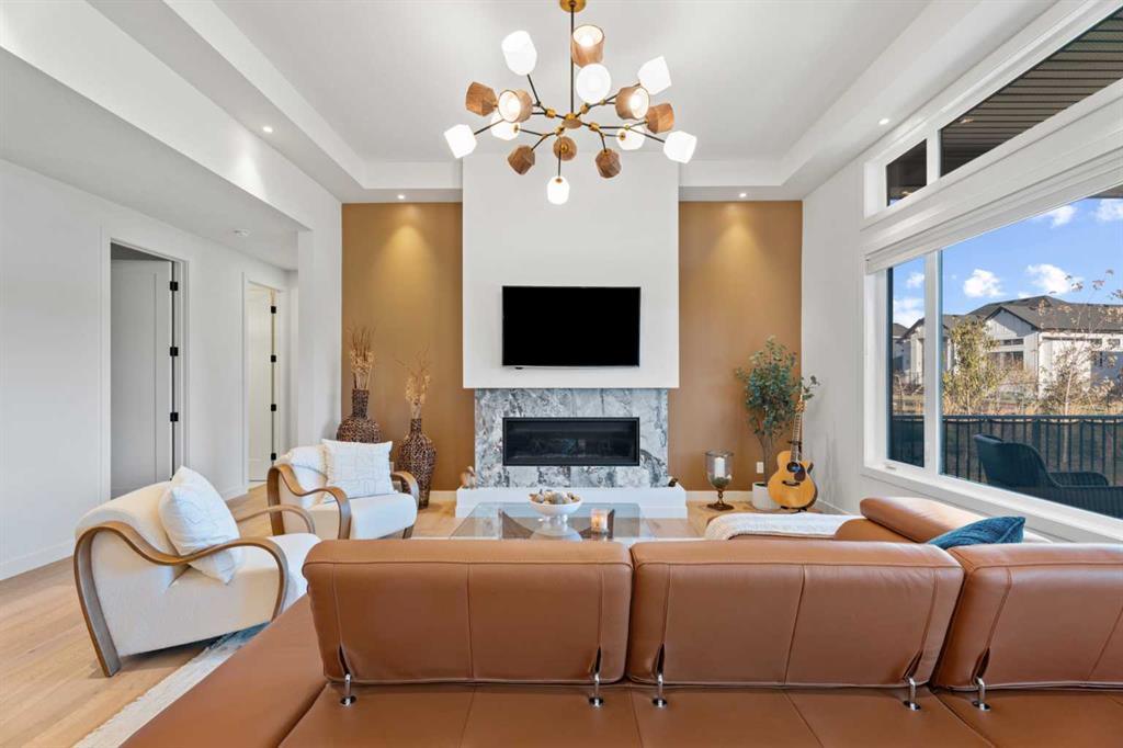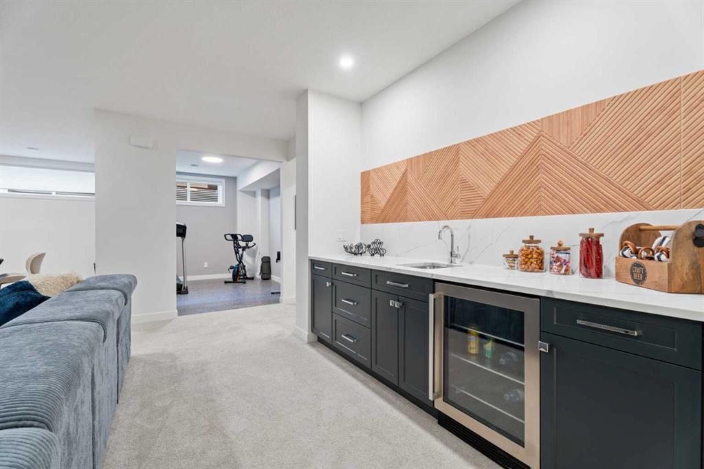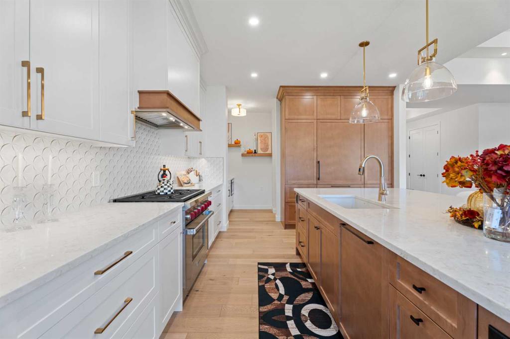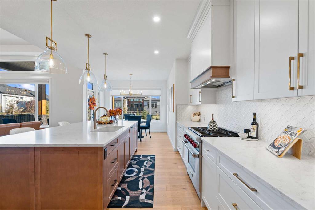Welcome to this custom-crafted just over 1,800 sq ft bungalow showcasing exceptional design and luxurious upgrades throughout. From the moment you arrive, the home’s custom wood beams, black-trimmed windows, and Gemstone exterior lighting set an impressive tone. Step inside to soaring 11 ft ceilings, engineered wide-plank hardwood floors, and 8 ft doors with sleek black hardware. The open-concept great room features a Napoleon 55" linear gas fireplace, with a heat management system, framed by panoramic media walls and designer wood-and-glass lighting. The gourmet kitchen is a chef’s dream—complete with a Sub-Zero refrigerator, Wolf 6-burner gas range, Miele dishwasher, Falmec Pro hood, and a stunning 9×5 ft quartz island with custom cabinetry and champagne bronze accents. The butler’s pantry offers quartz counters, built-in drawer microwave, sink, and additional built-ins. The primary suite impresses with blackout channelled system Hunter Douglas blinds, and a spa-inspired ensuite featuring a fully tiled shower with dual heads (including rainfall), freestanding tub, heated floors covered with 24 X 24 Himalayan rock salt tiles, and a custom walk-in wardrobe. A fully finished basement extends the living space with a custom-built media centre, a wet bar that includes a beverage fridge and dressed in a quartz counter and back splash, a gym area with luxury vinyl flooring, 3 bedrooms, and an additional full bath. Outdoors, enjoy a covered deck with stone / cedar-clad post, gas line, aggregate patio, and professionally landscaped yard ($70K investment) with 28 trees, boulders, and a Wi-Fi–controlled irrigation system. The oversized driveway allows RV parking with full access into the almost 800sq ft triple garage, which includes a heater rough-in, floor drain, hot/cold taps, and dual Wi-Fi openers with cameras. Additional highlights include EcoBee Smart thermostat, air conditioning, tankless water heater, water softener, radon mitigation system, and B-Hyve smart irrigation controls. A rare blend of craftsmanship, technology, and luxury—this home redefines bungalow living in Cimarron.