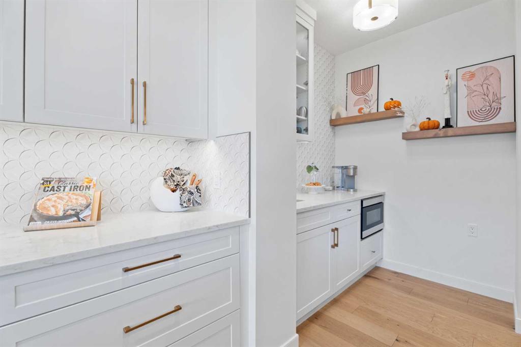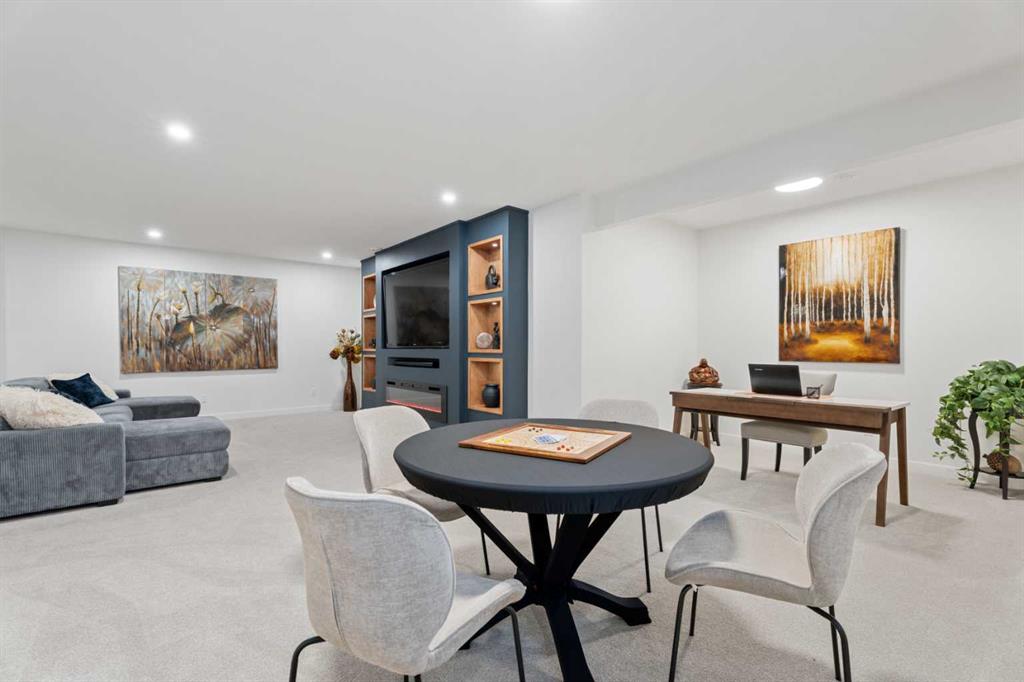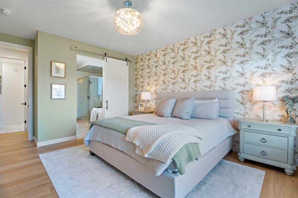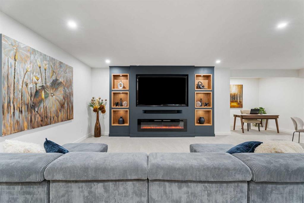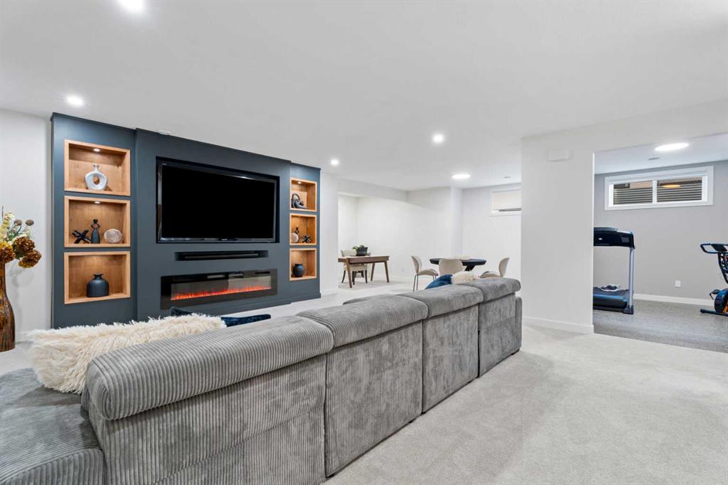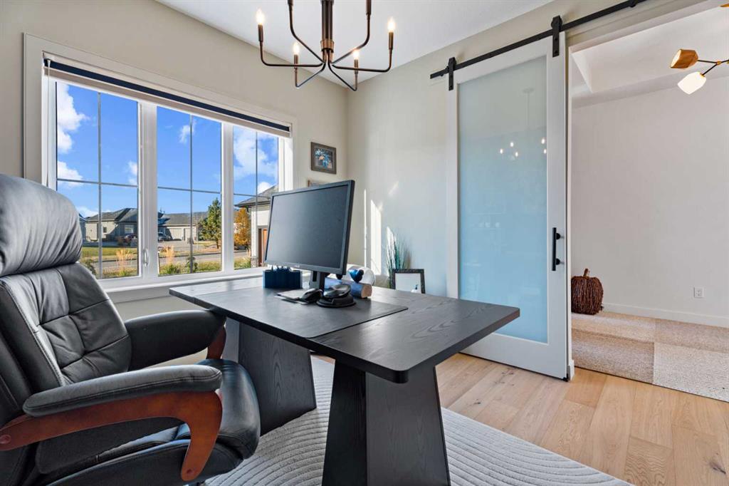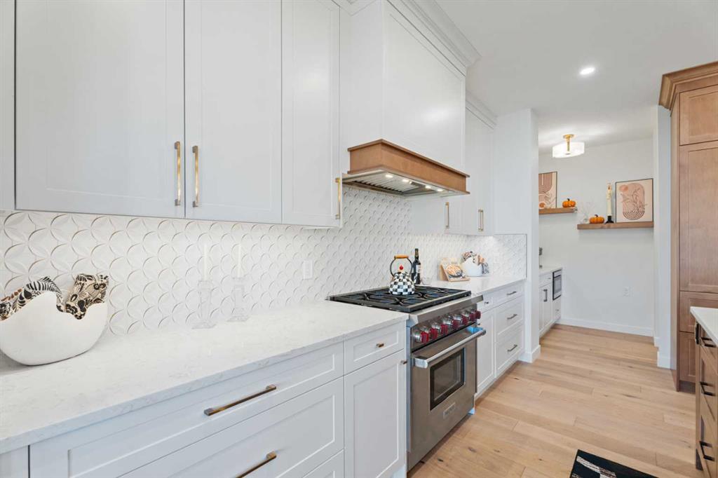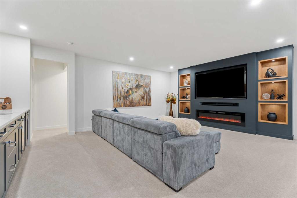 Welcome to this custom-crafted just over 1,800 sq ft bungalow showcasing exceptional design and luxurious upgrades throughout. From the moment you arrive, the home’s custom wood beams, black-trimmed windows, and Gemstone exterior lighting set an impressive tone. Step inside to soaring 11 ft ceilings, engineered wide-plank hardwood floors, and 8 ft doors with sleek black hardware. The open-concept great room features a Napoleon 55" linear gas fireplace, with a heat management system, framed by panoramic media walls and designer wood-and-glass lighting. The gourmet kitchen is a chef’s dream—complete with a Sub-Zero refrigerator, Wolf 6-burner gas range, Miele dishwasher, Falmec Pro hood, and a stunning 9×5 ft quartz island with custom cabinetry and champagne bronze accents. The butler’s pantry offers quartz counters, built-in drawer microwave, sink, and additional built-ins. The primary suite impresses with blackout channelled system Hunter Douglas blinds, and a spa-inspired ensuite featuring a fully tiled shower with dual heads (including rainfall), freestanding tub, heated floors covered with 24 X 24 Himalayan rock salt tiles, and a custom walk-in wardrobe. A fully finished basement extends the living space with a custom-built media centre, a wet bar that includes a beverage fridge and dressed in a quartz counter and back splash, a gym area with luxury vinyl flooring, 3 bedrooms, and an additional full bath. Outdoors, enjoy a covered deck with stone / cedar-clad post, gas line, aggregate patio, and professionally landscaped yard ($70K investment) with 28 trees, boulders, and a Wi-Fi–controlled irrigation system. The oversized driveway allows RV parking with full access into the almost 800sq ft triple garage, which includes a heater rough-in, floor drain, hot/cold taps, and dual Wi-Fi openers with cameras. Additional highlights include EcoBee Smart thermostat, air conditioning, tankless water heater, water softener, radon mitigation system, and B-Hyve smart irrigation controls. A rare blend of craftsmanship, technology, and luxury—this home redefines bungalow living in Cimarron.