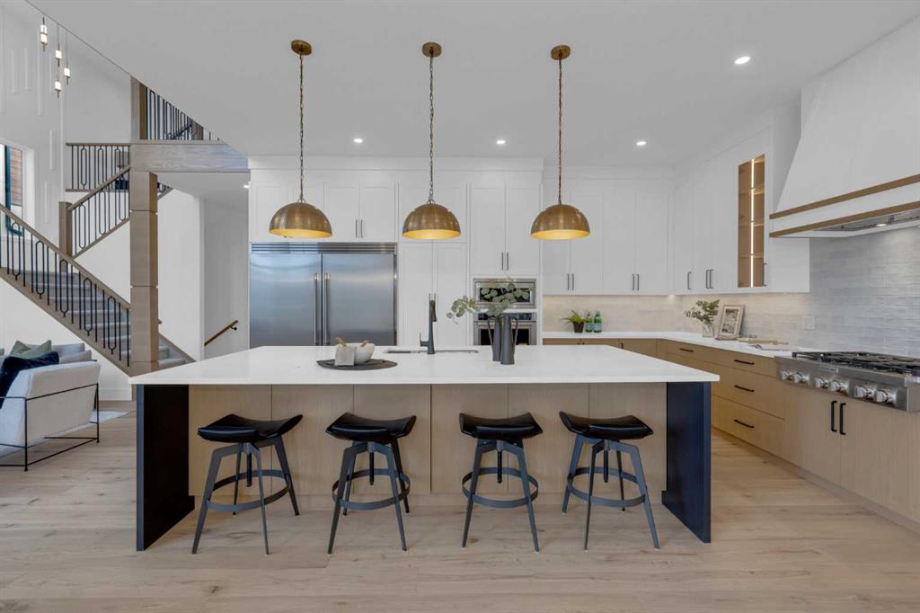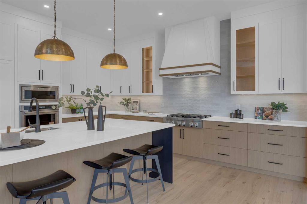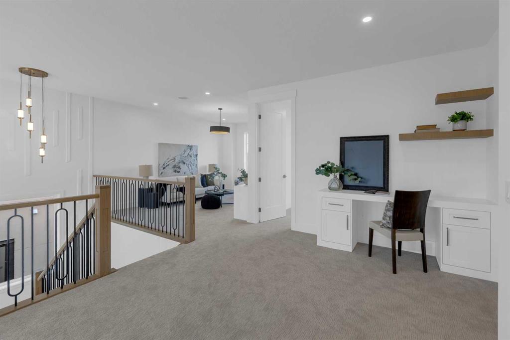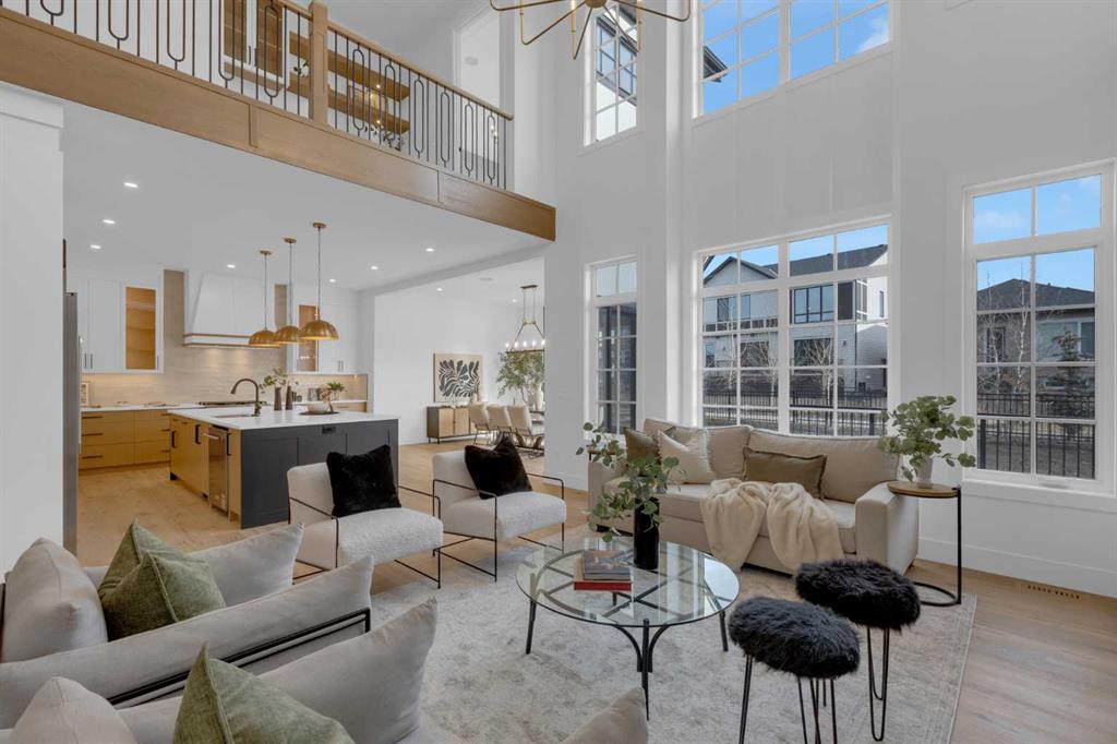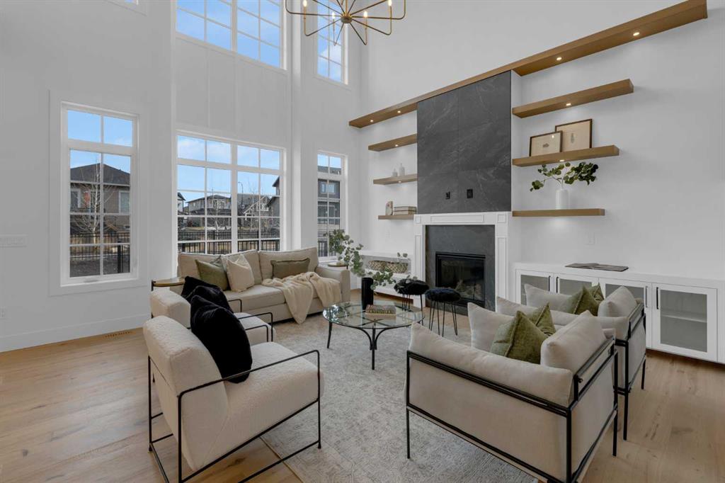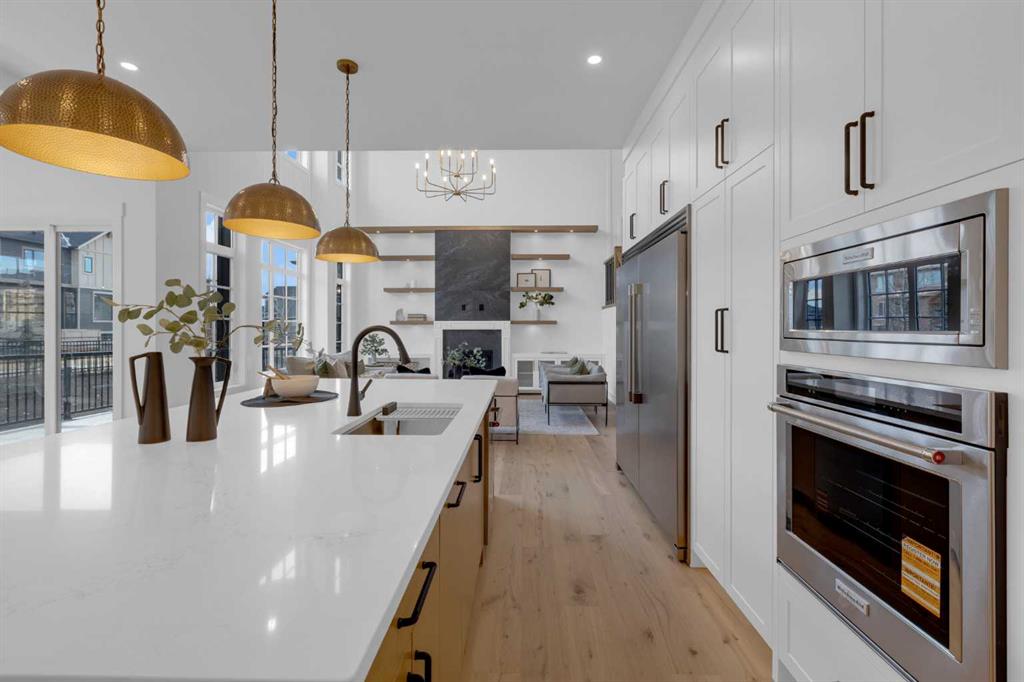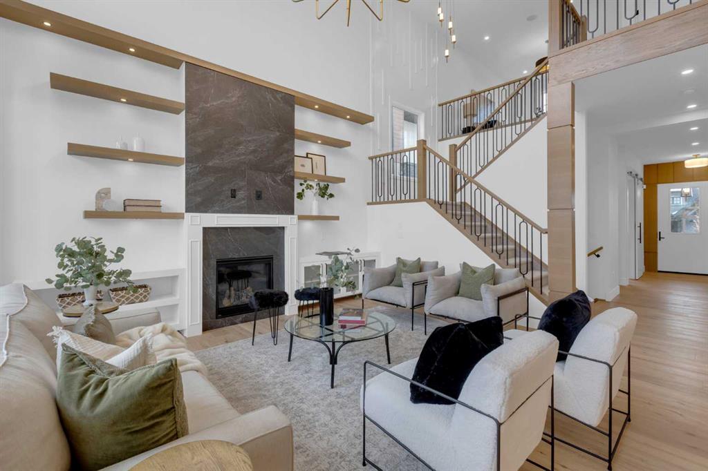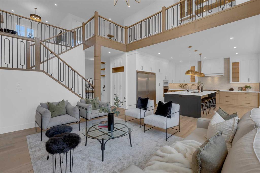The main floor features 10' ceilings and engineered hardwood throughout, creating a bright and upscale feel. You will find a private front office, a spacious family room with built-in shelving, a cozy fireplace, and an impressive open-to-above design. An elegant dining area that opens onto a large deck with a BBQ gas line—perfect for entertaining. The chef’s kitchen is truly a dream, offering built-in appliances, a large island, quartz countertops, and plenty of cabinetry. A convenient mudroom off the garage and a stylish powder room complete this level.